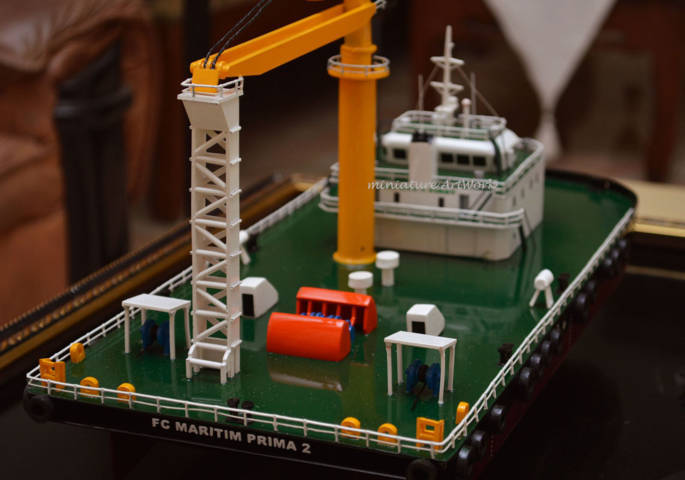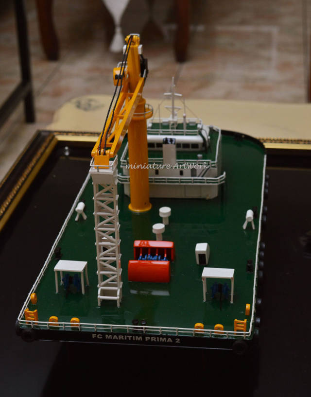 - Miniatur kapal tongkang FC Maritim 2 ini berbahan dasar fiber, acrylic, resin, artificial part, kayu sebagai tatakan serta dilengkapi pencahayaan