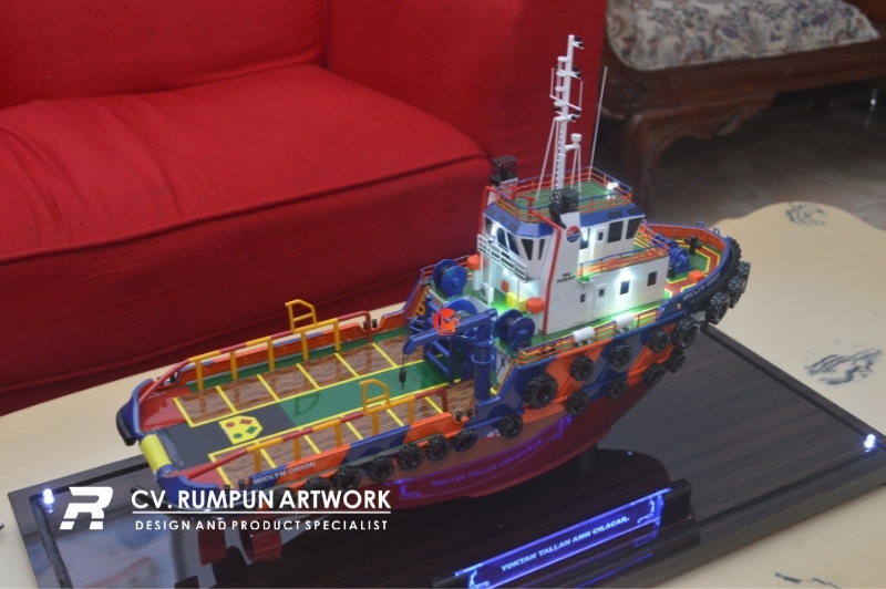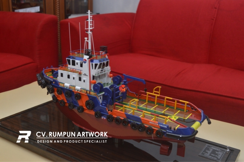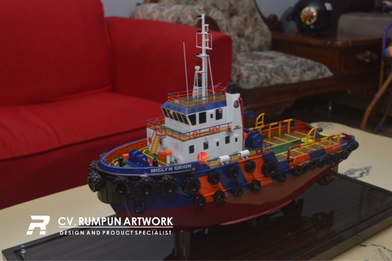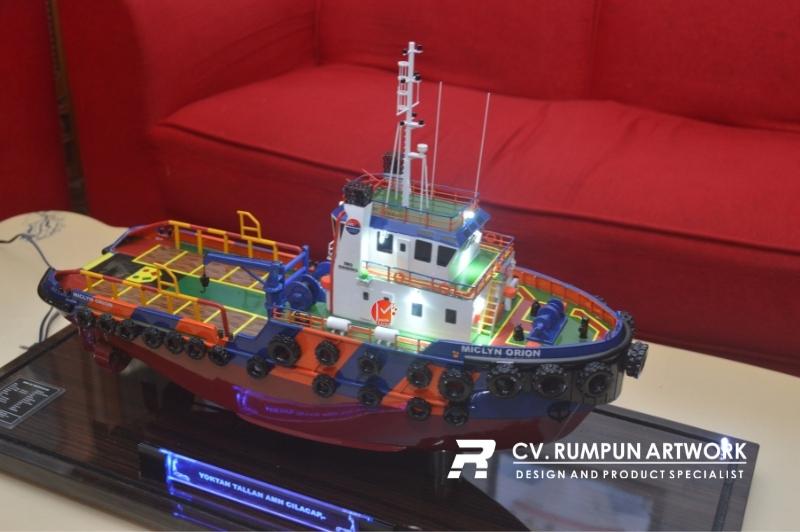 - Miniatur Kapal Tugboat Miclyn Orion ini berbahan dasar fiber, acrylic, resin, artificial part, kayu sebagai tatakan serta dilengkapi pencahayaan dengan lampu led ( optional ), kemudian kami bingkai dengan etalase kaca ( optional )