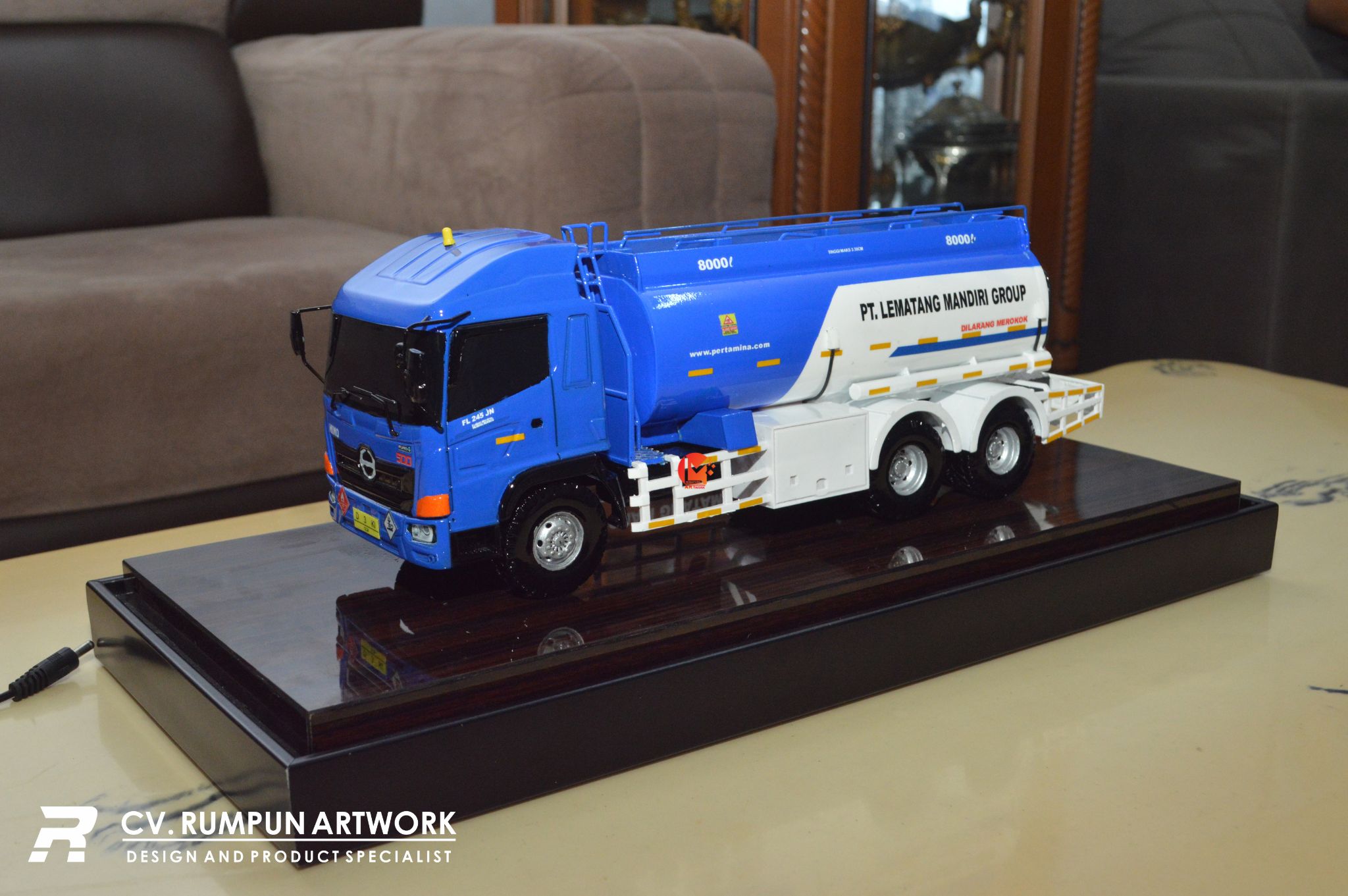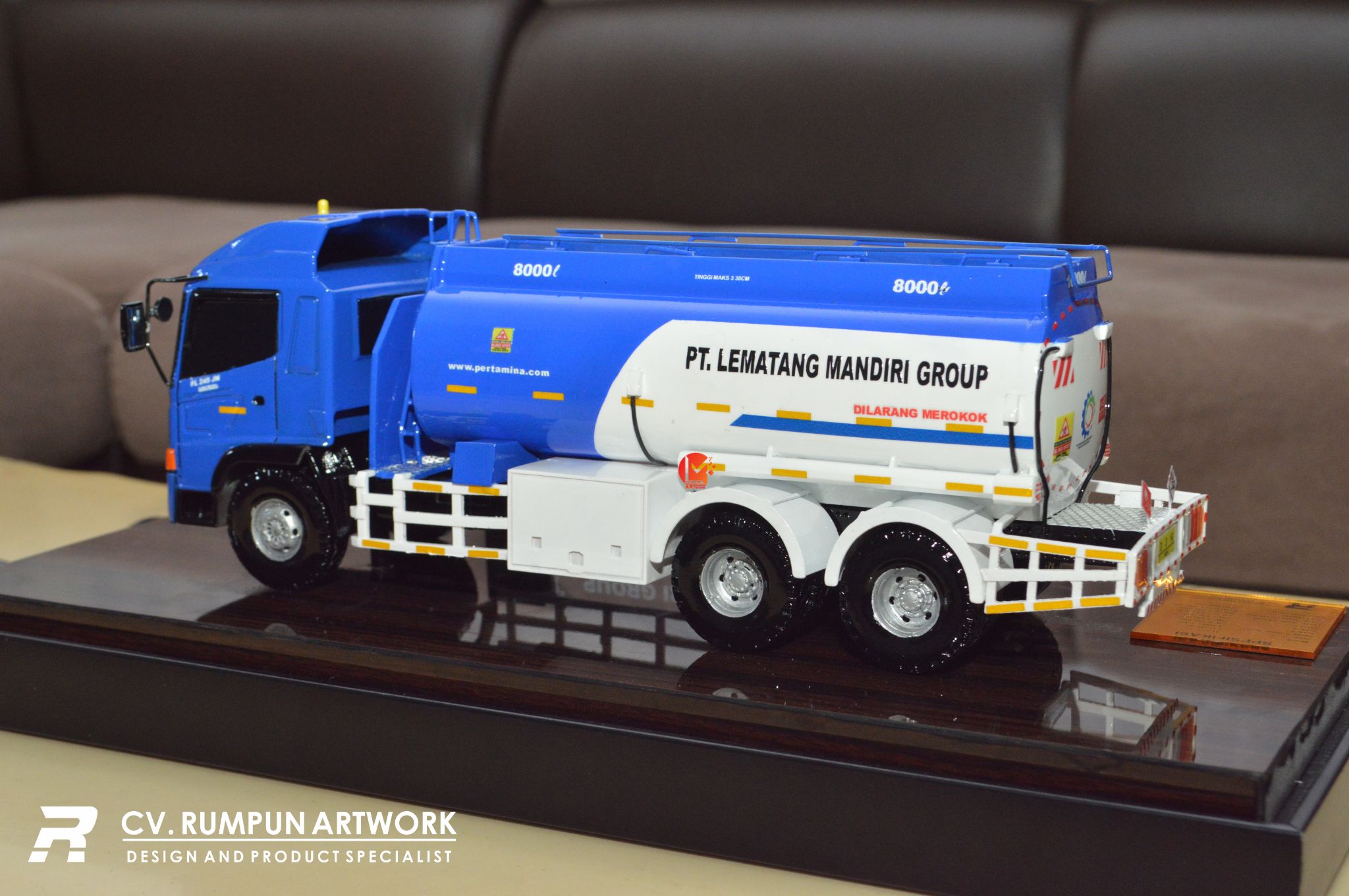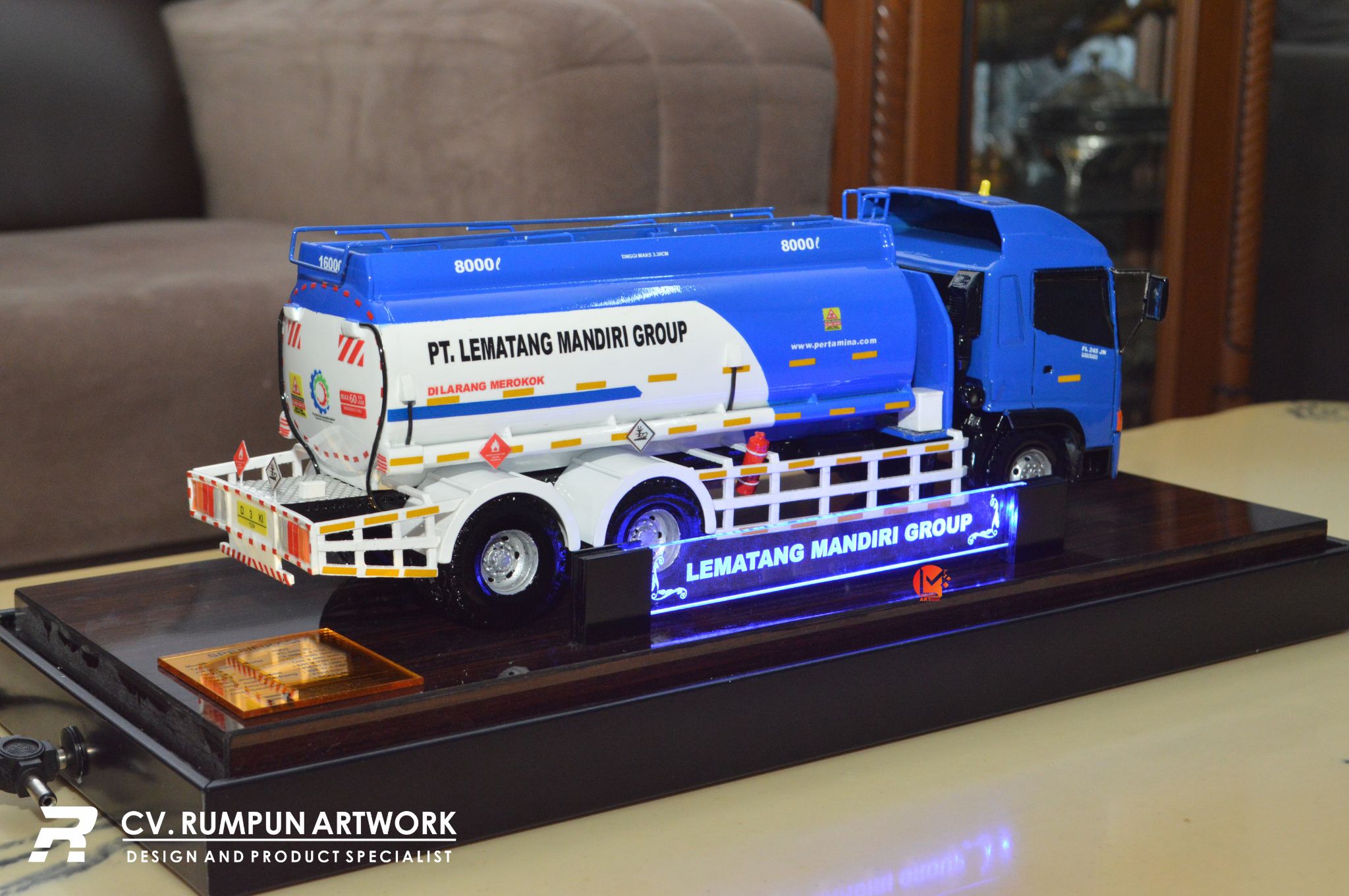 • Miniatur Truk Tanki PT Lematang Mandiri Group ini berbahan dasar fiber, akrilik, resin, bagian buatan, kayu sebagai tatakan serta dilengkapi pencahayaan dengan lampu led ( opsional ), kemudian kami bingkai dengan etalase kaca ( opsional ) dibuat dengan berbagai macam ukuran (30 cm, 40 cm, 70 cm, dan 100 cm)