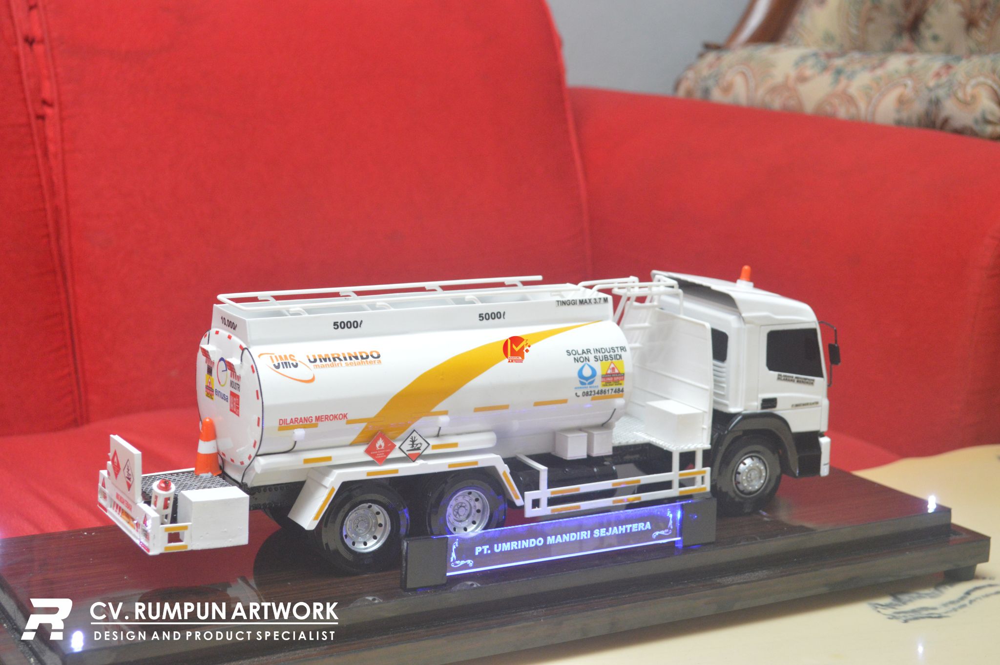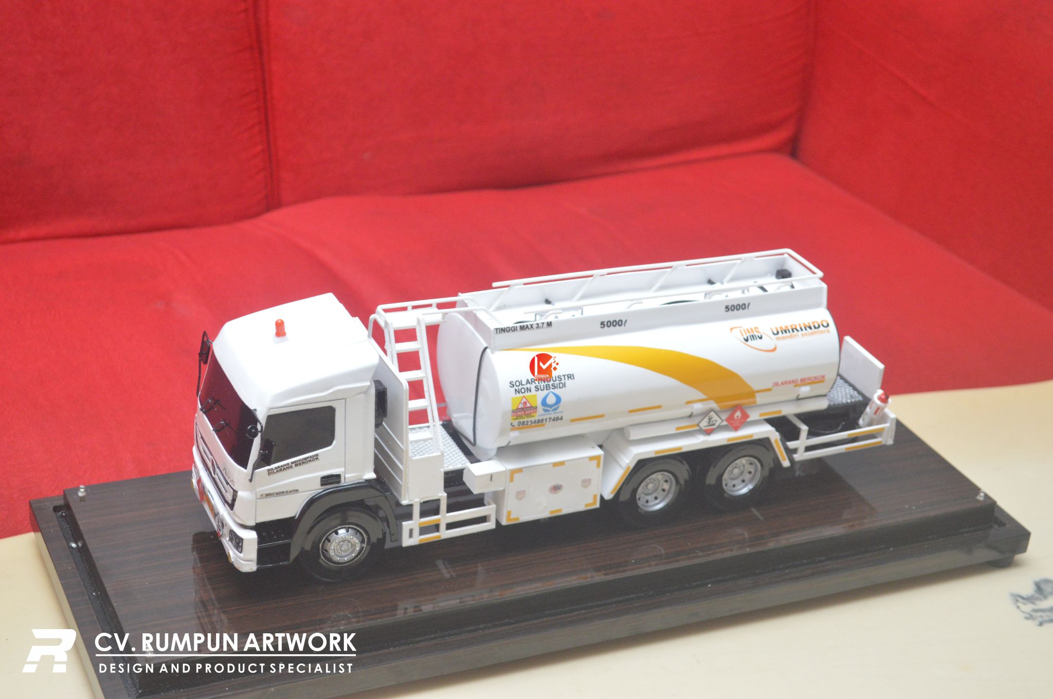 - Miniatur Truk Tanki PT Umrindo Mandiri Sejahtera ini berbahan dasar fiber, akrilik, resin, bagian buatan, kayu sebagai tatakan serta dilengkapi pencahayaan dengan lampu led ( opsional ), kemudian kami bingkai dengan etalase kaca ( opsional ) dibuat dengan berbagai macam ukuran (30 cm, 40 cm, 70 cm, dan 100 cm)