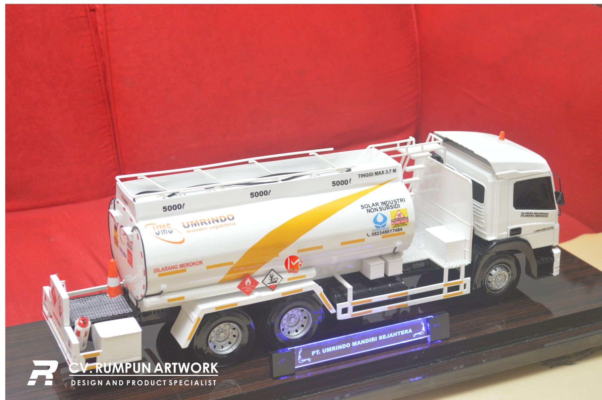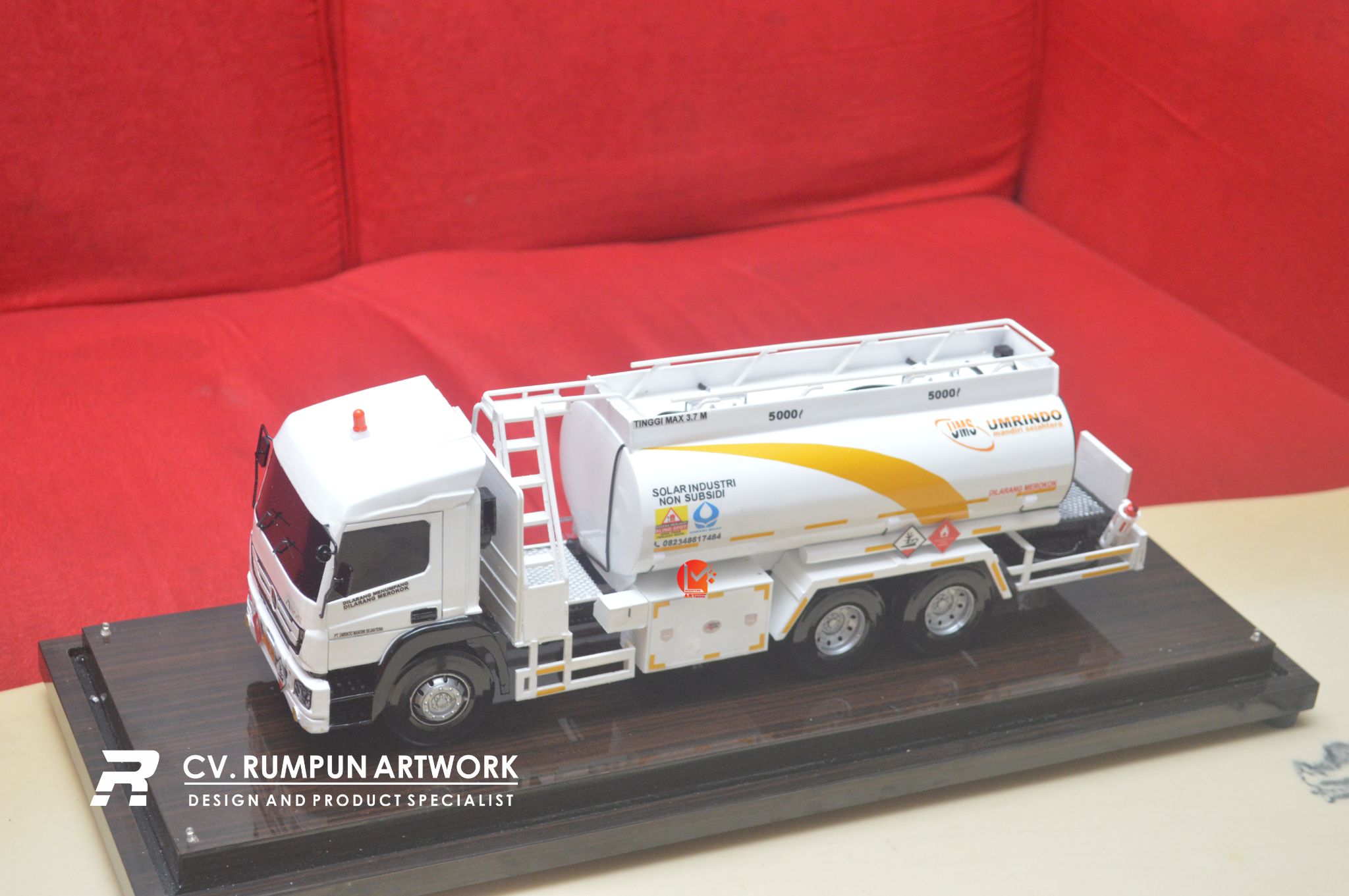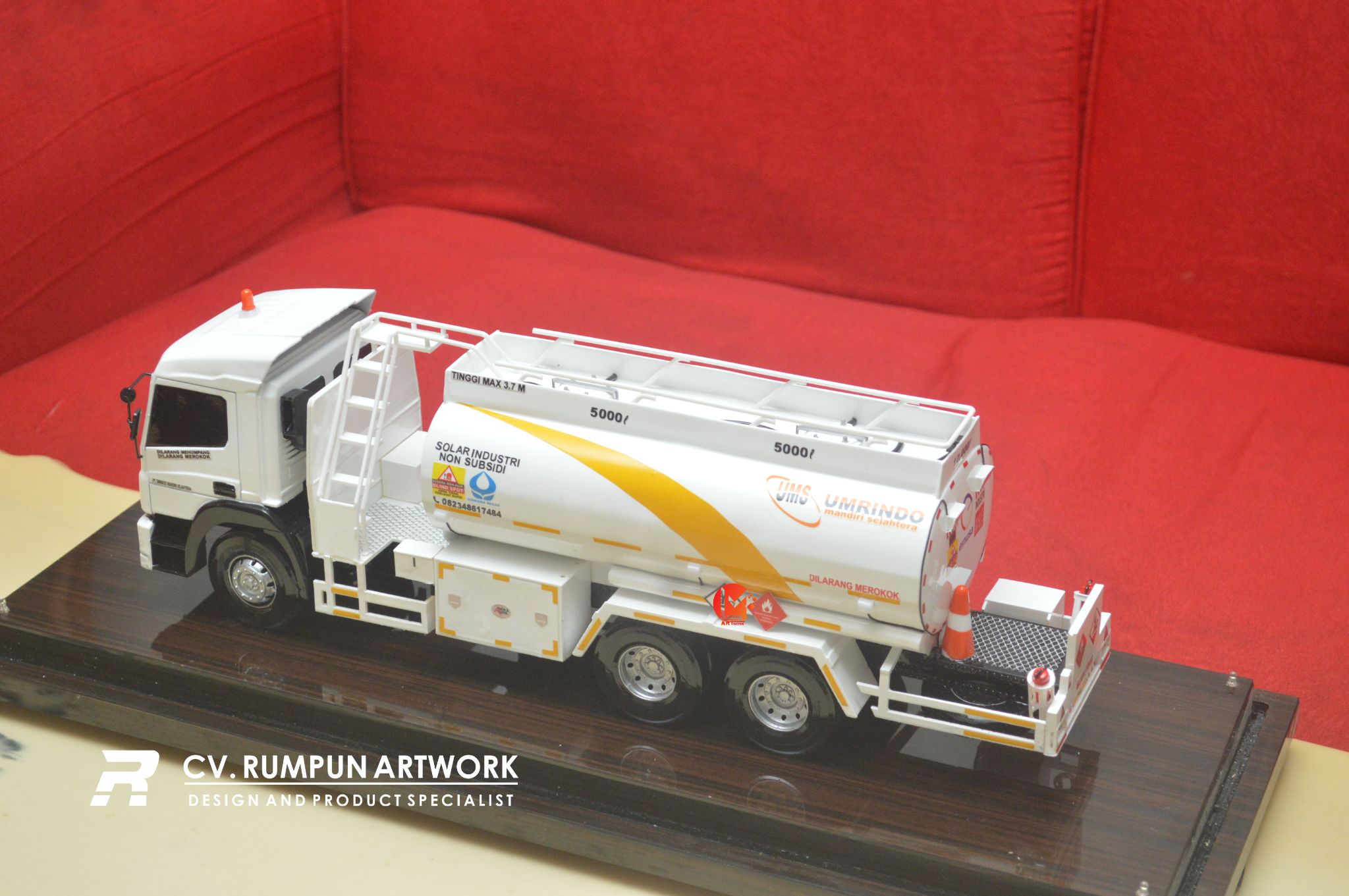 - Miniatur Mobil Truk Tanki ini berbahan dasar fiber, acrylic, resin, artificial part, kayu sebagai tatakan serta dilengkapi pencahayaan dengan lampu led ( optional ), kemudian kami bingkai dengan etalase kaca ( optional ) dibuat dengan berbagai macam ukuran (30 cm, 40 cm, 70 cm, dan 100 cm)