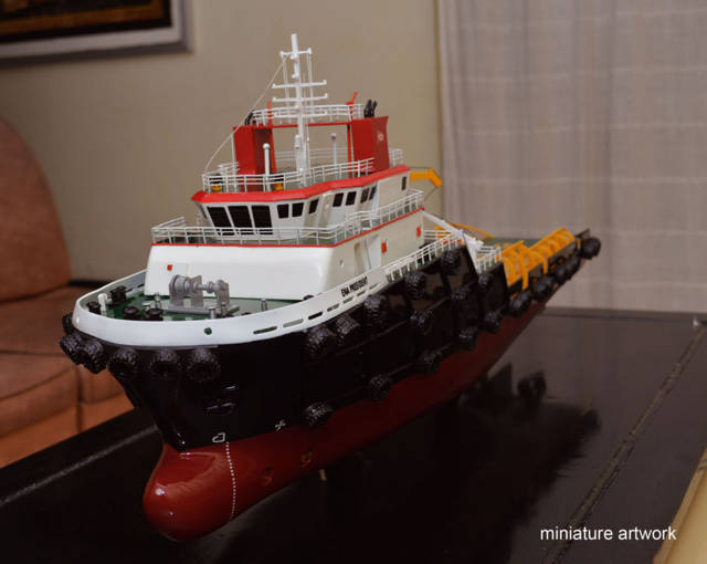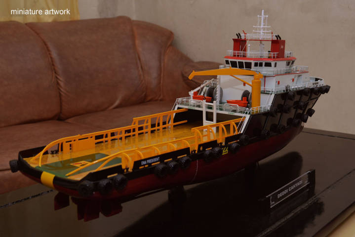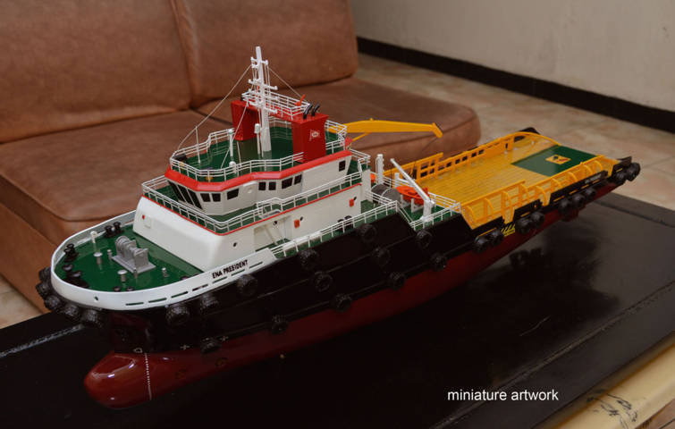 - Miniatur kapal Supply Ena President ini berbahan dasar fiber, acrylic, resin, artificial part, kayu sebagai tatakan serta dilengkapi pencahayaan dengan lampu led ( optional ),
