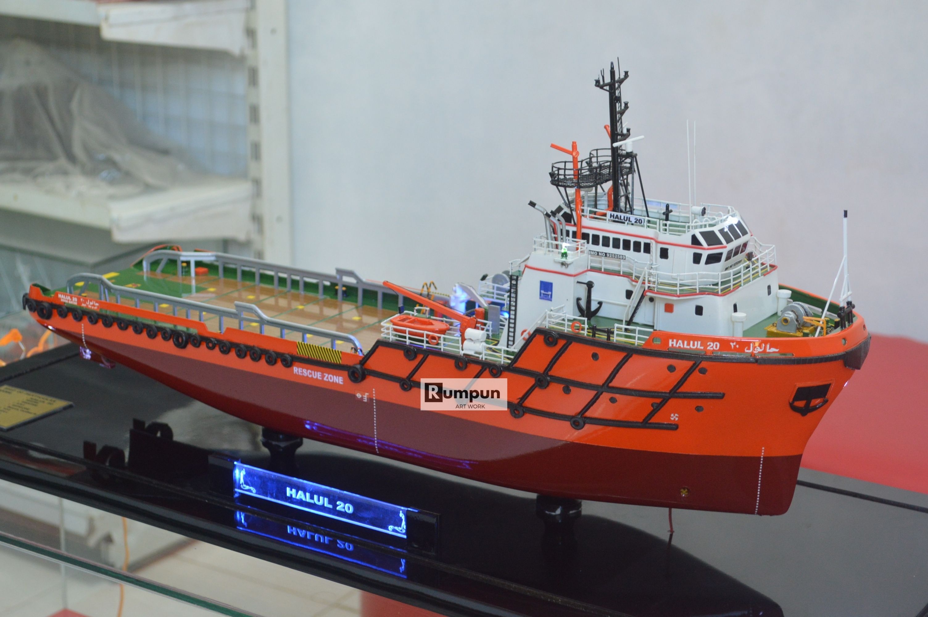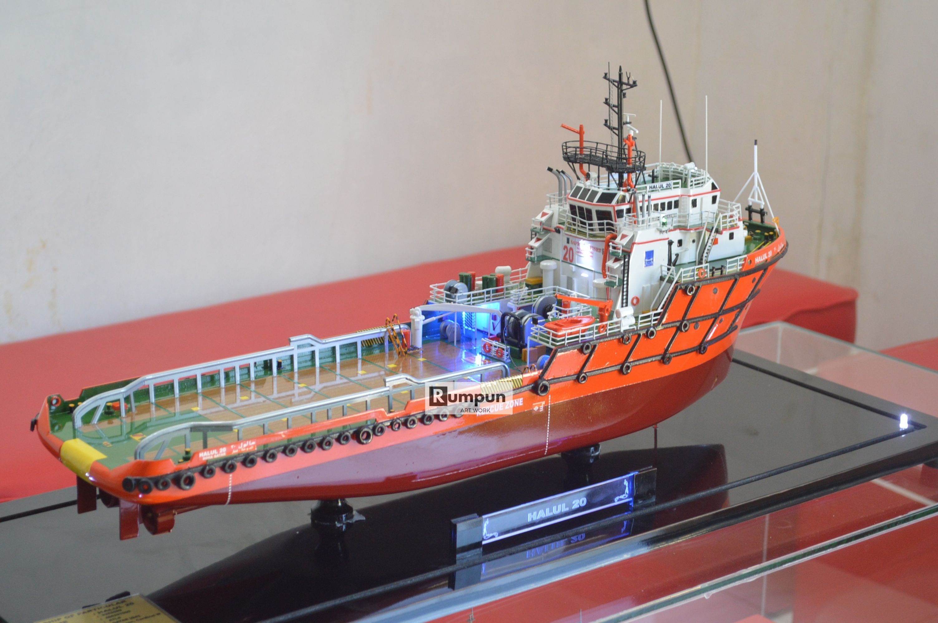 - Miniatur Kapal Supply Halul 20 ini berbahan dasar fiber, acrylic, resin, artificial part, kayu sebagai tatakan serta dilengkapi pencahayaan dengan lampu led ( optional ), kemudian kami bingkai dengan etalase kaca ( optional ) .