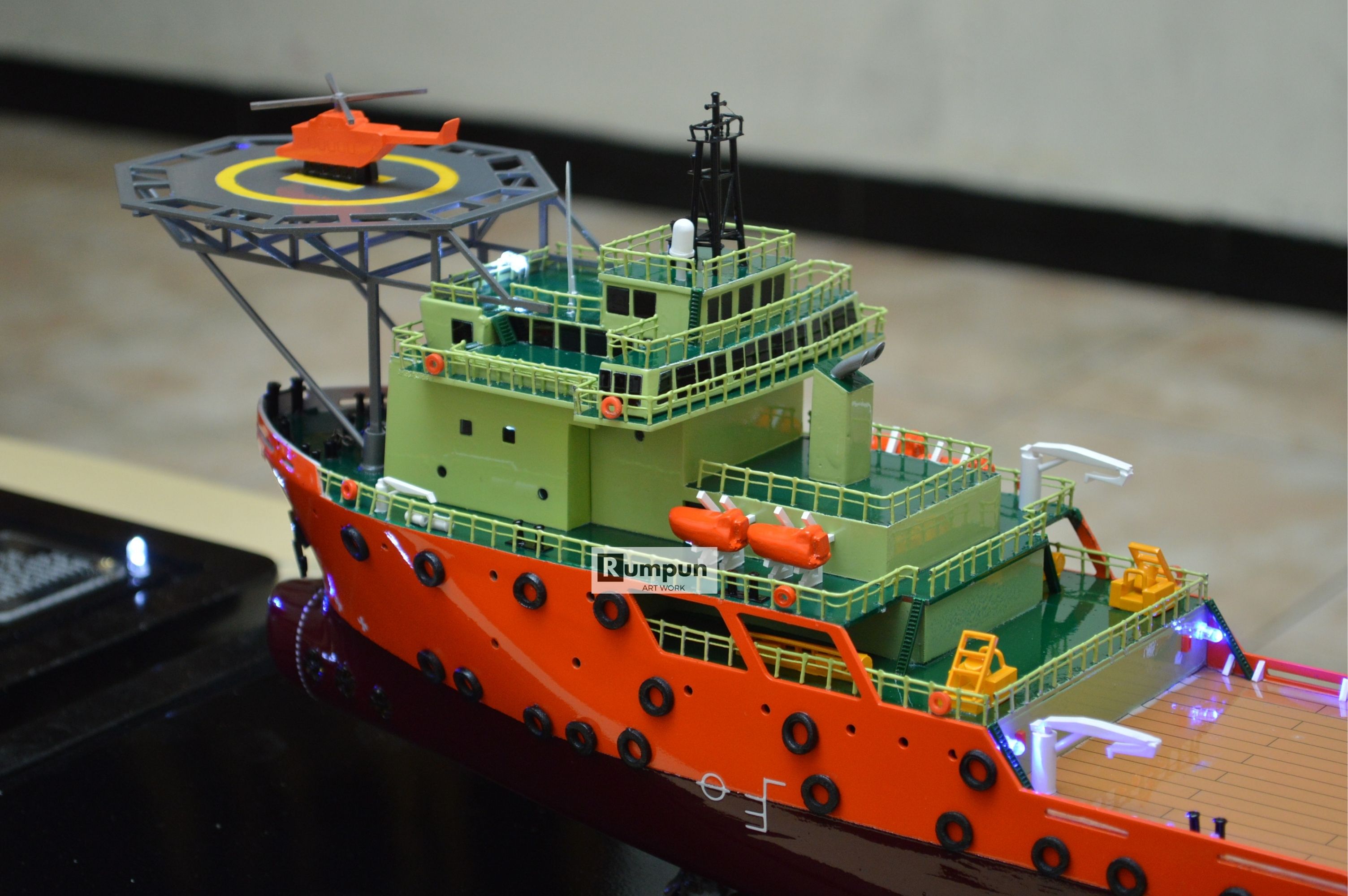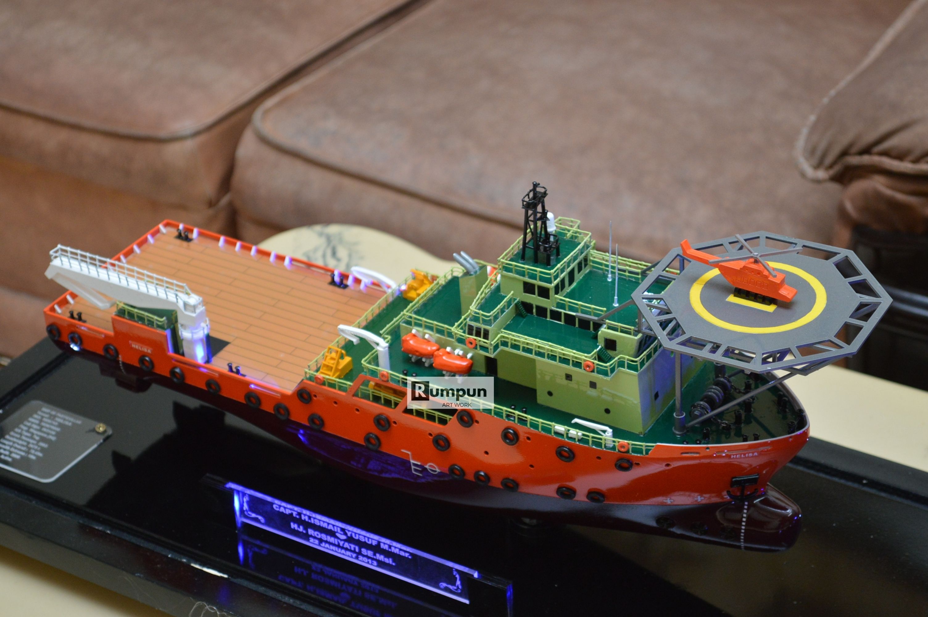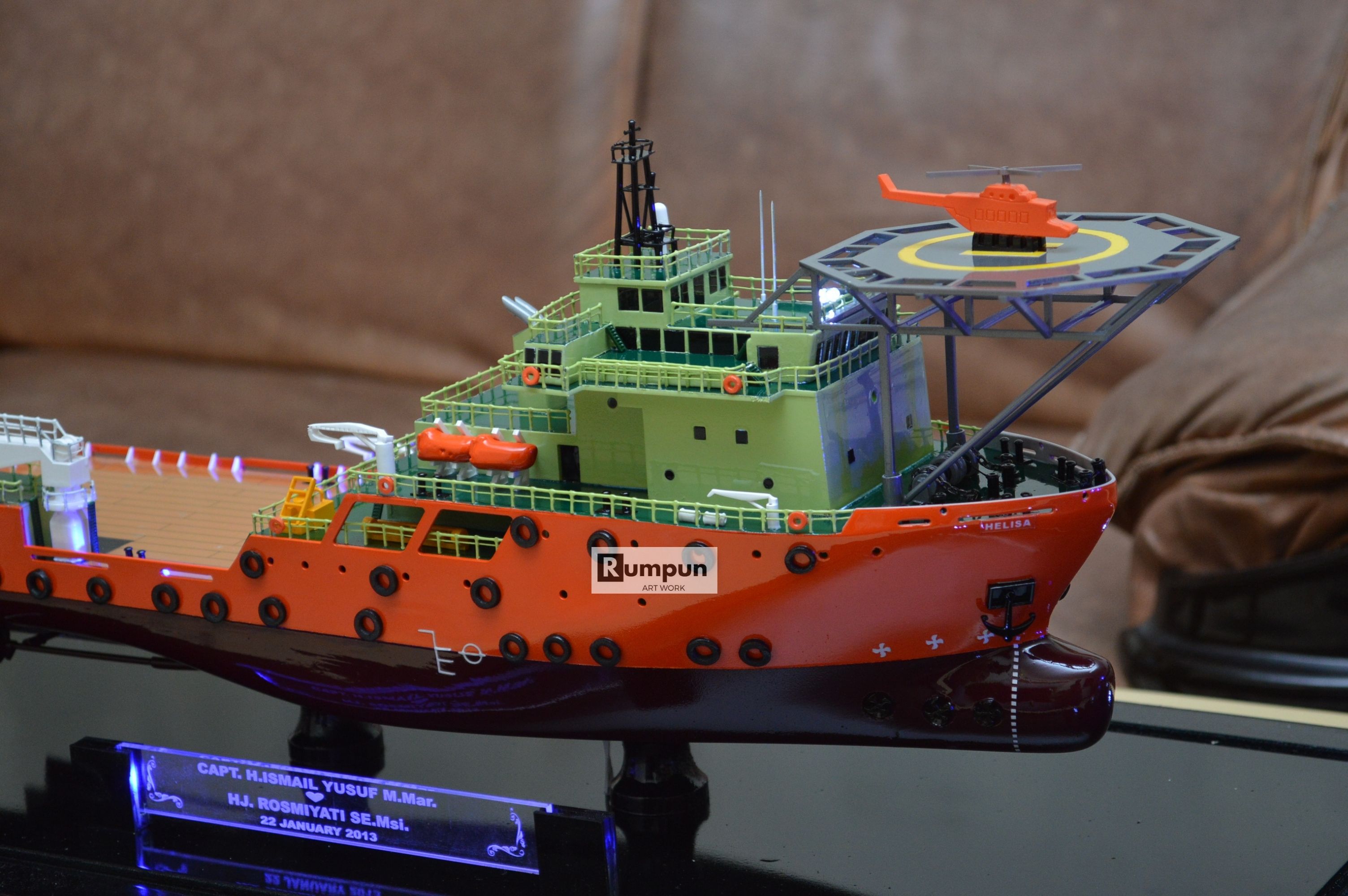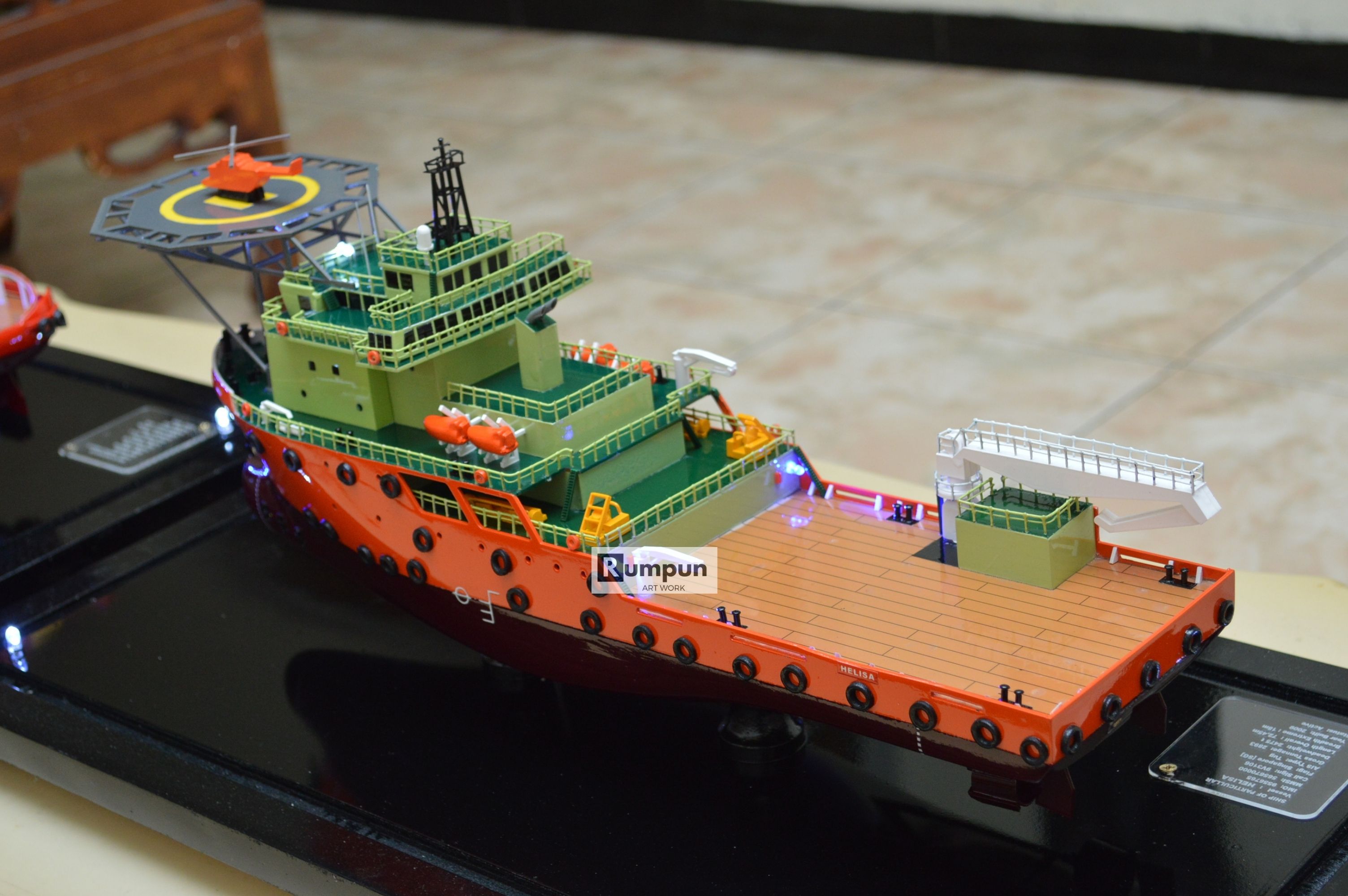 - Miniatur Kapal Supply Helisa ini berbahan dasar fiber, acrylic, resin, artificial part, kayu sebagai tatakan serta dilengkapi pencahayaan dengan lampu led ( optional ), kemudian kami bingkai dengan etalase kaca ( optional ) .