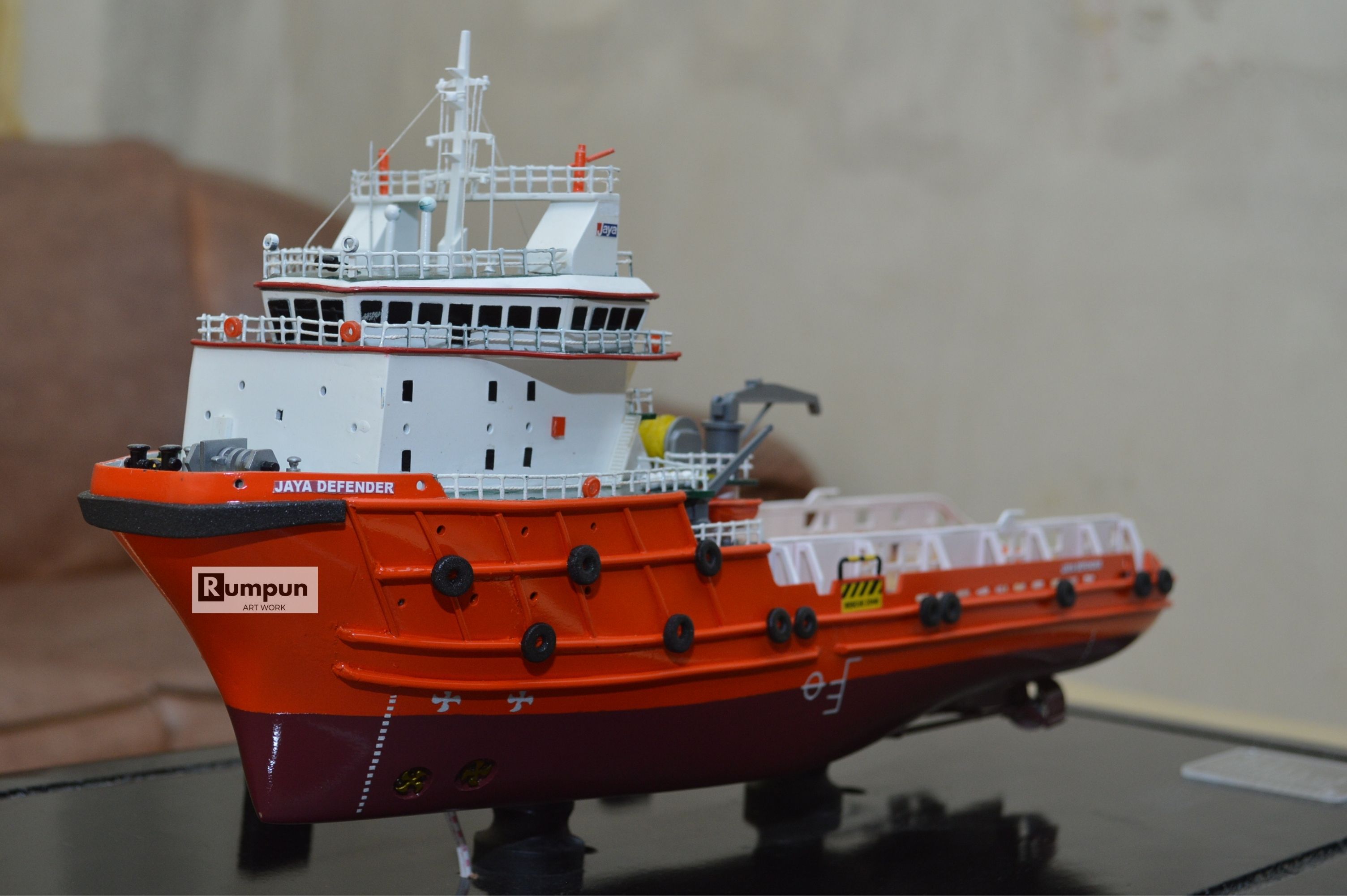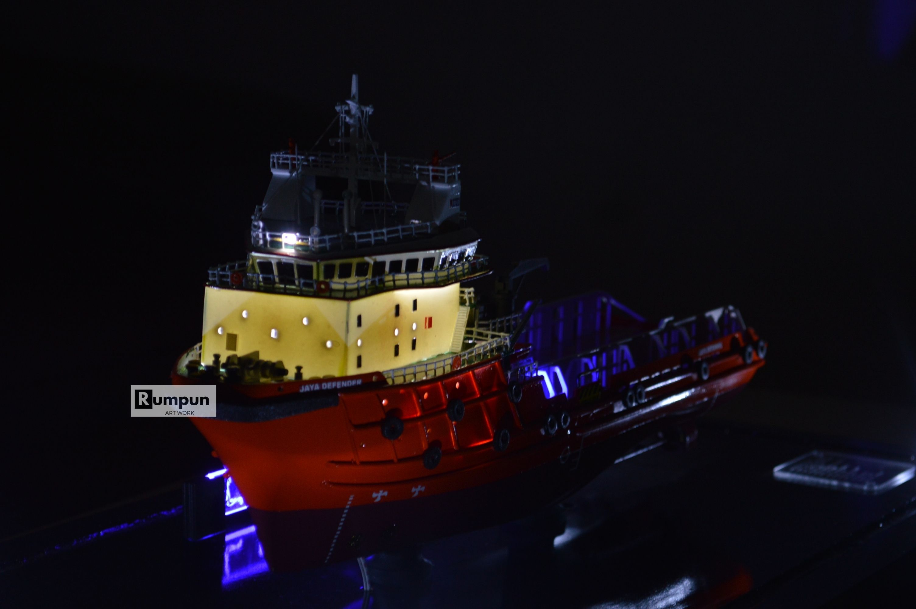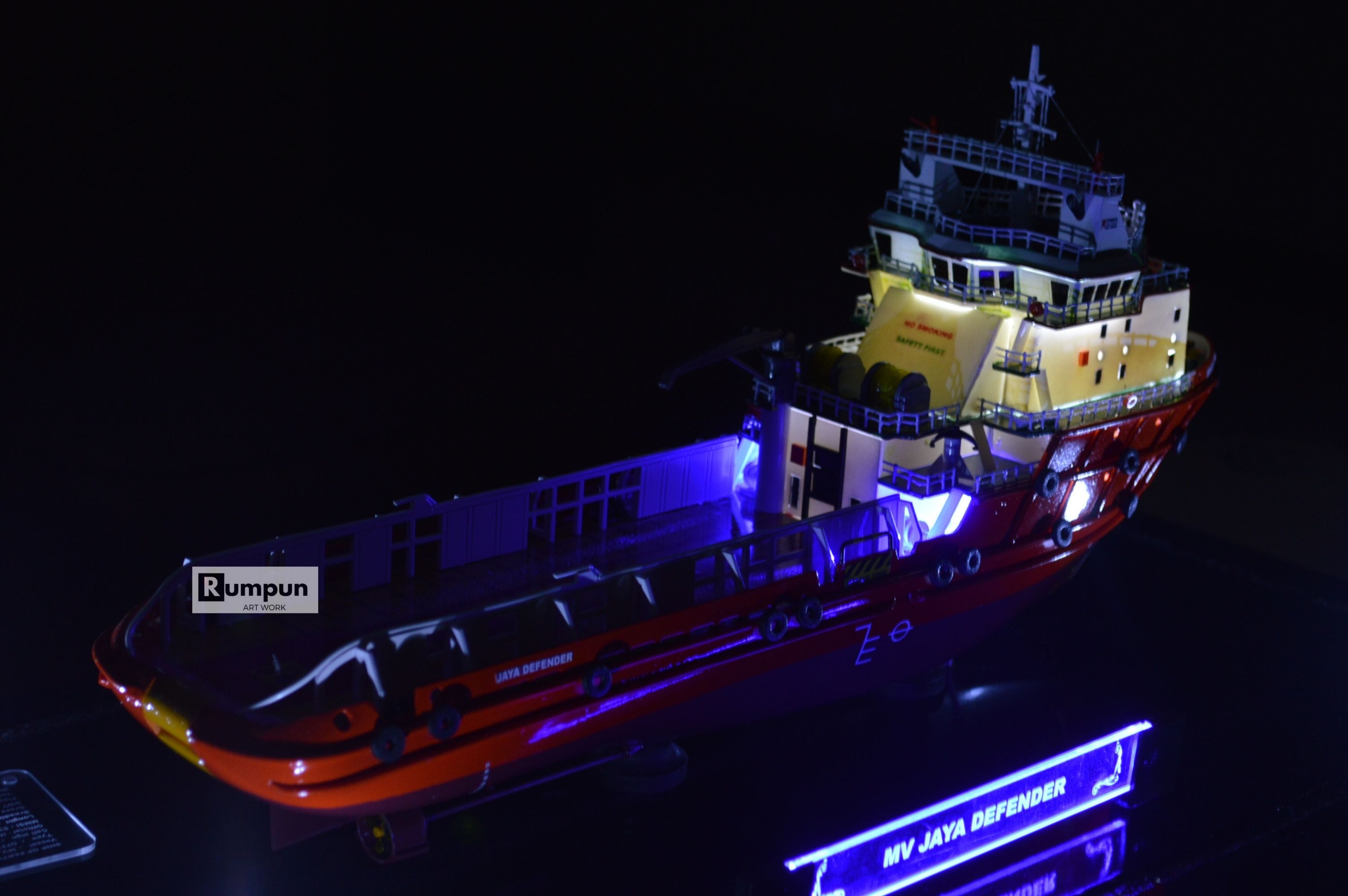 - Miniatur Kapal Supply Jaya Defender ini berbahan dasar fiber, acrylic, resin, artificial part, kayu sebagai tatakan serta dilengkapi pencahayaan dengan lampu led ( optional ), kemudian kami bingkai dengan etalase kaca ( optional ) .