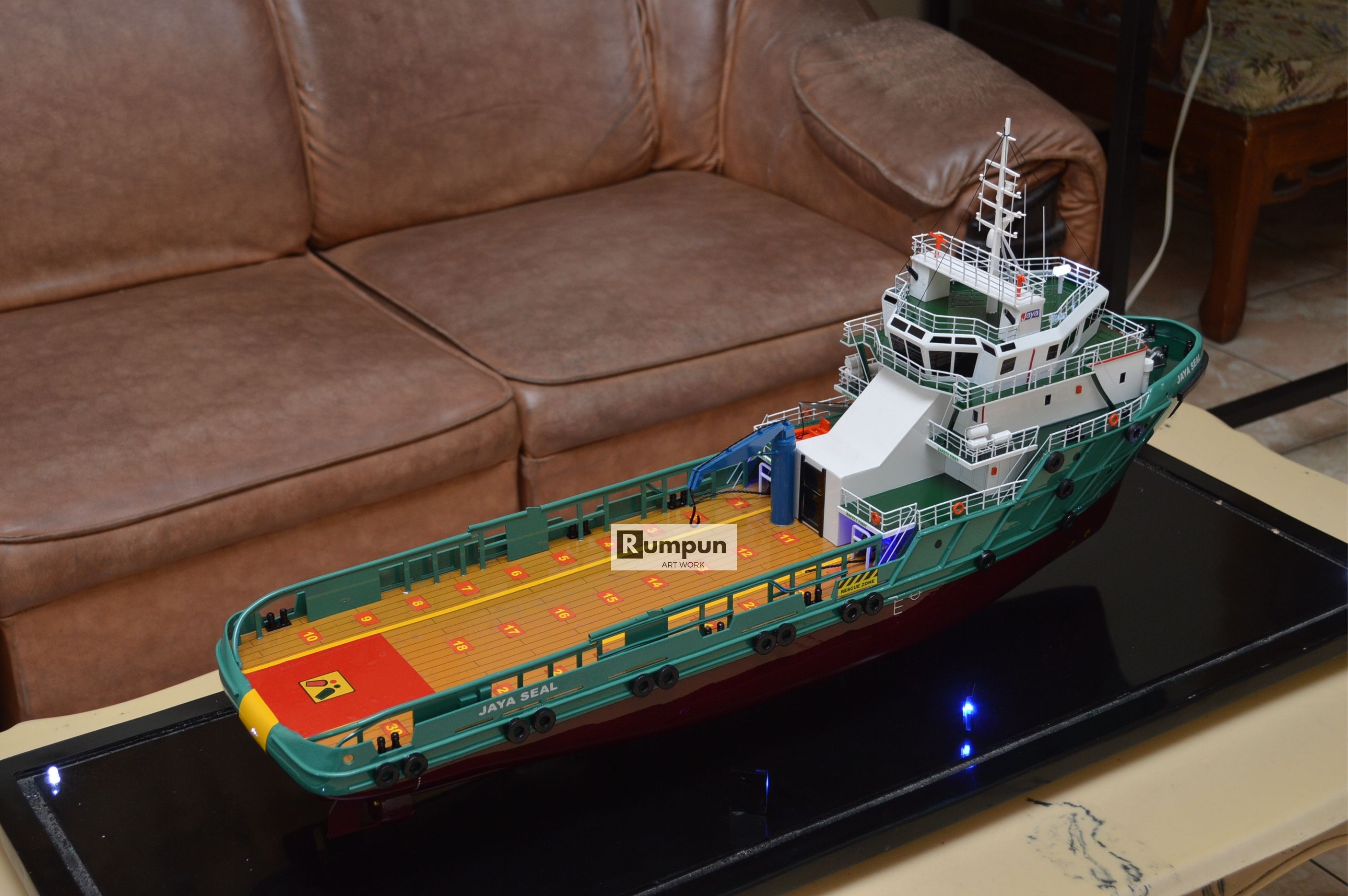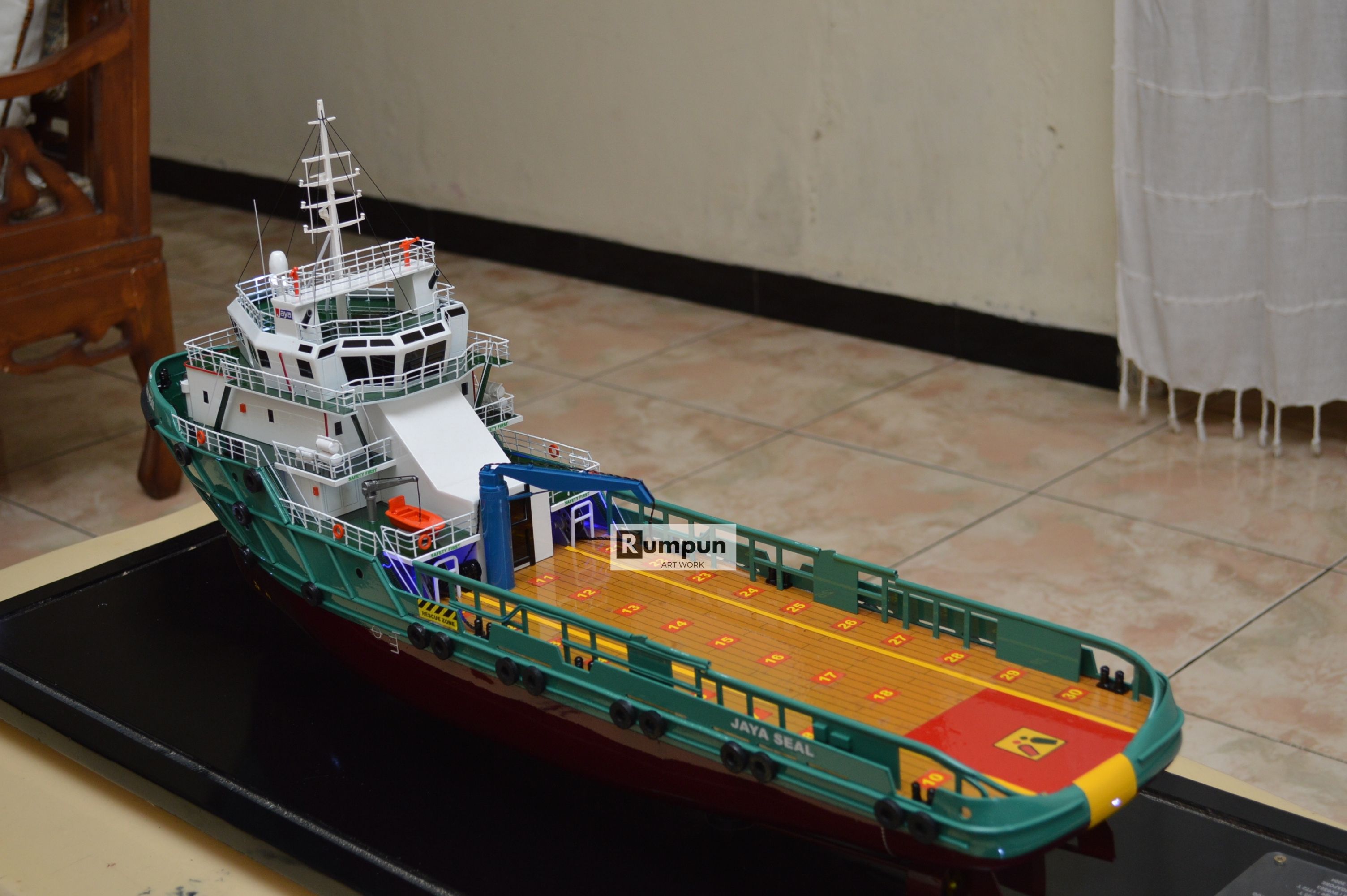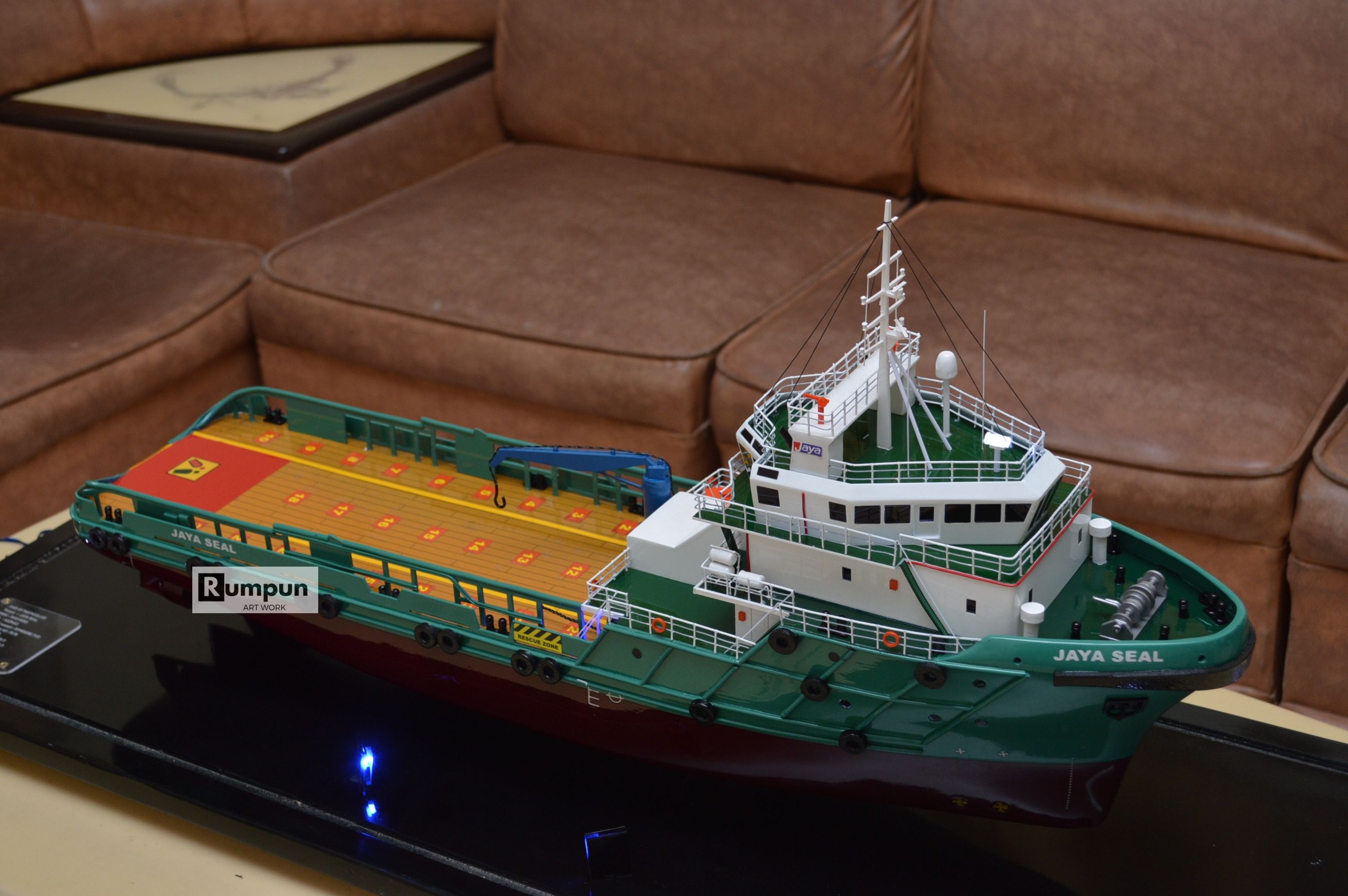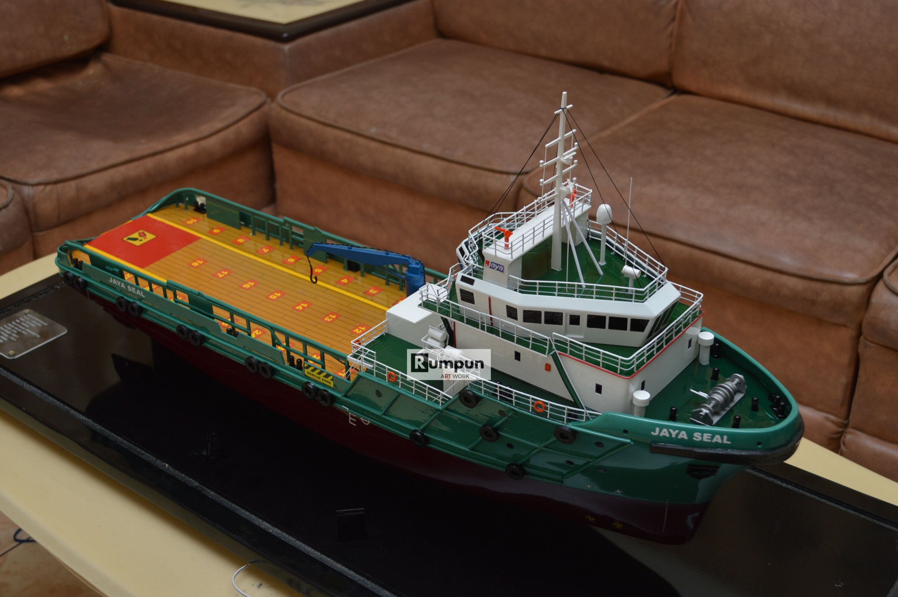 - Miniatur Kapal Supply Jaya Seal ini berbahan dasar fiber, acrylic, resin, artificial part, kayu sebagai tatakan serta dilengkapi pencahayaan dengan lampu led ( optional ), kemudian kami bingkai dengan etalase kaca ( optional ) .