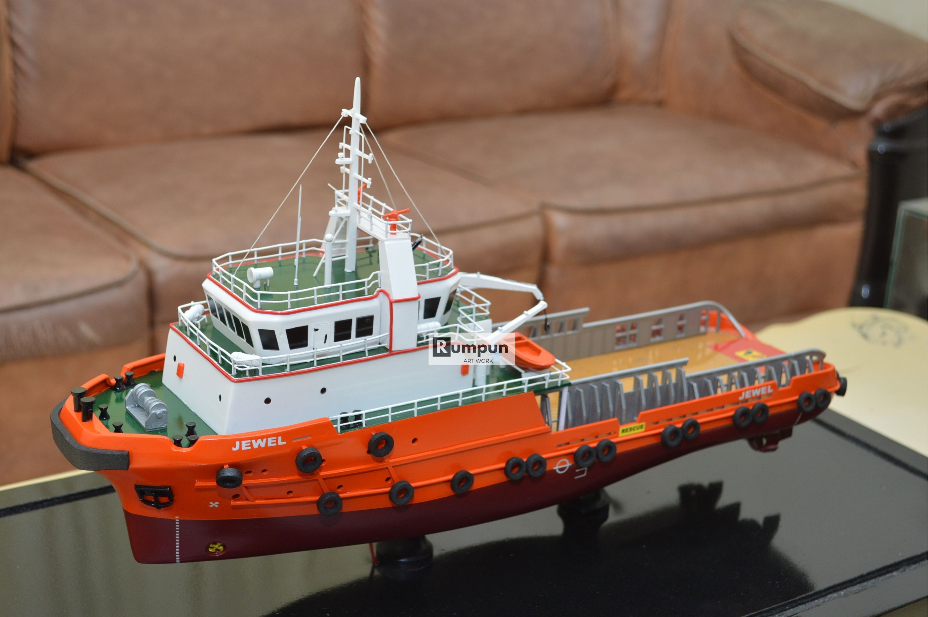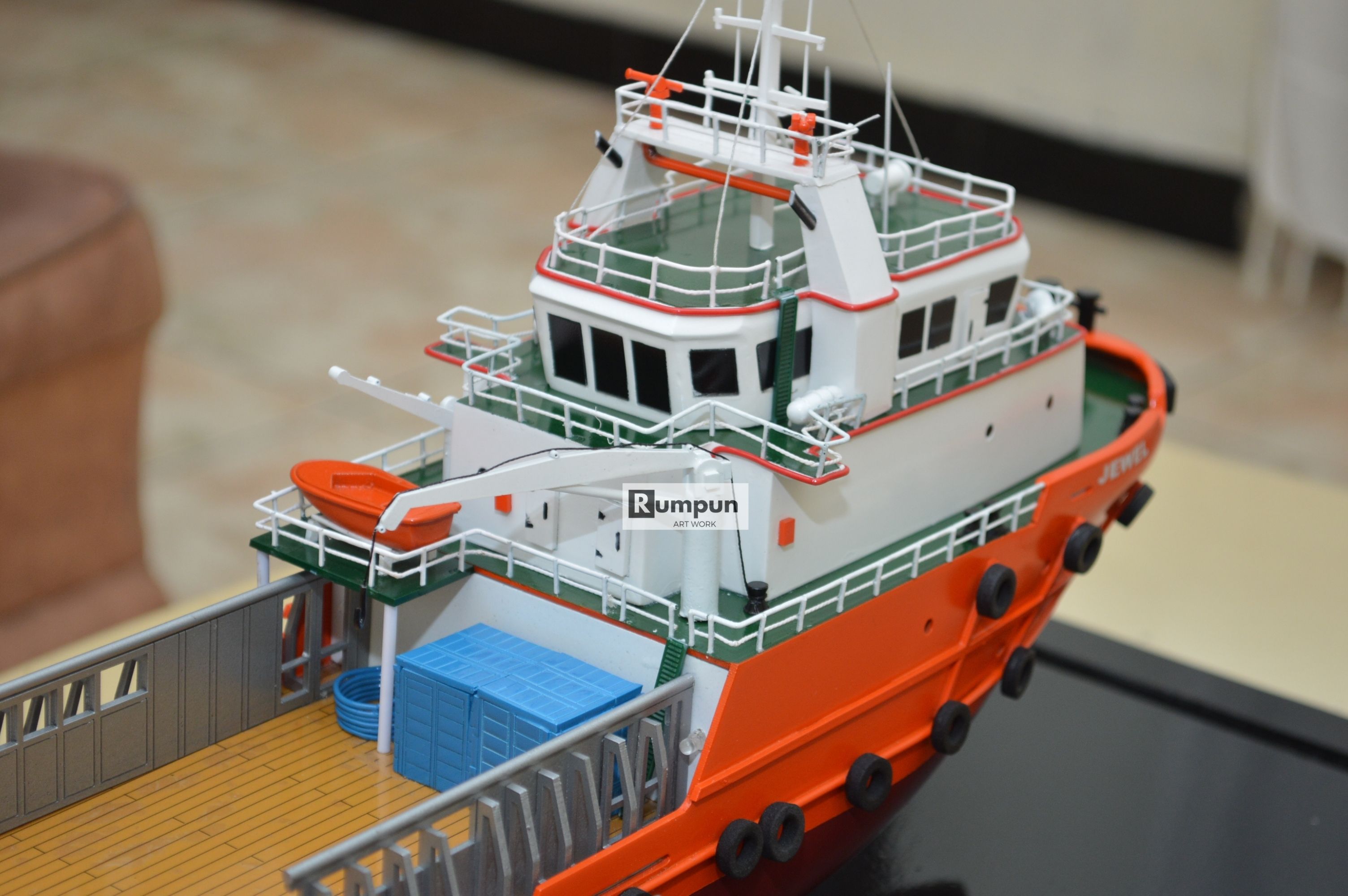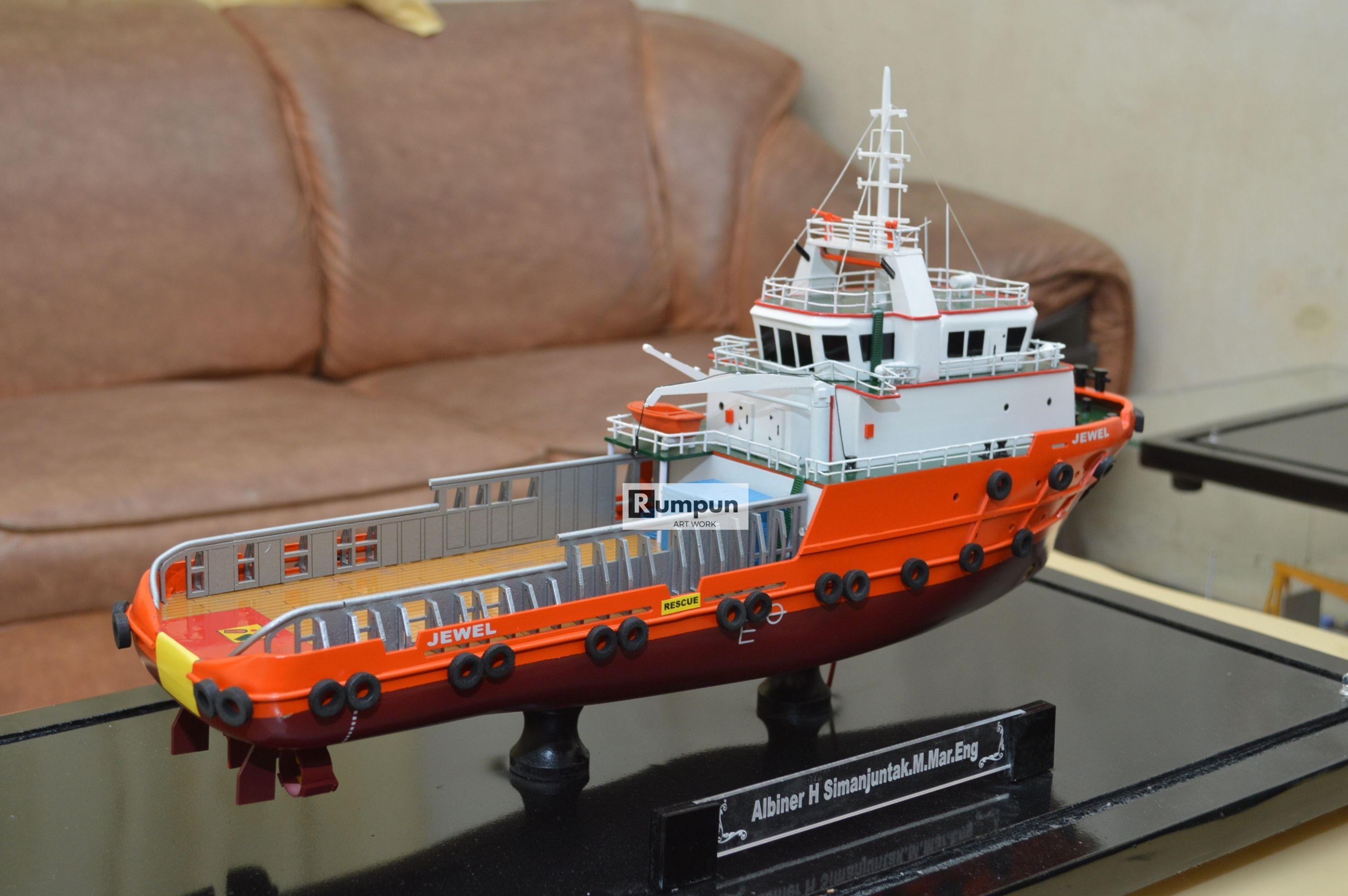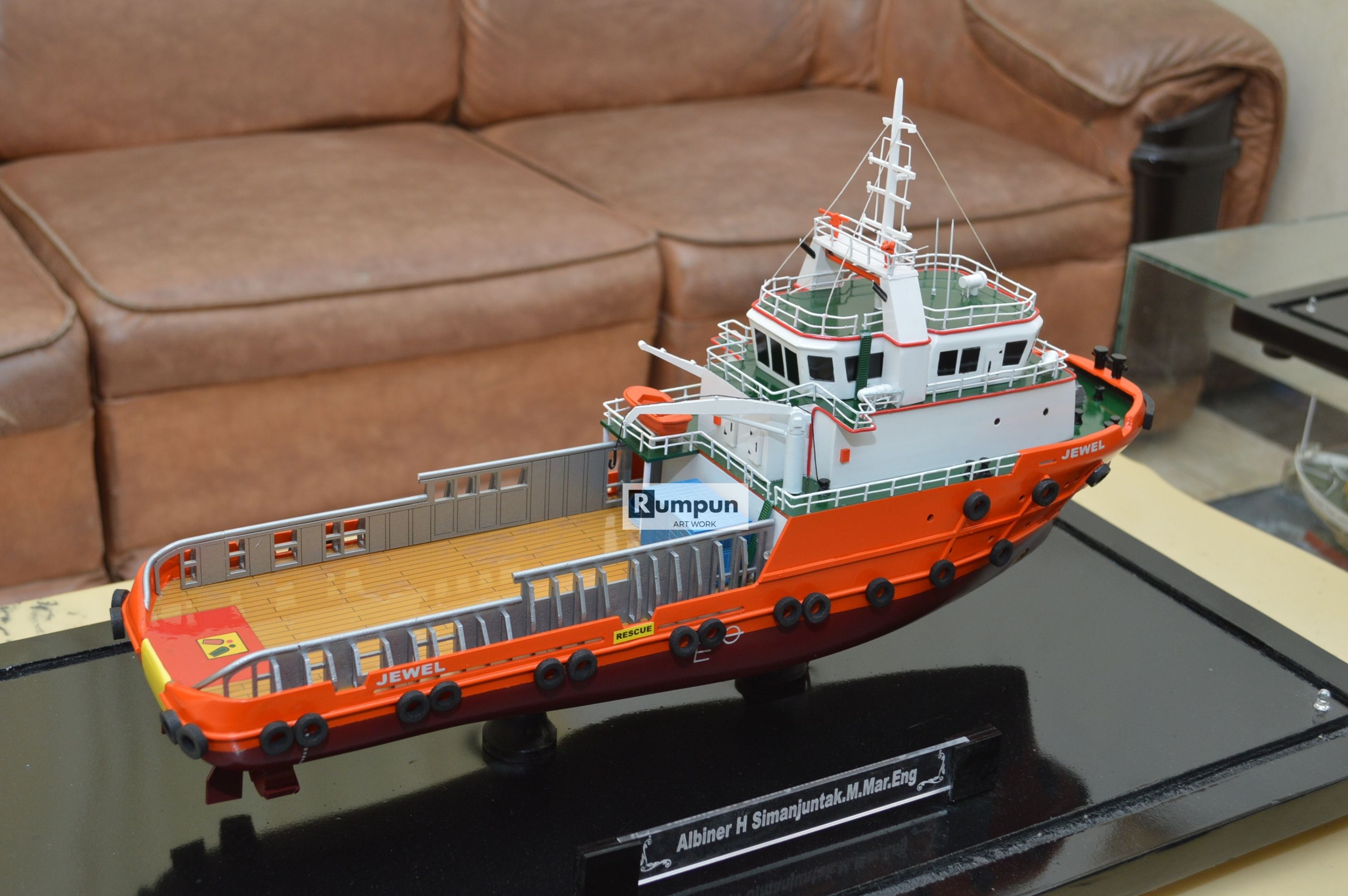 - Miniatur Kapal Supply Jewel ini berbahan dasar fiber, acrylic, resin, artificial part, kayu sebagai tatakan serta dilengkapi pencahayaan dengan lampu led ( optional ), kemudian kami bingkai dengan etalase kaca ( optional ) .