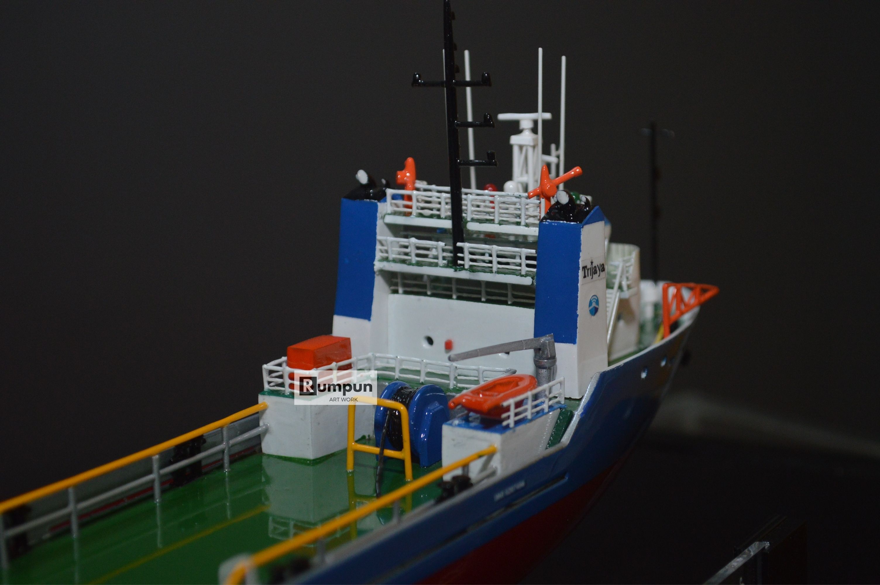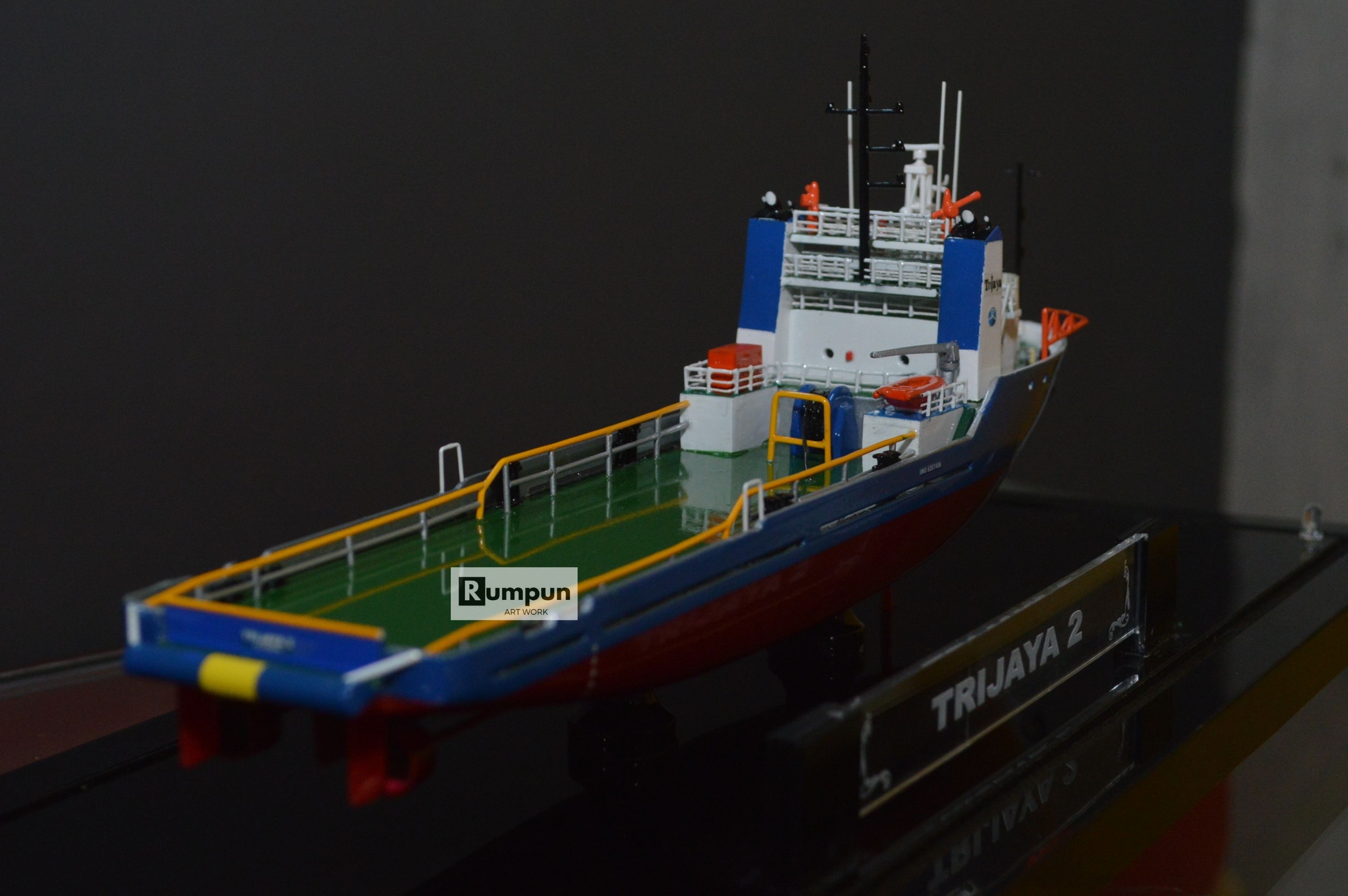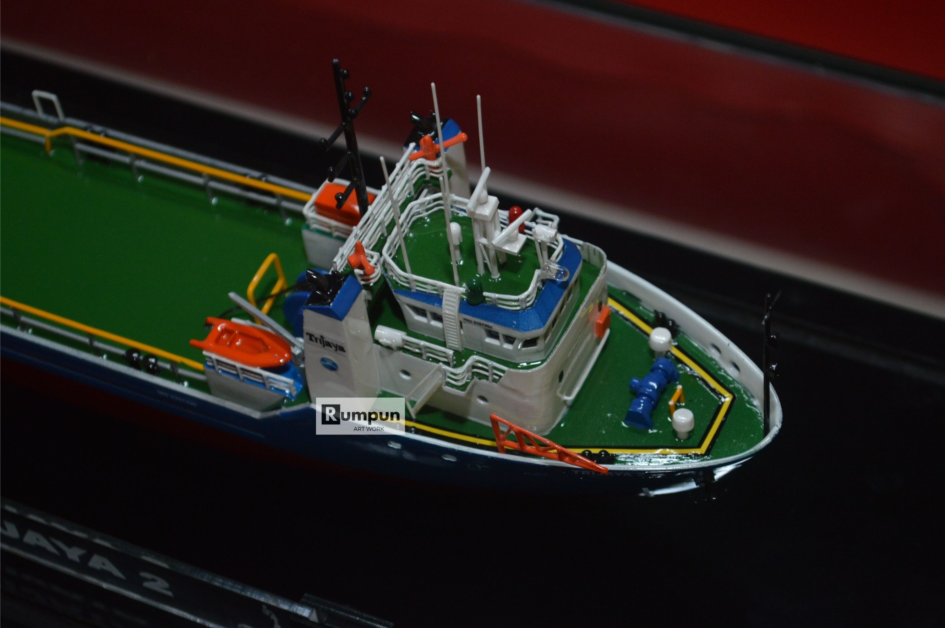 • Miniatur Kapal Trijaya 2 AHTS ini berbahan dasar fiber, acrylic, resin, artificial part, kayu sebagai tatakan serta dilengkapi pencahayaan dengan lampu led (optional), kemudian kami bingkai dengan etalase kaca (optional).