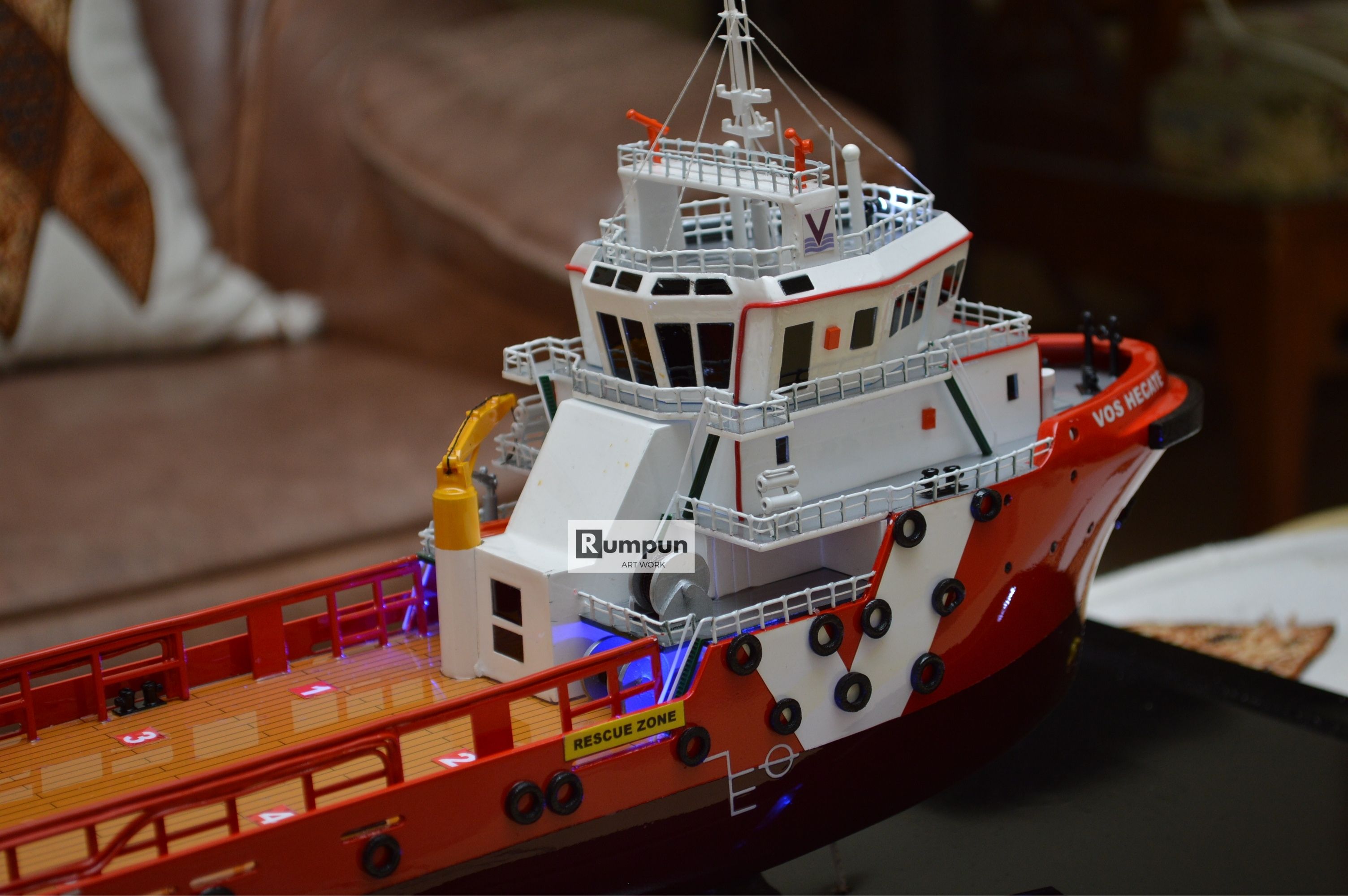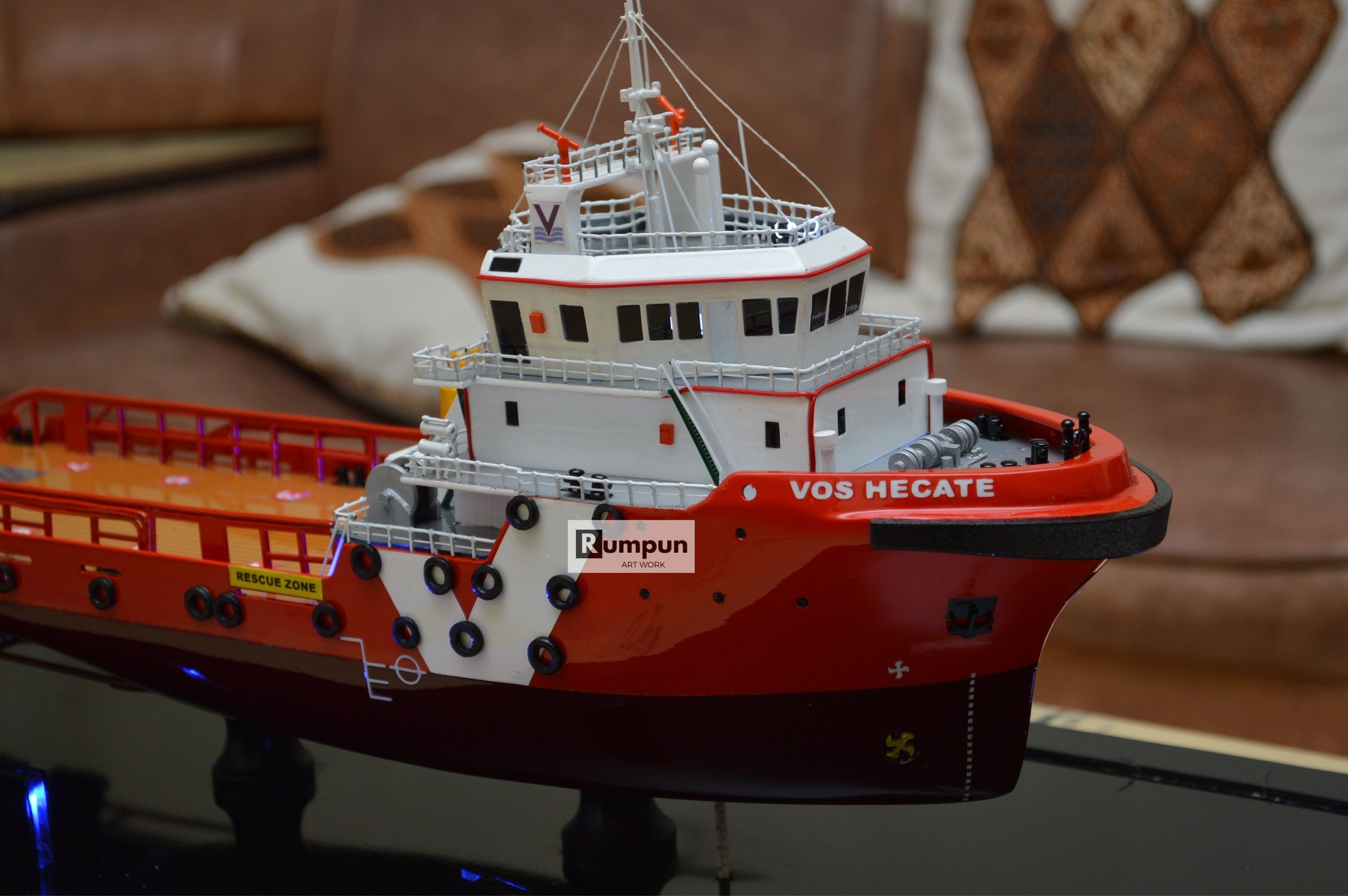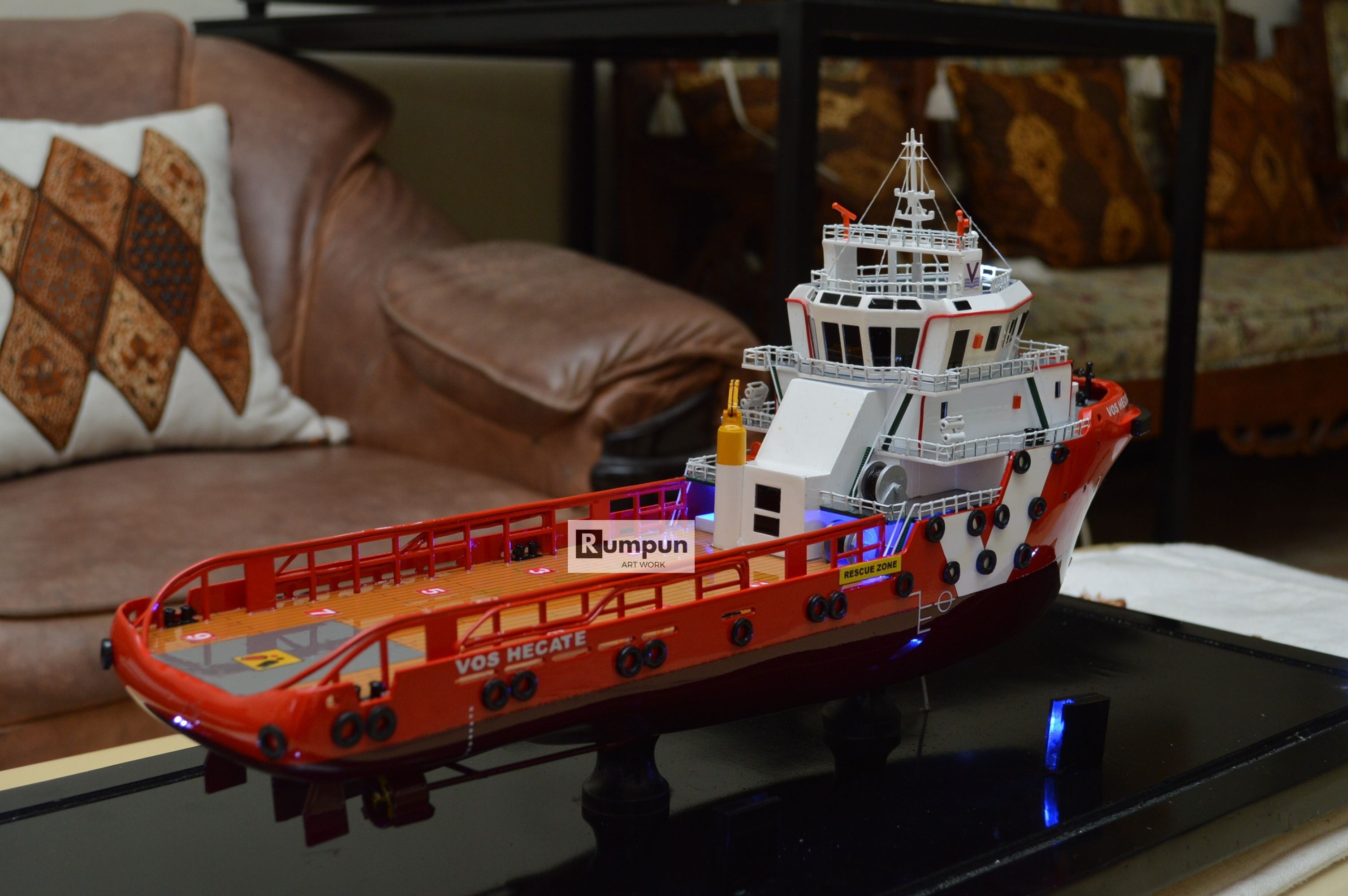 - Miniatur Kapal Supply Vos Hecate ini berbahan dasar fiber, acrylic, resin, artificial part, kayu sebagai tatakan serta dilengkapi pencahayaan dengan lampu led (optional), kemudian kami bingkai dengan etalase kaca (optional).