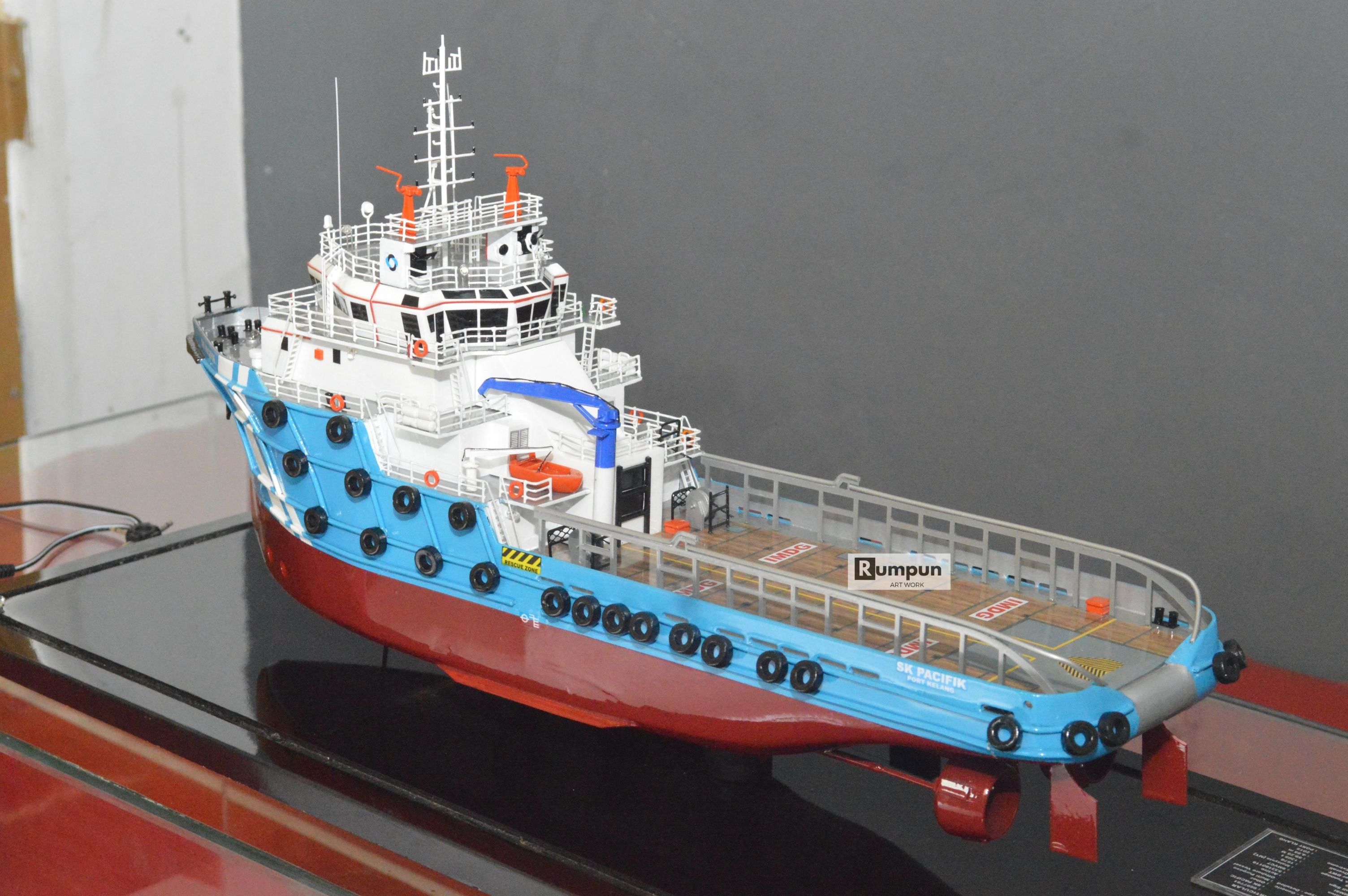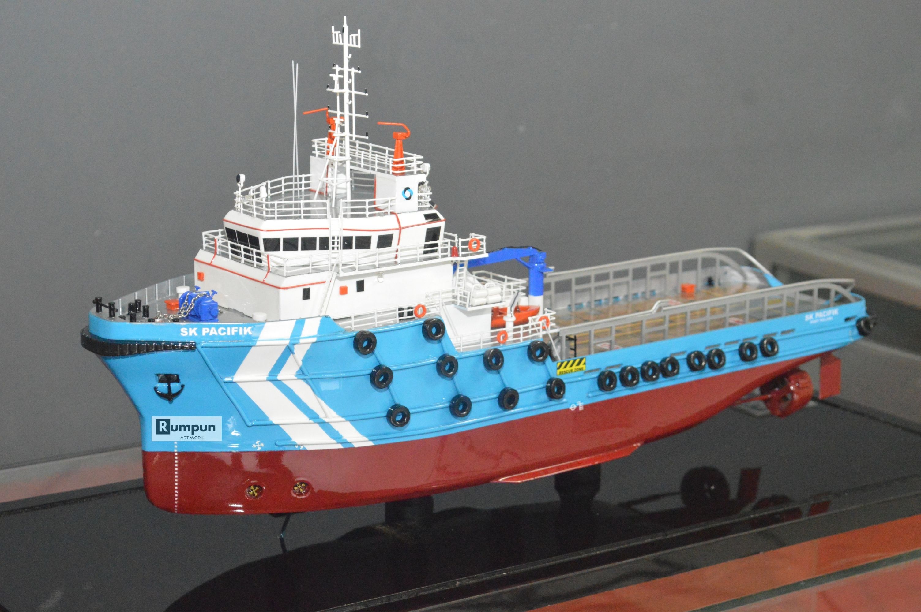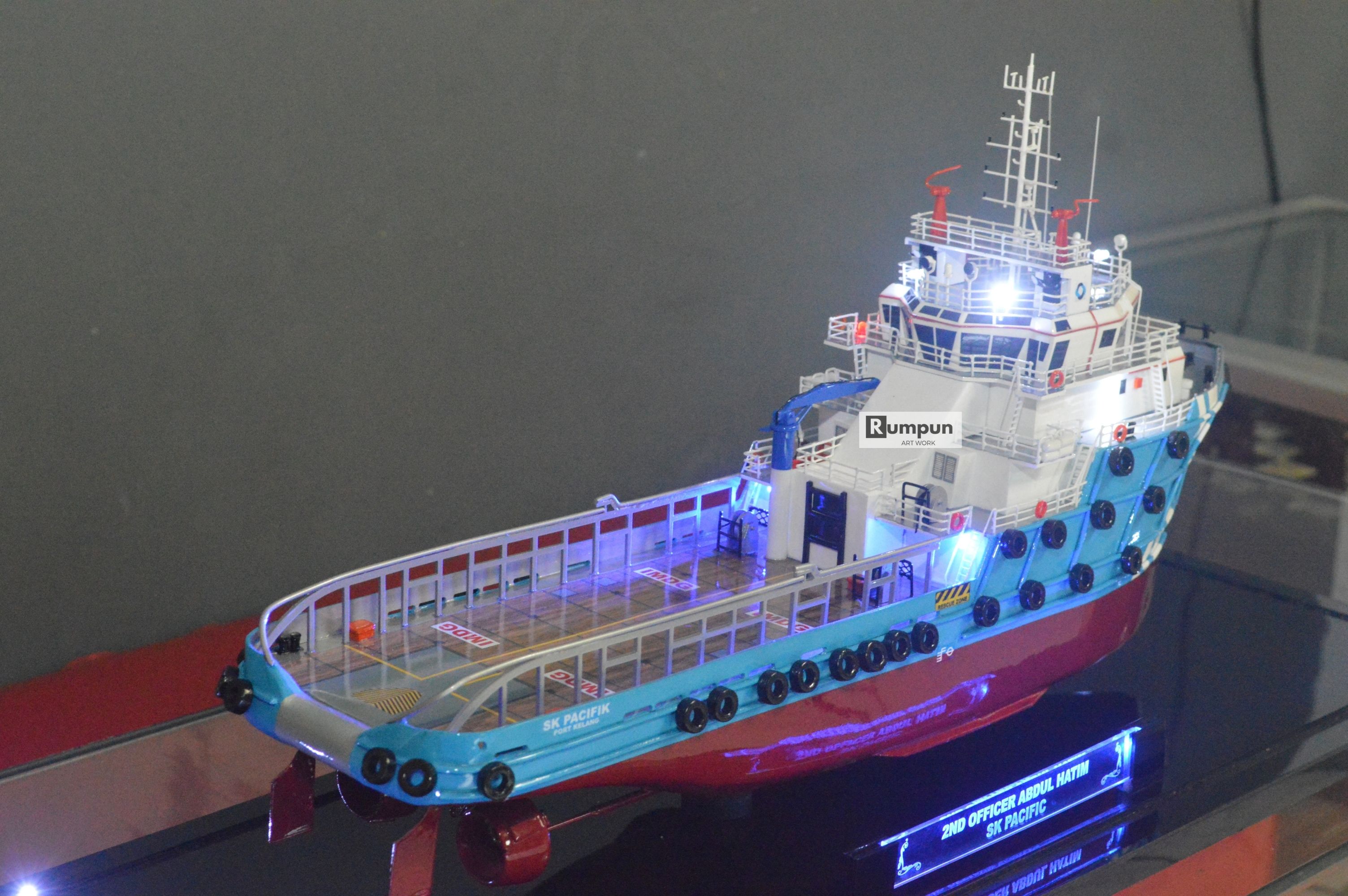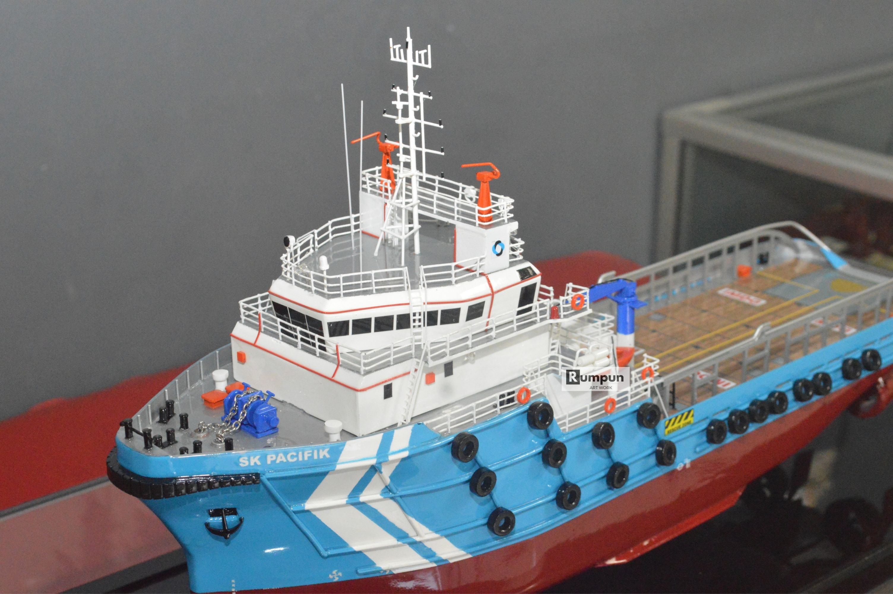 - Miniatur Kapal Supply SK Pacifik ini berbahan dasar fiber, acrylic, resin, artificial part, kayu sebagai tatakan serta dilengkapi pencahayaan dengan lampu led (optional), kemudian kami bingkai dengan etalase kaca (optional).