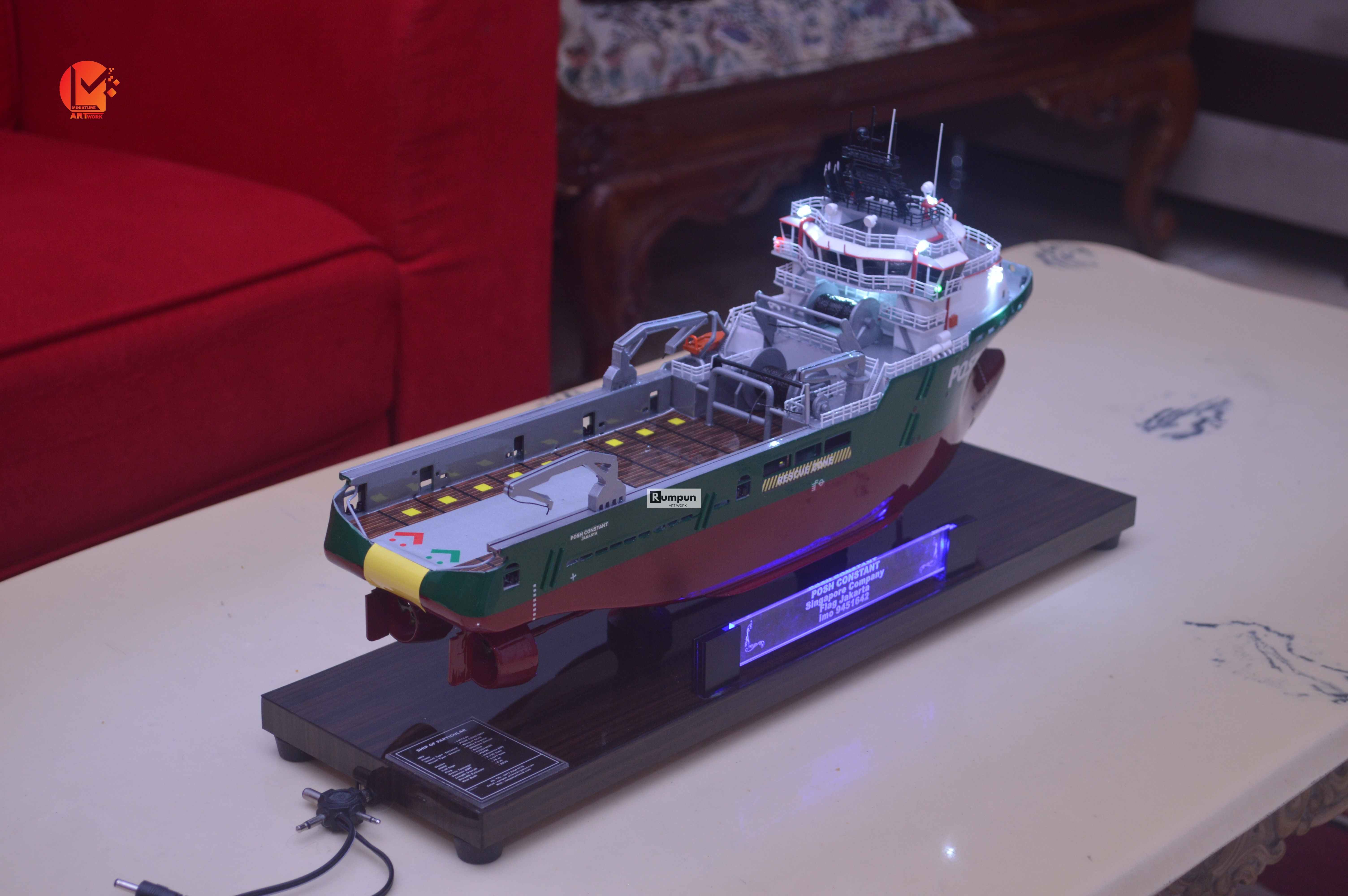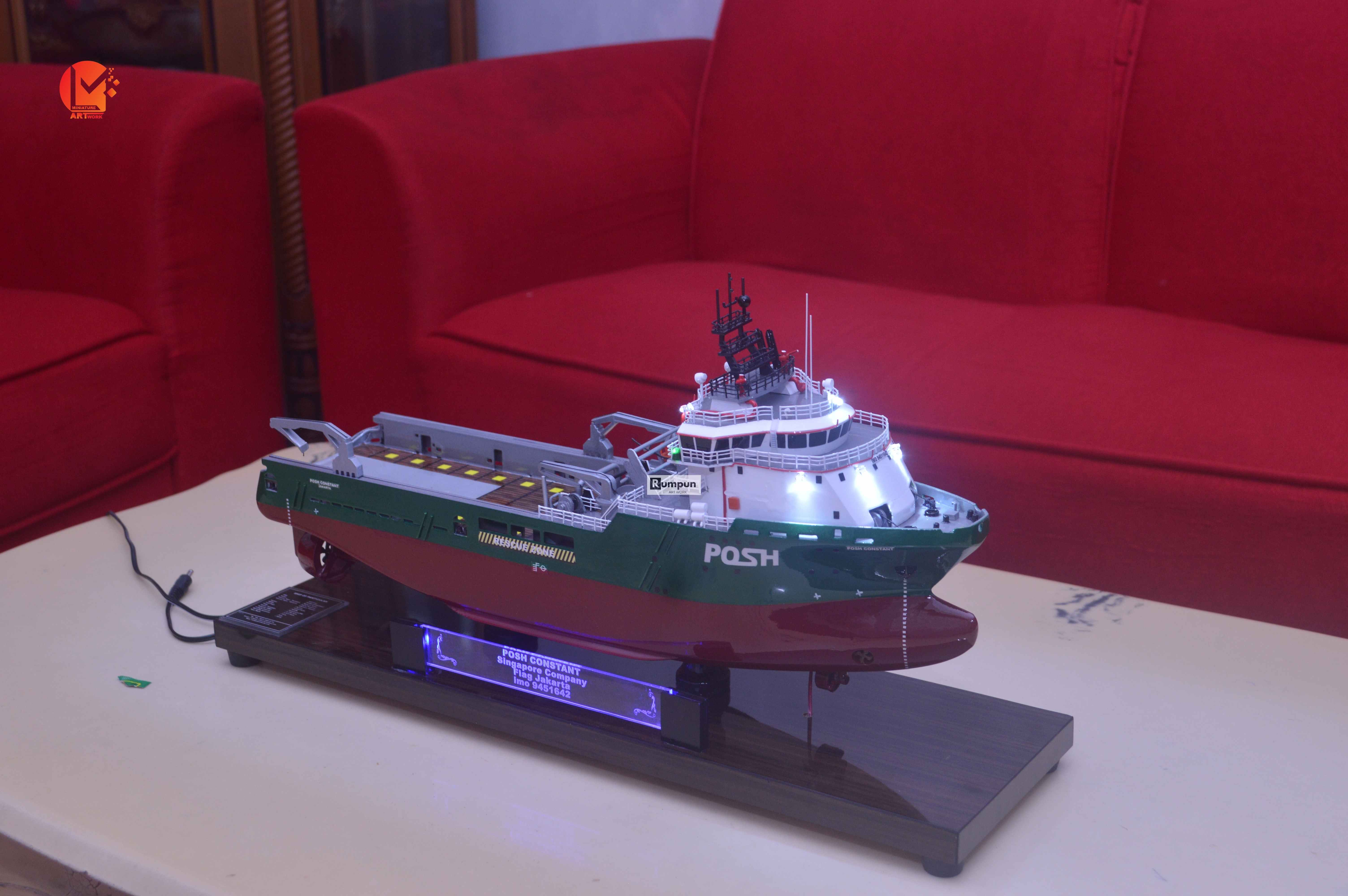- Miniatur Kapal Supply Posh Constant ini berbahan dasar fiber, acrylic, resin, artificial part, kayu sebagai tatakan serta dilengkapi pencahayaan dengan lampu led ( optional ), kemudian kami bingkai dengan etalase kaca ( optional ) .