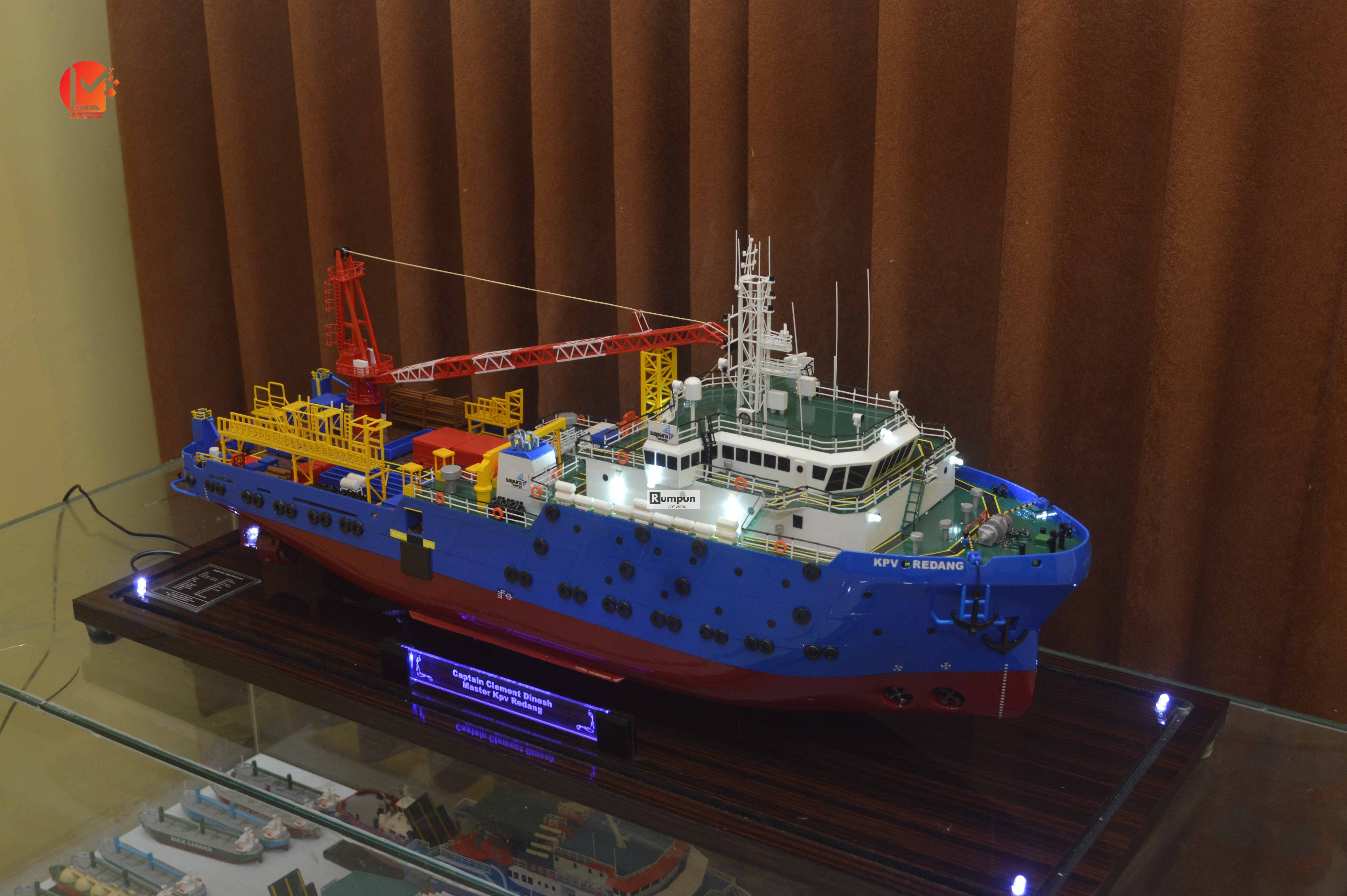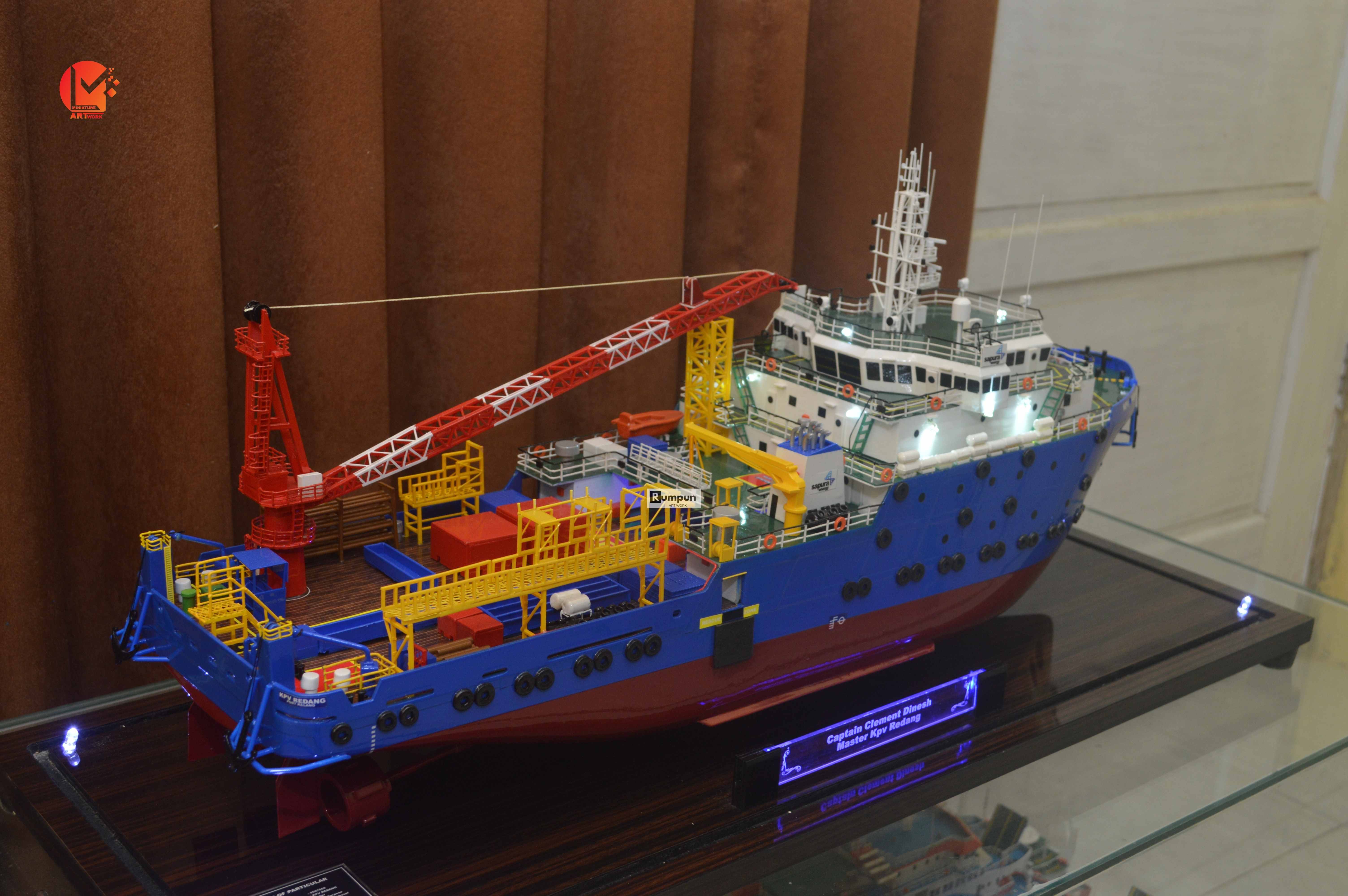 - Miniatur Kapal Supply KPV Redang ini berbahan dasar fiber, acrylic, resin, artificial part, kayu sebagai tatakan serta dilengkapi pencahayaan dengan lampu led ( optional ), kemudian kami bingkai dengan etalase kaca ( optional ) .