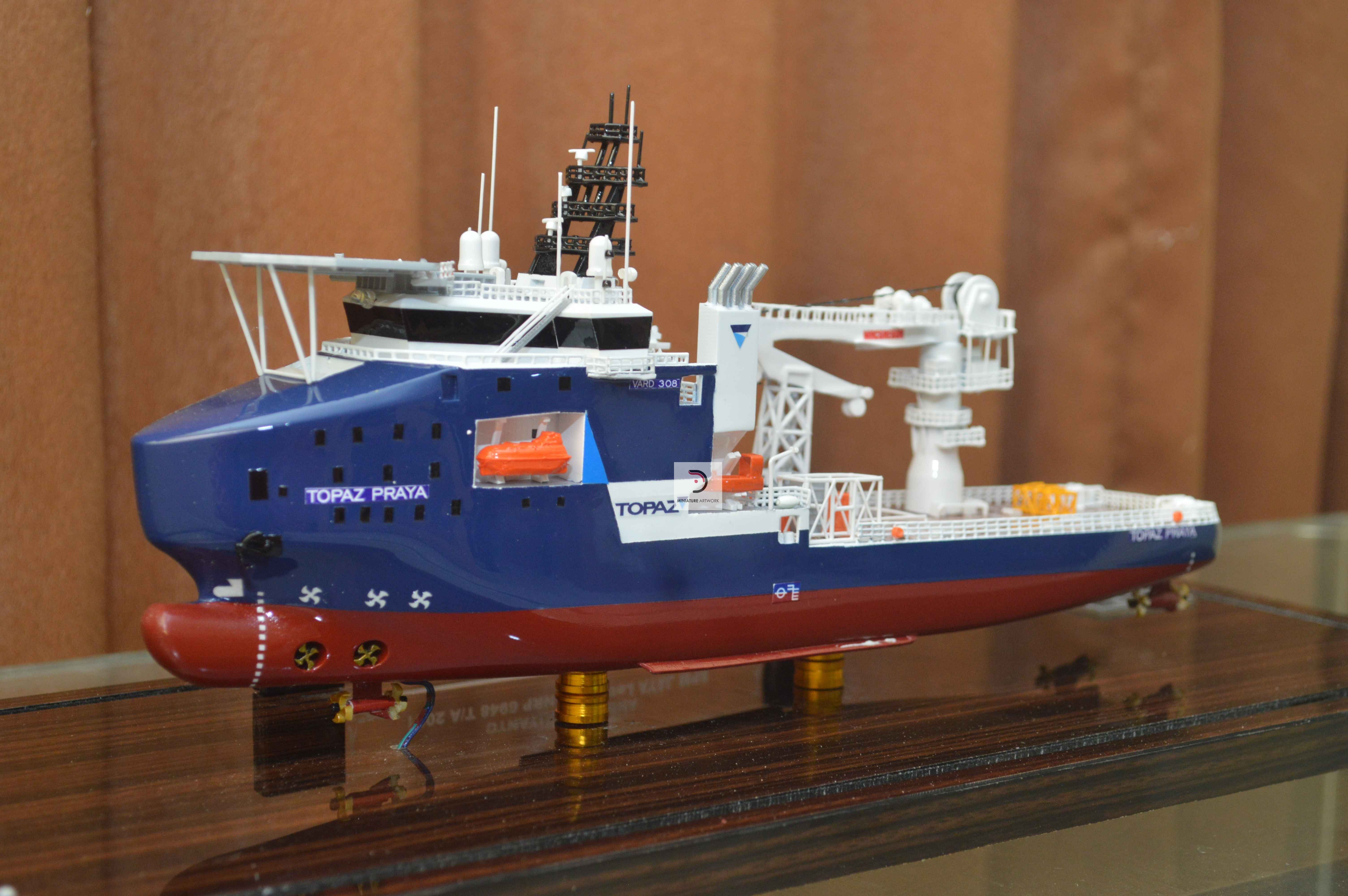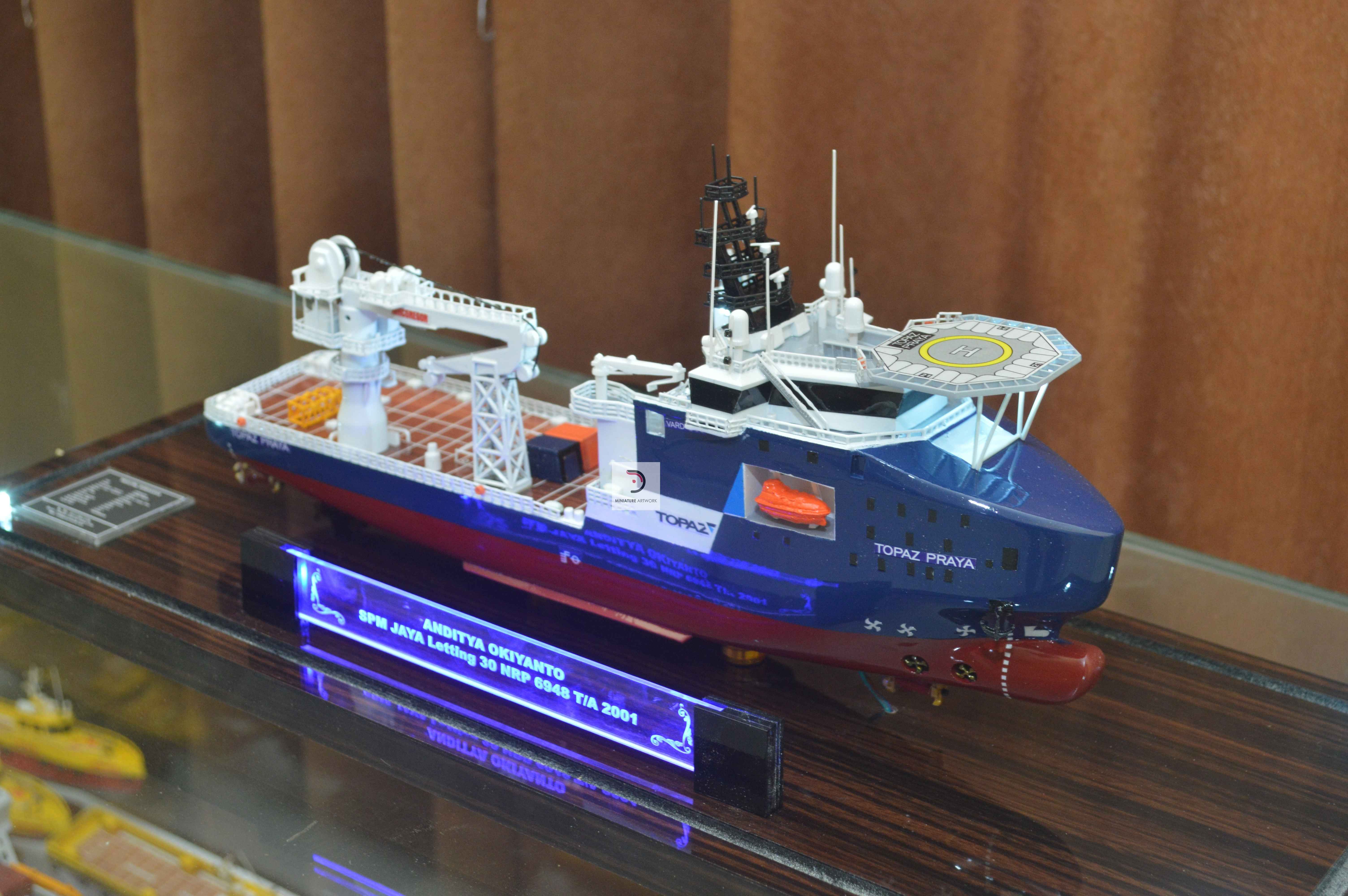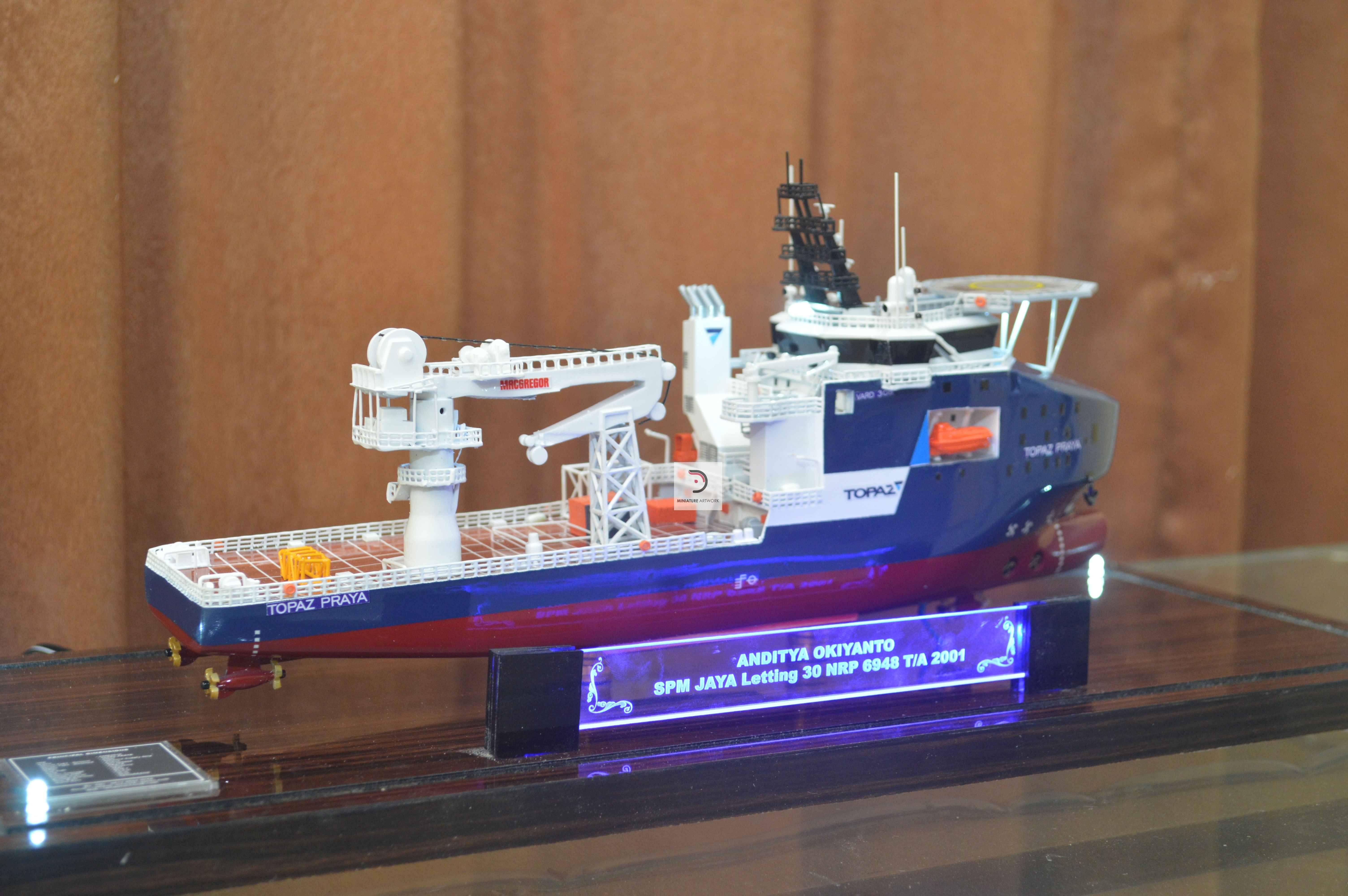 - Miniatur Kapal Supply Topaz Praya ini berbahan dasar fiber, acrylic, resin, artificial part, kayu sebagai tatakan serta dilengkapi pencahayaan dengan lampu led ( optional ), kemudian kami bingkai dengan etalase kaca ( optional )