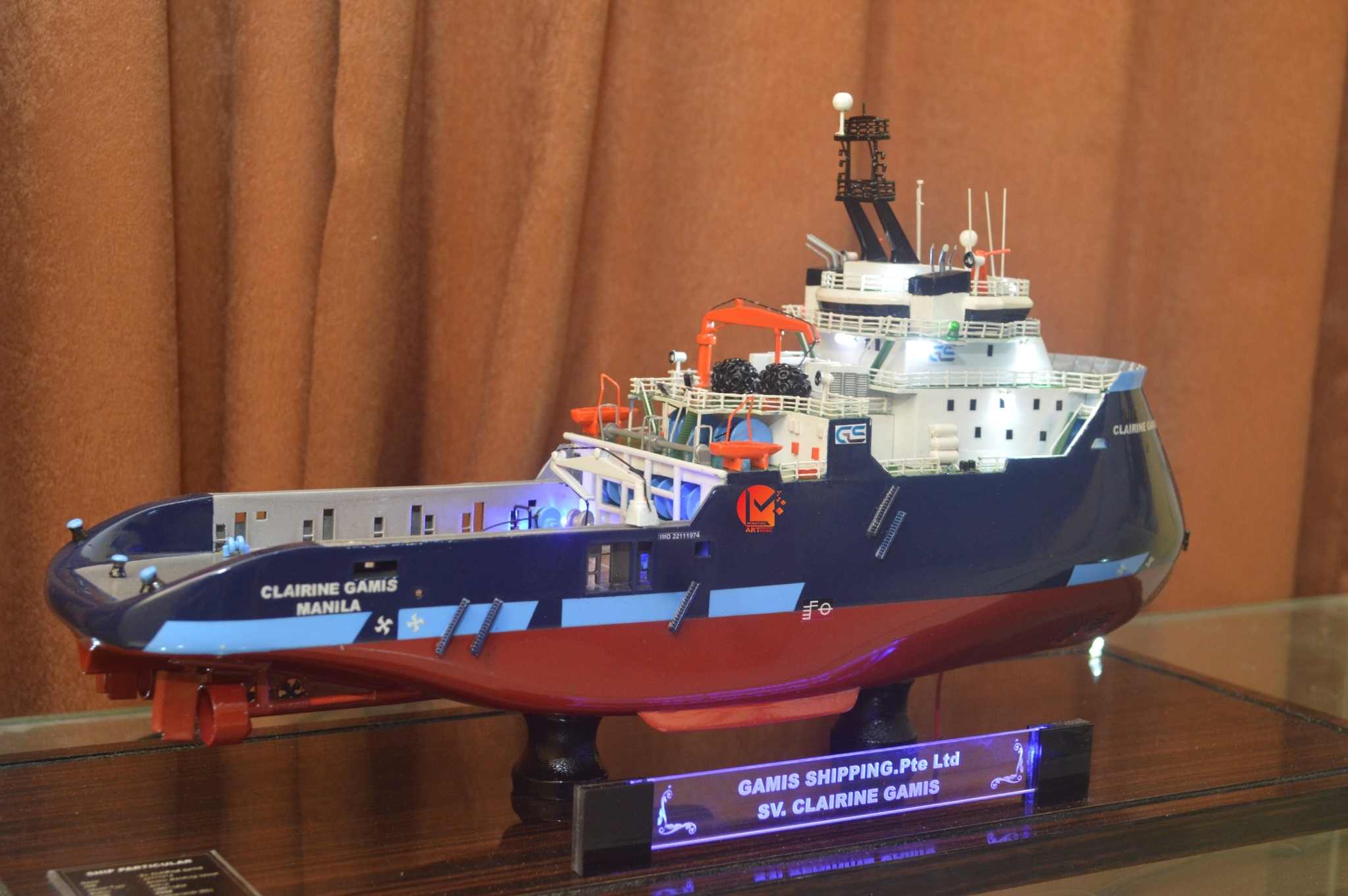 - Miniatur Kapal Supply SV Clairine Gamis ini berbahan dasar fiber, acrylic, resin, artificial part, kayu sebagai tatakan serta dilengkapi pencahayaan dengan lampu led ( optional ), kemudian kami bingkai dengan etalase kaca ( optional )
