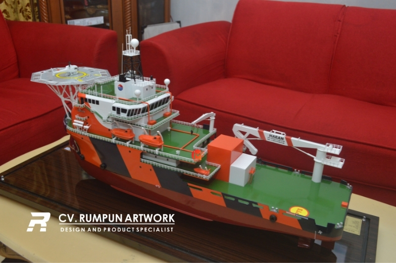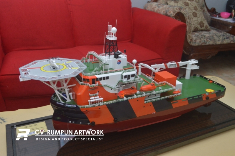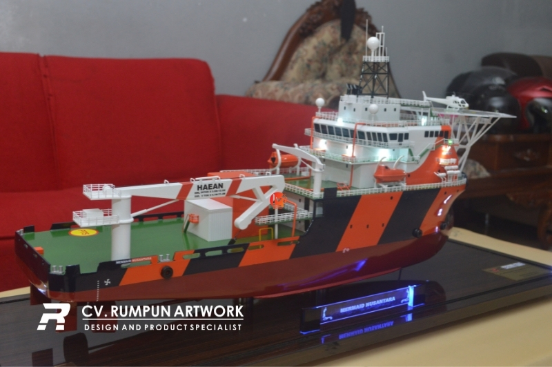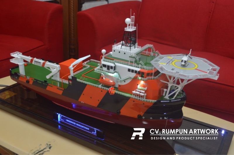 - Miniatur Kapal Offshore Mermaid Nusantara ini berbahan dasar fiber, acrylic, resin, artificial part, kayu sebagai tatakan serta dilengkapi pencahayaan dengan lampu led ( optional ), kemudian kami bingkai dengan etalase kaca ( optional )