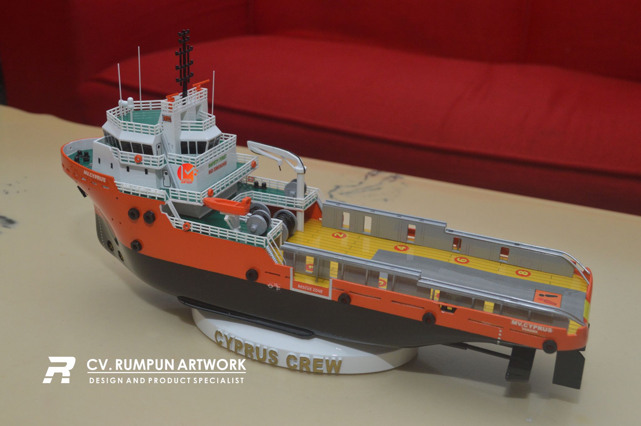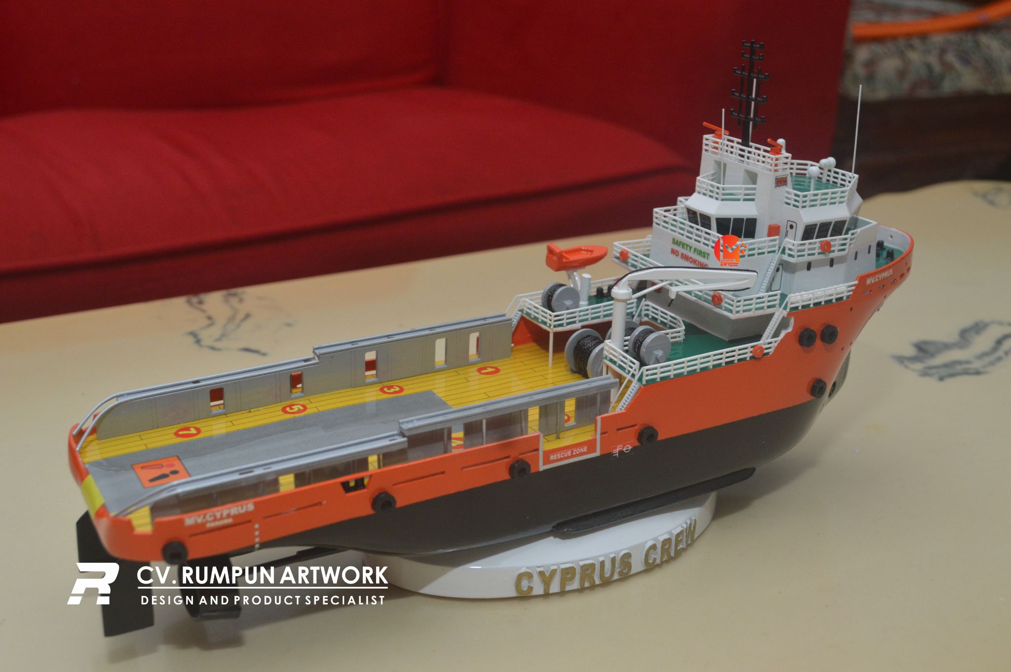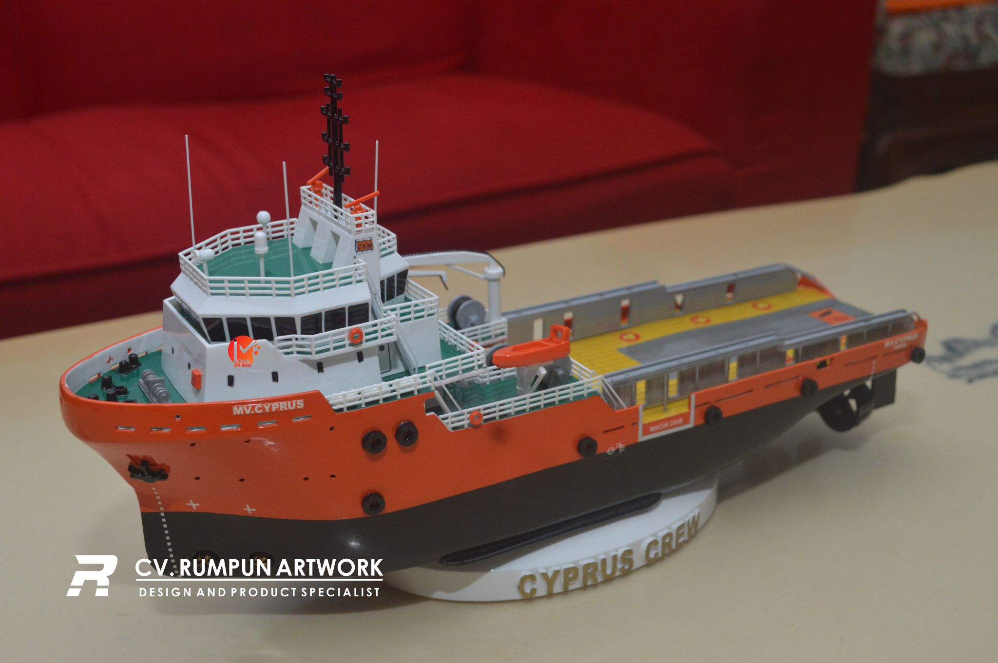 - Miniatur Kapal Supply SV Cyprus ini berbahan dasar fiber, acrylic, resin, artificial part, kayu sebagai tatakan serta dilengkapi pencahayaan dengan lampu led ( optional ), kemudian kami bingkai dengan etalase kaca ( optional )