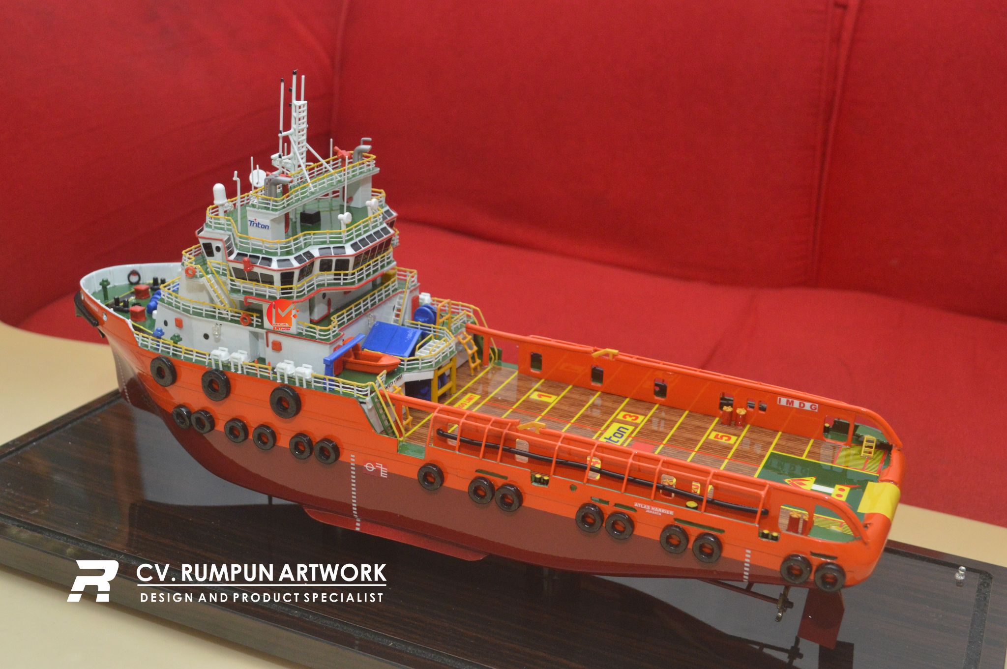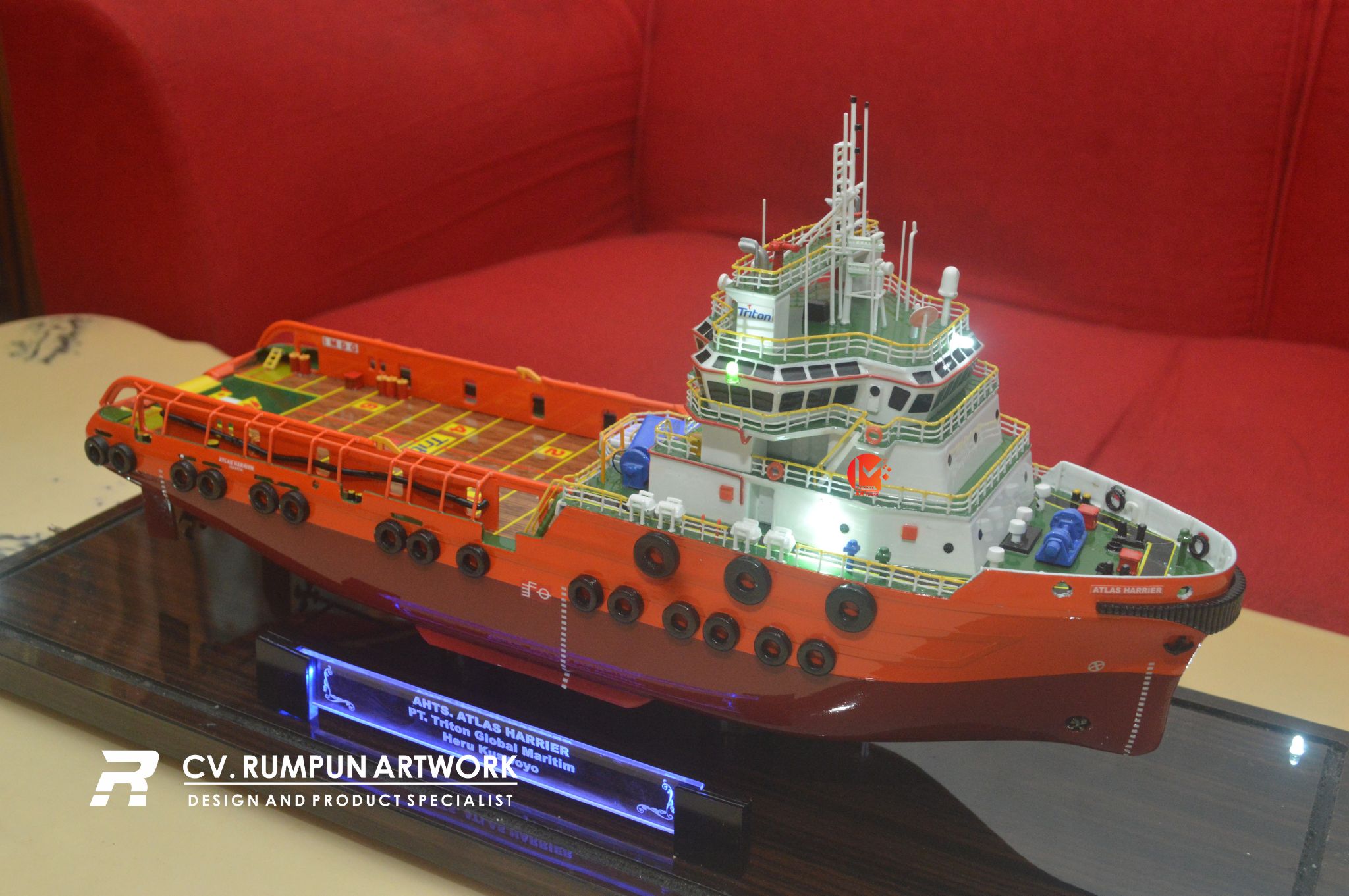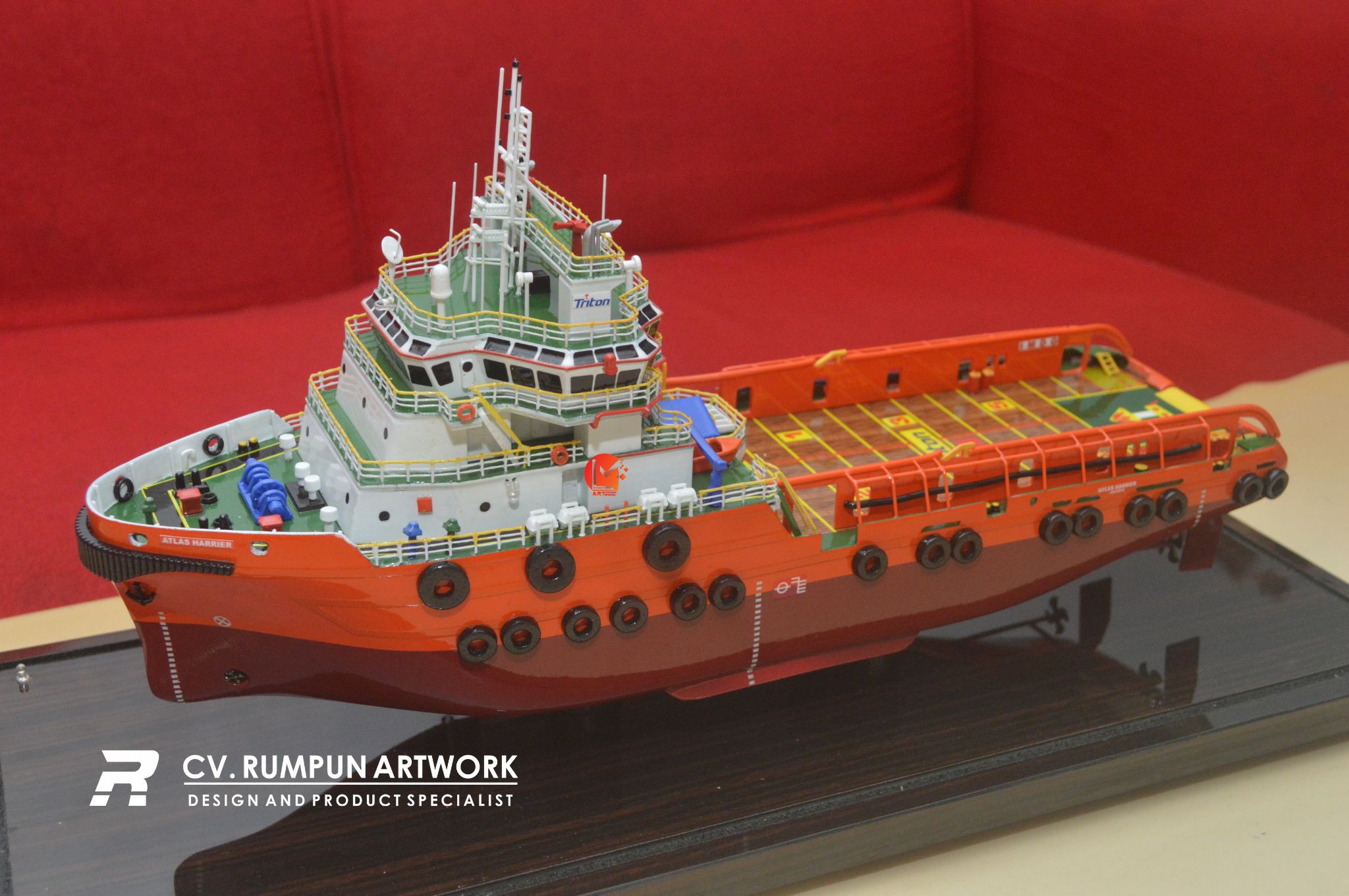 - Miniatur Kapal AHTS Atlas Harrier ini berbahan dasar fiber, acrylic, resin, artificial part, kayu sebagai tatakan serta dilengkapi pencahayaan dengan lampu led ( optional ), kemudian kami bingkai dengan etalase kaca ( optional )