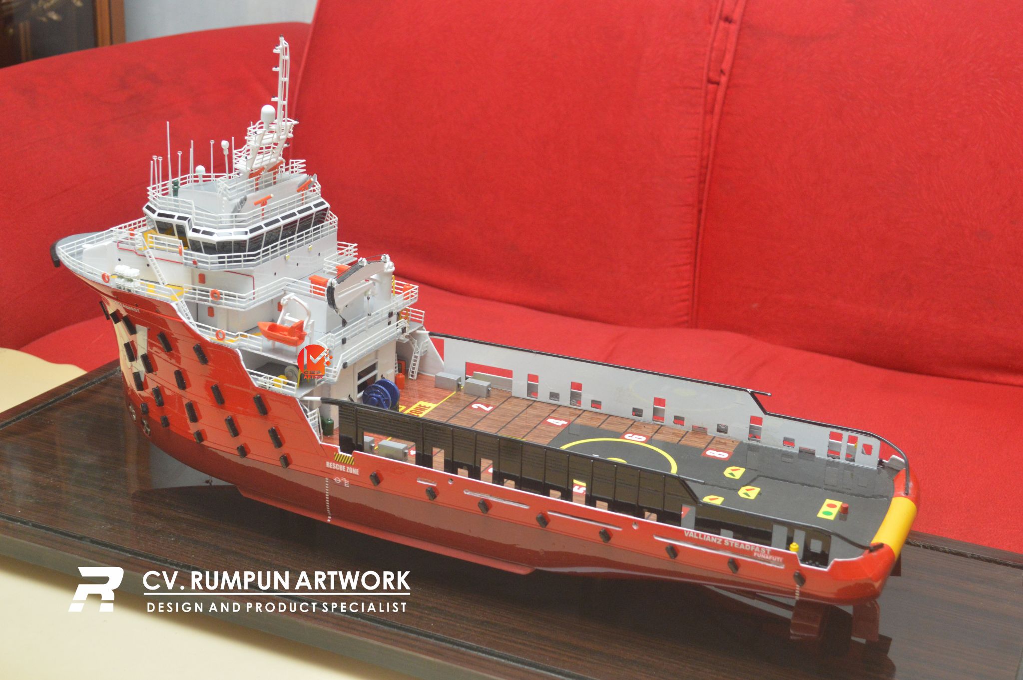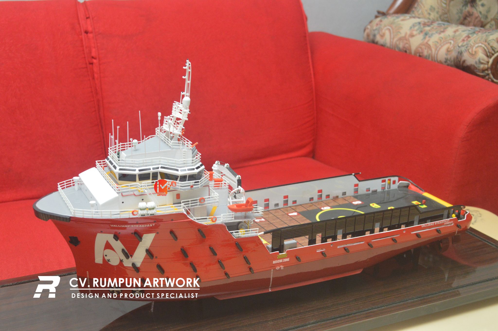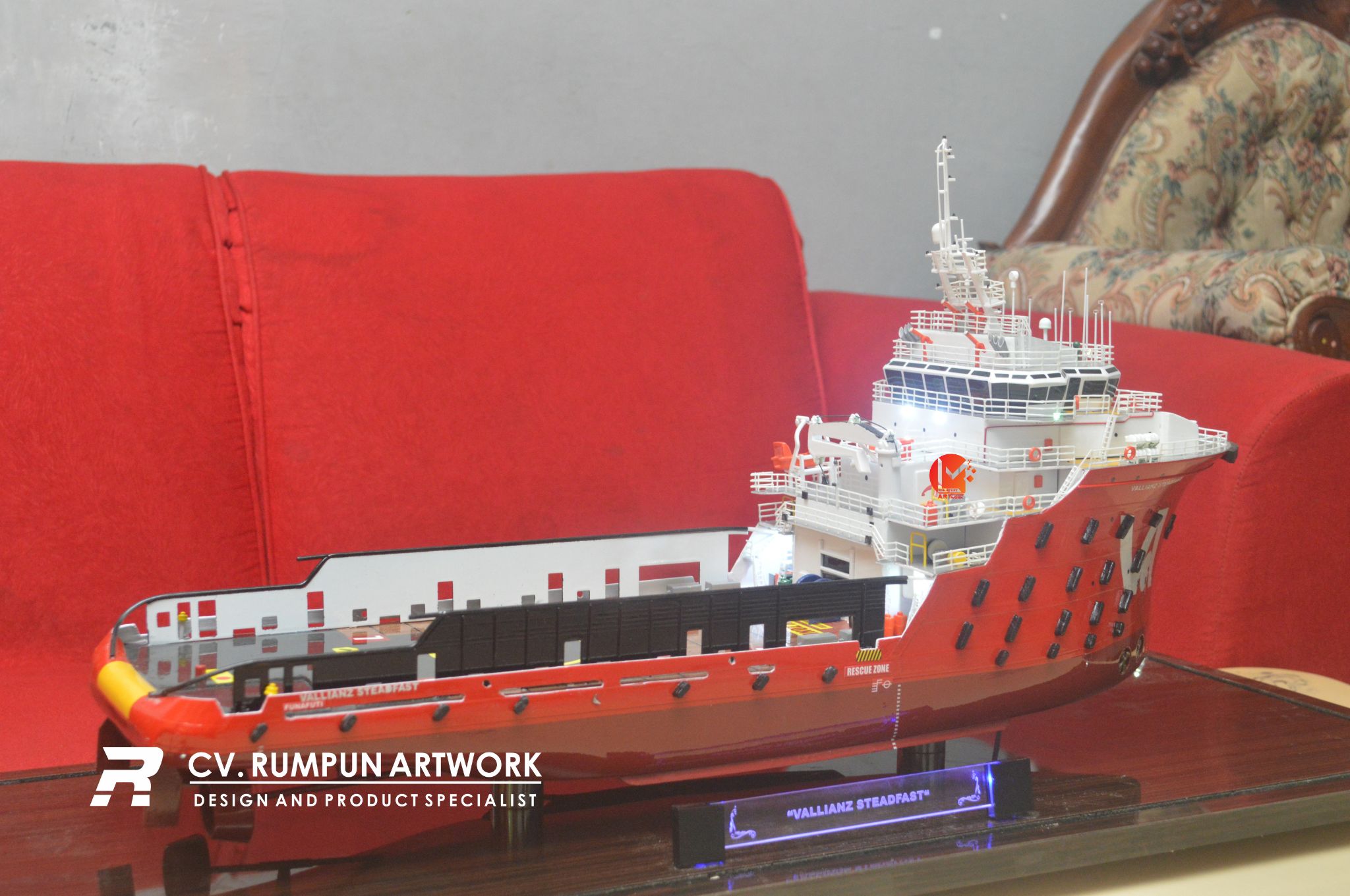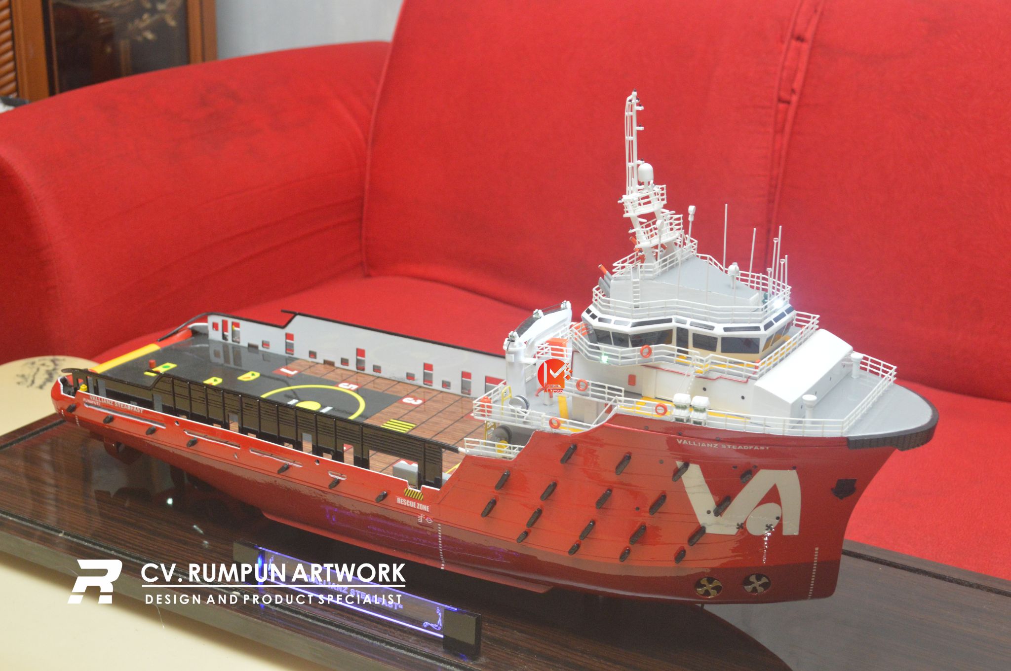 - Miniatur Kapal Offshore Vallians Steadfast ini berbahan dasar fiber, acrylic, resin, artificial part, kayu sebagai tatakan serta dilengkapi pencahayaan dengan lampu led ( optional ), kemudian kami bingkai dengan etalase kaca ( optional ) dibuat dengan berbagai macam ukuran (30 cm, 40 cm, 70 cm, dan 100 cm)