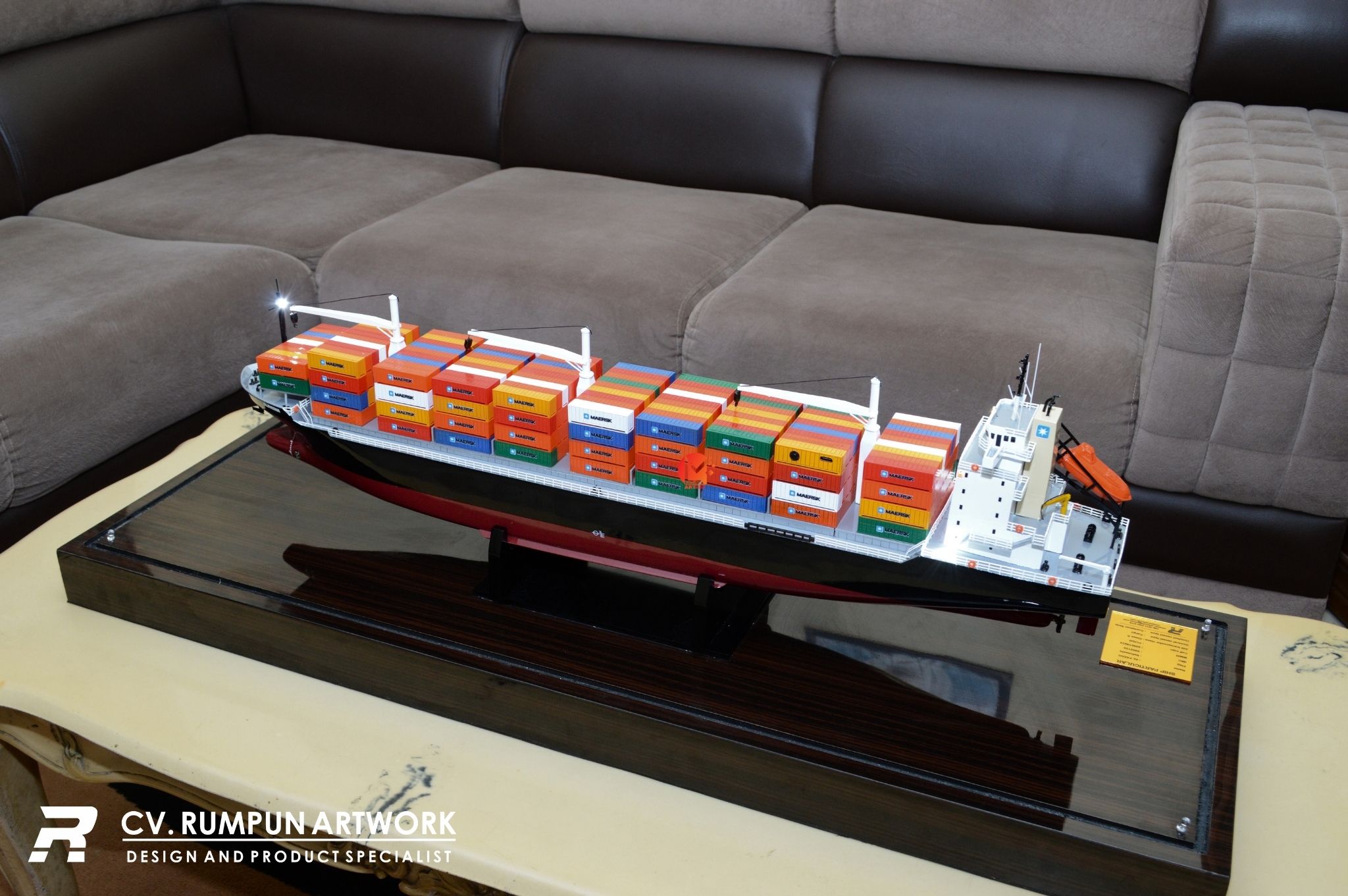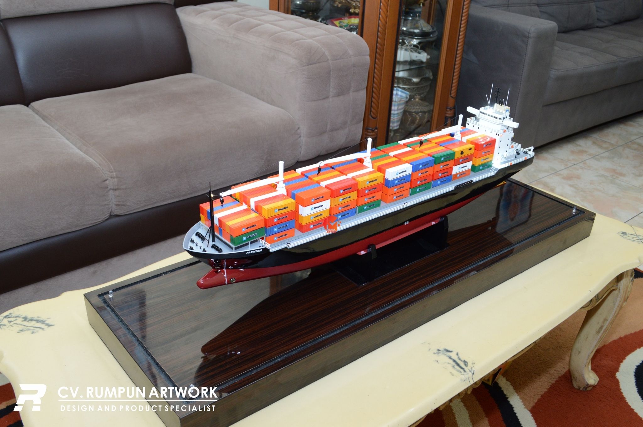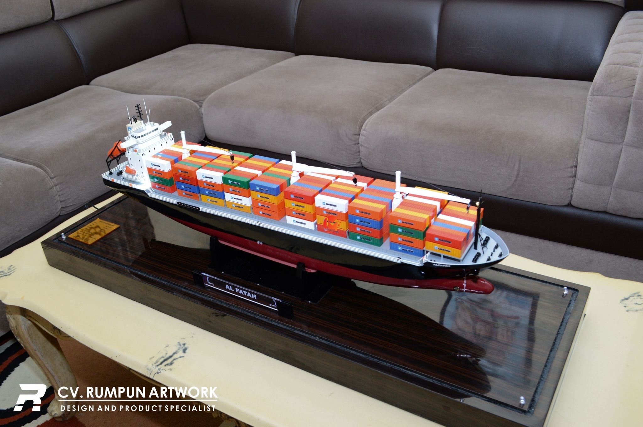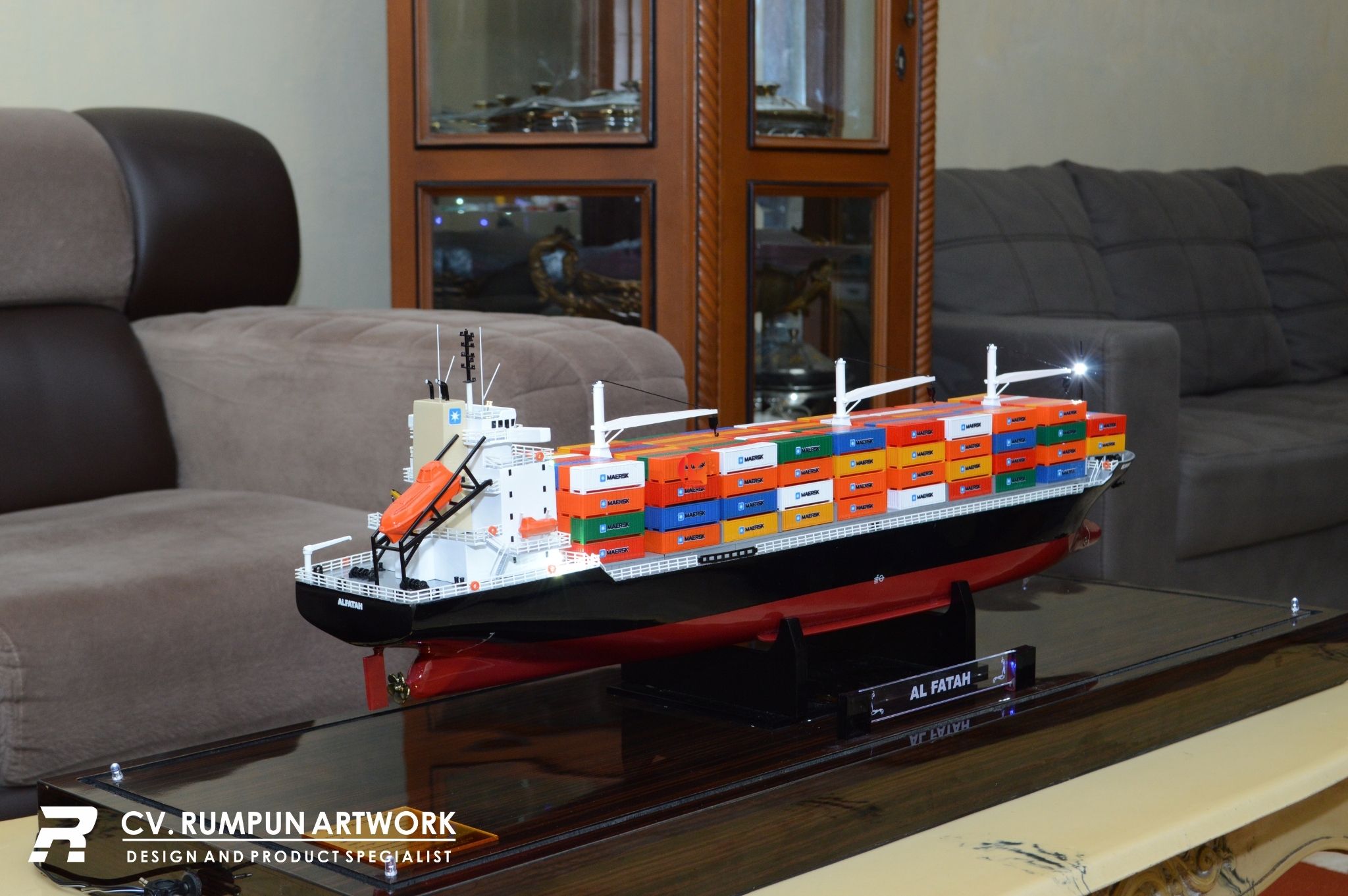 - Miniatur Kapal Kontainer Al-Fatah ini berbahan dasar fiber, akrilik, resin, bagian buatan, kayu sebagai tatakan serta dilengkapi pencahayaan dengan lampu led (opsional), kemudian kami bingkai dengan etalase kaca (opsional) dibuat dengan berbagai macam ukuran (30 cm, 40 cm, 70 cm, dan 100 cm)