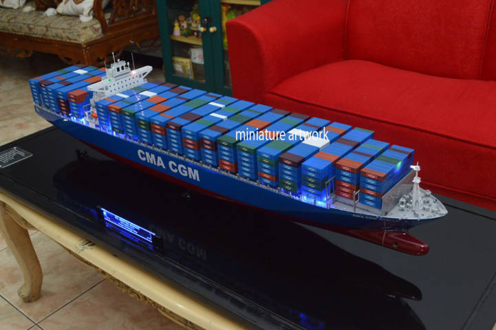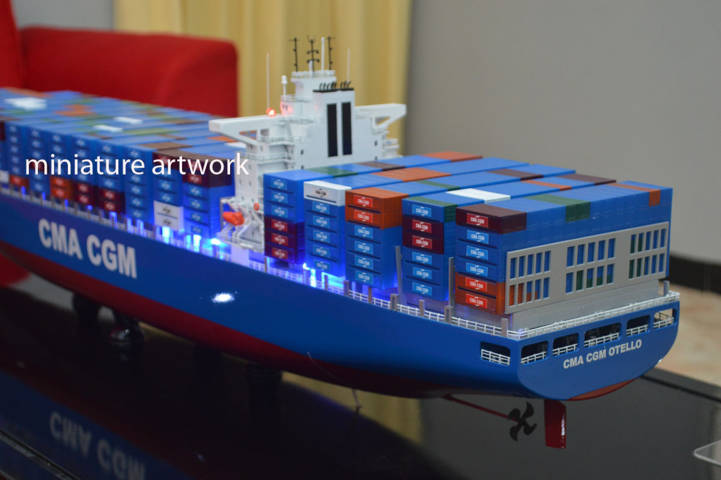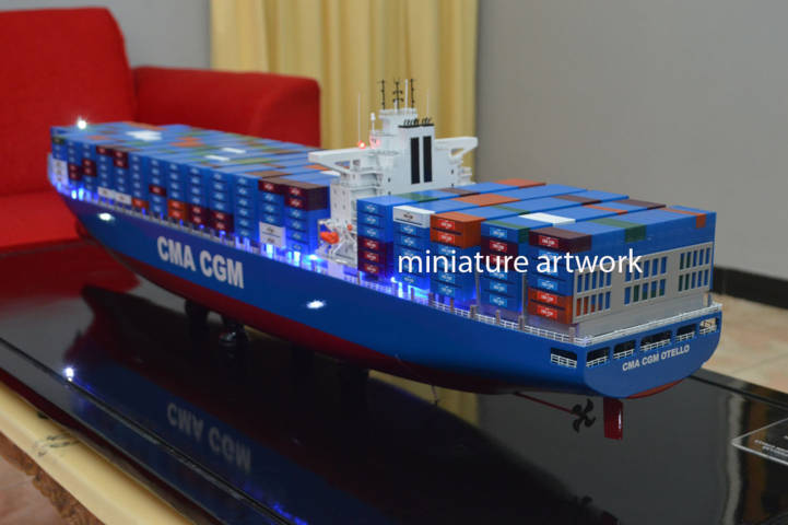 Miniatur kapal Container CMA CGM Othello ini berbahan dasar fiber, acrylic, resin, artificial part, kayu sebagai tatakan serta dilengkapi pencahayaan dengan lampu led ( optional ),