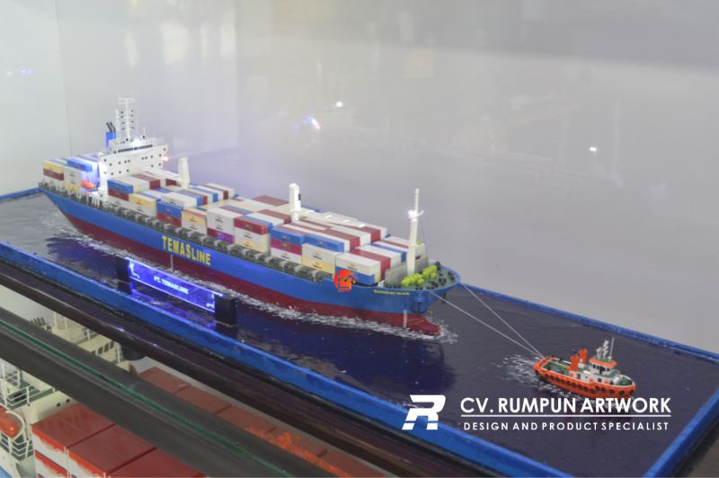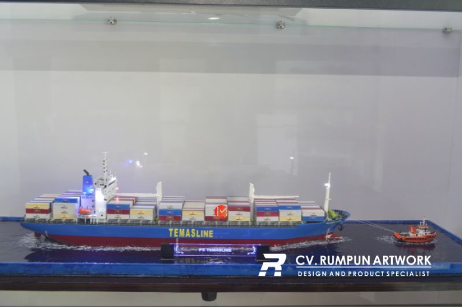 - Miniatur Kapal Container Sungai Mas ini berbahan dasar fiber, acrylic, resin, artificial part, kayu sebagai tatakan serta dilengkapi pencahayaan dengan lampu led ( optional ), kemudian kami bingkai dengan etalase kaca ( optional )