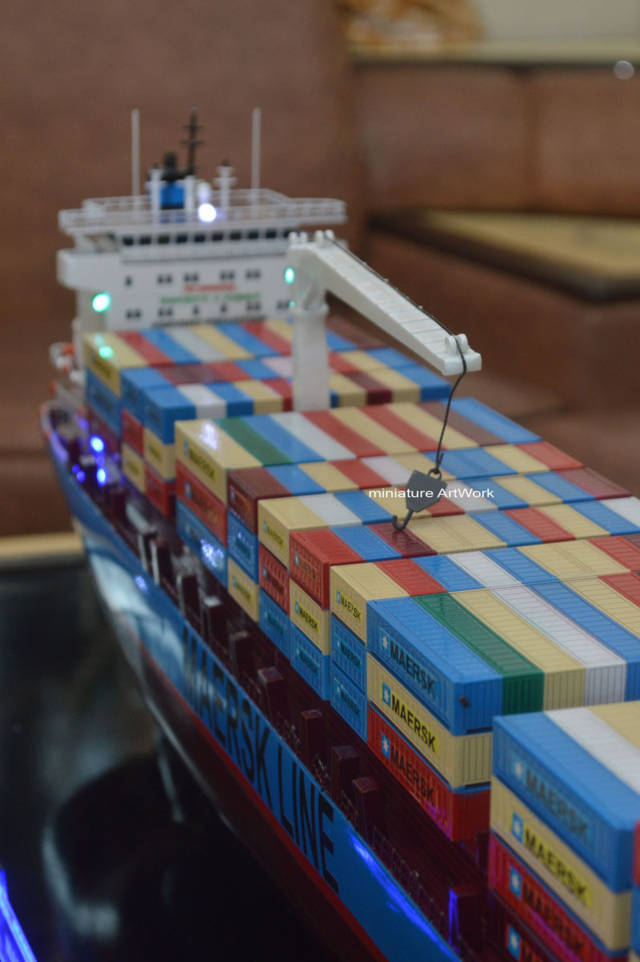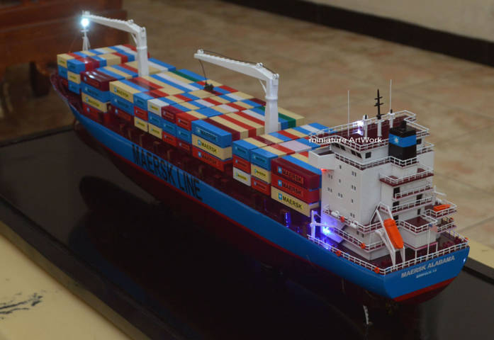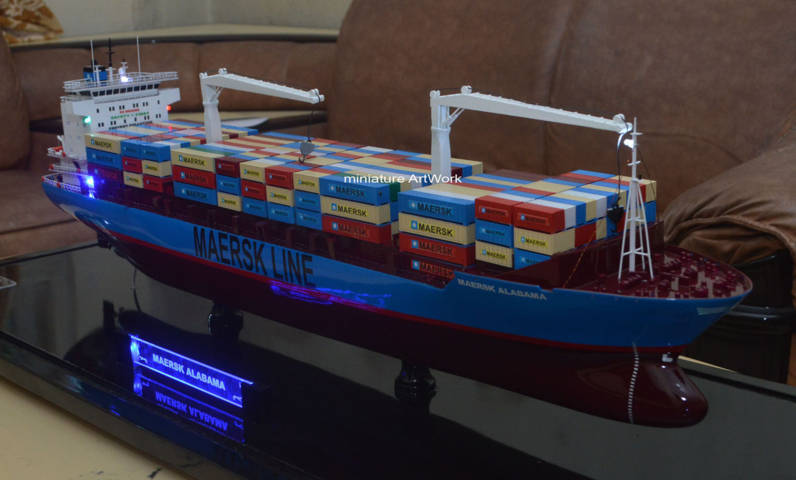 - Miniatur kapal Container Maersk Alabama ini berbahan dasar fiber, acrylic, resin, artificial part, kayu sebagai tatakan serta dilengkapi pencahayaan dengan lampu led ( optional ),