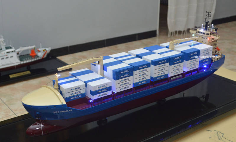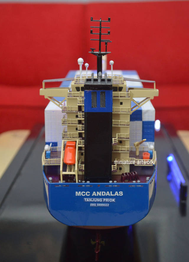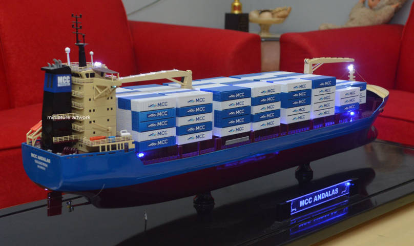 - Miniatur kapal Container MCC Andalas ini berbahan dasar fiber, acrylic, resin, artificial part, kayu sebagai tatakan serta dilengkapi pencahayaan dengan lampu led ( optional ),