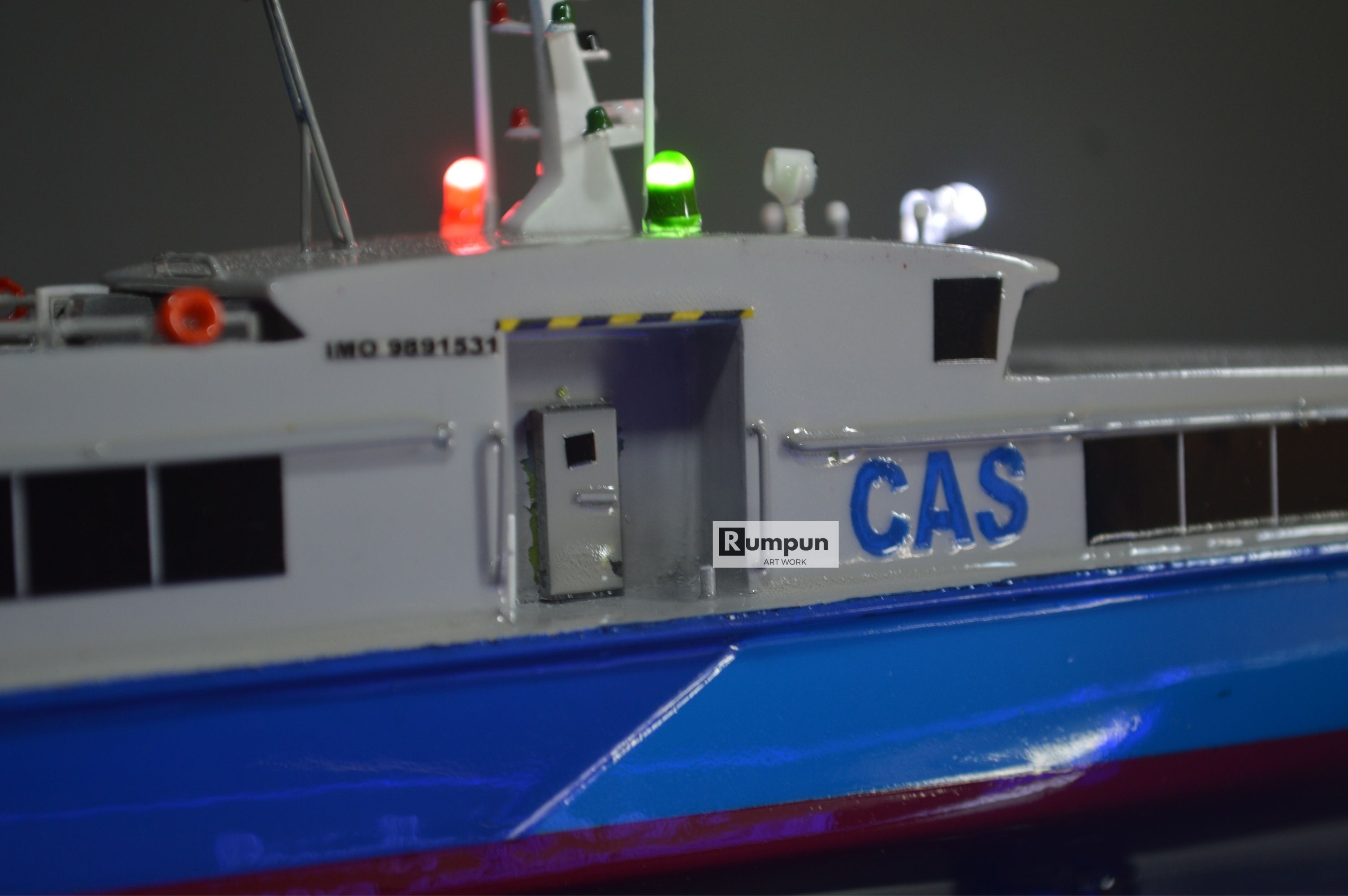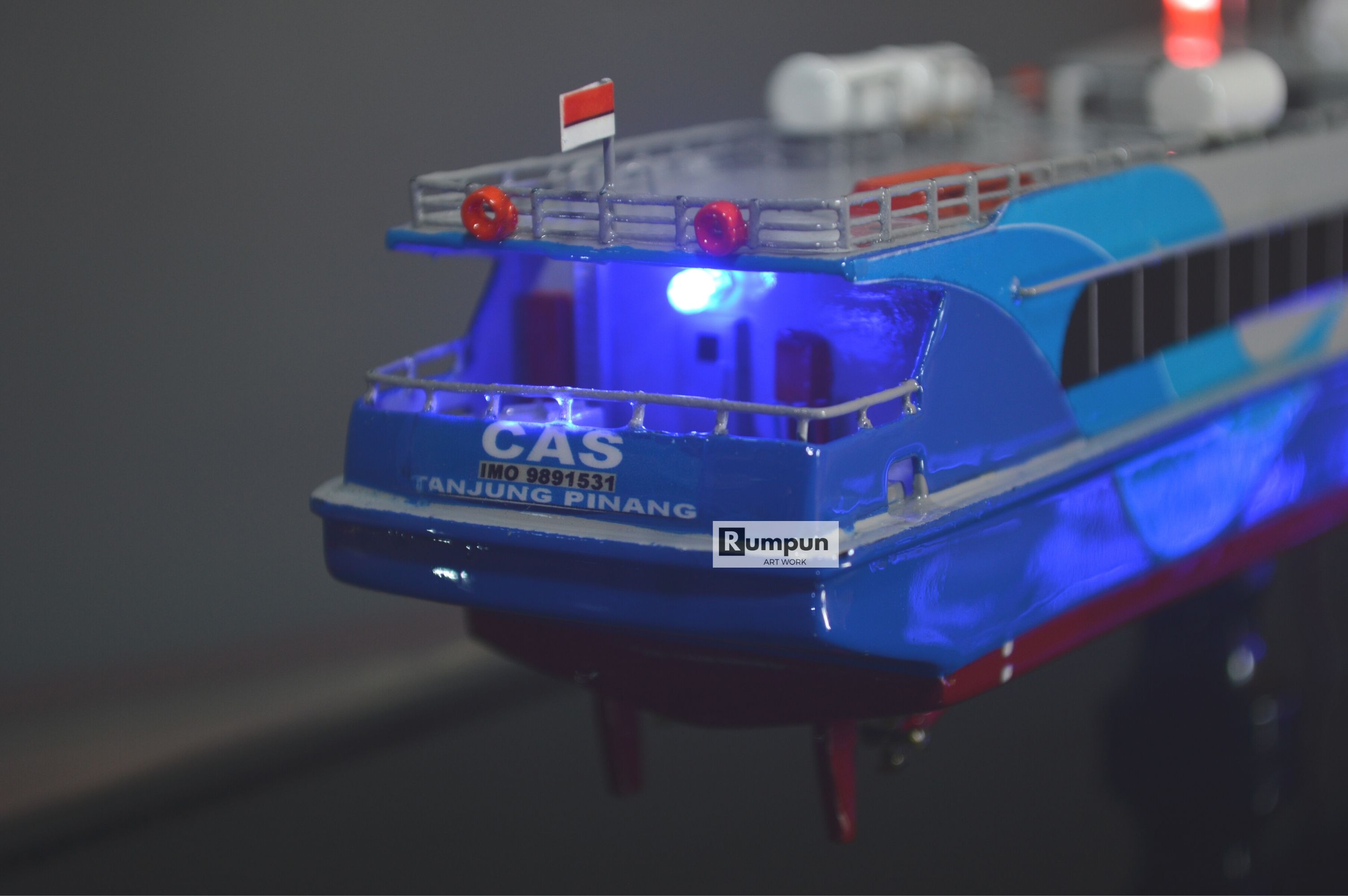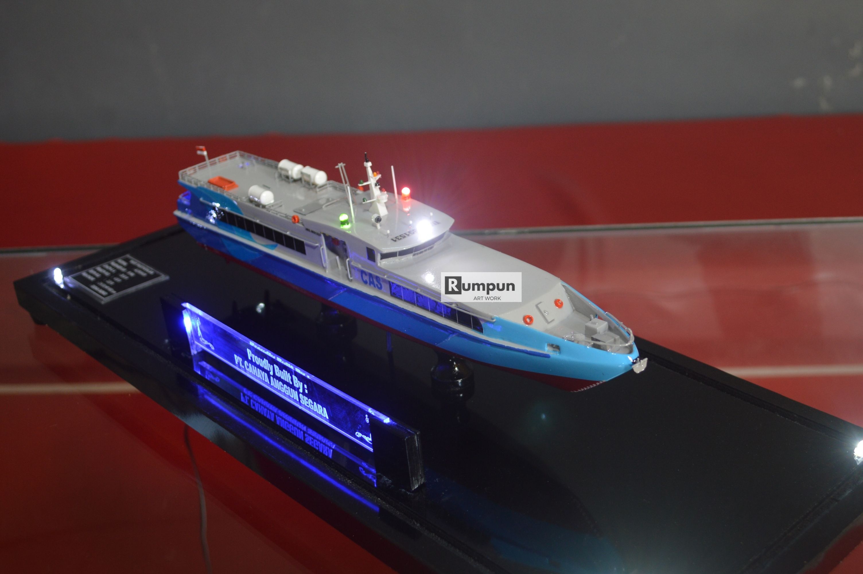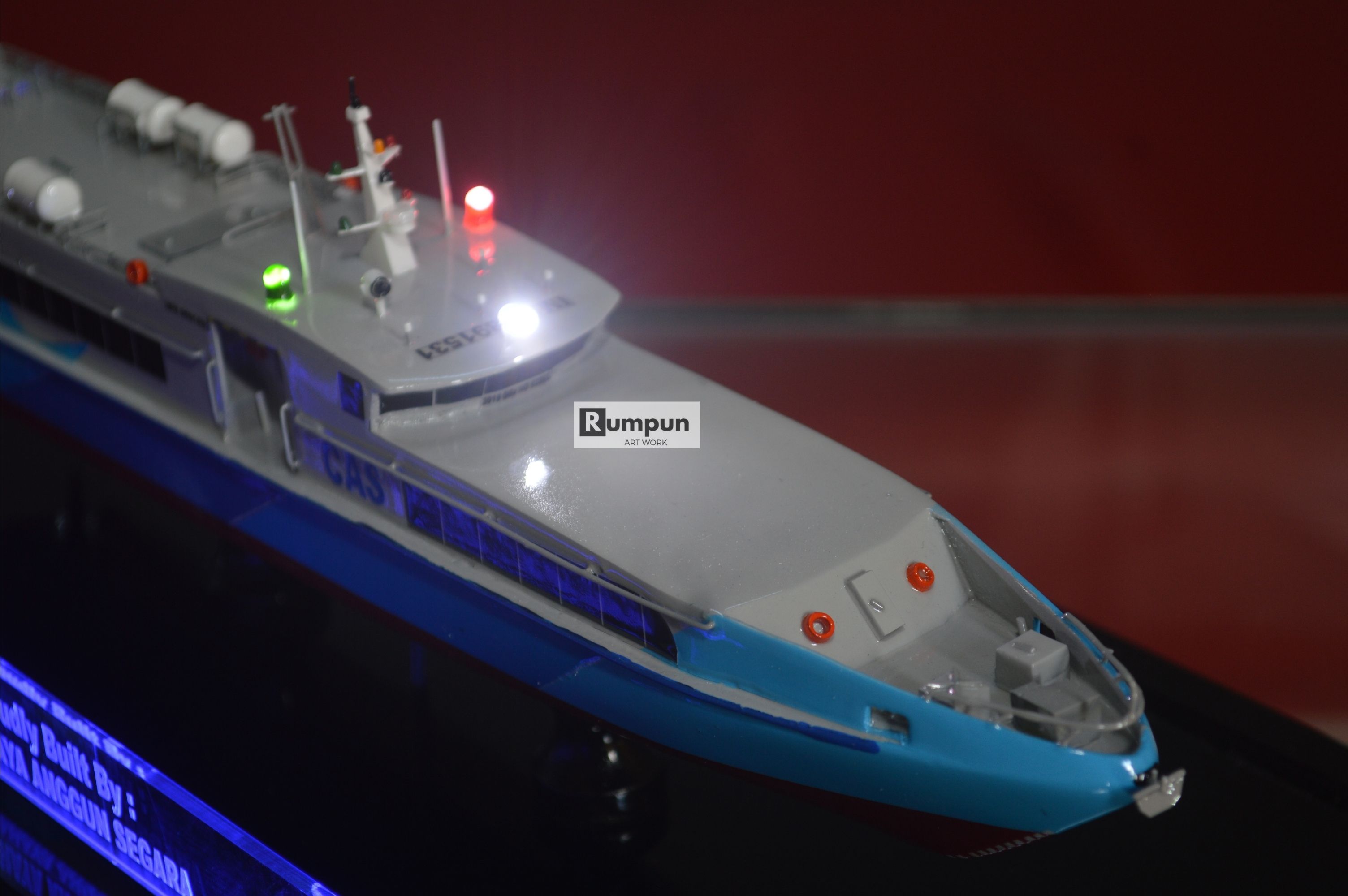 - Miniatur kapal Crew Boat Cahaya Marine ini berbahan dasar fiber, acrylic, resin, artificial part, kayu sebagai tatakan serta dilengkapi pencahayaan dengan lampu led (optional), kemudian kami bingkai dengan etalase kaca (optional).