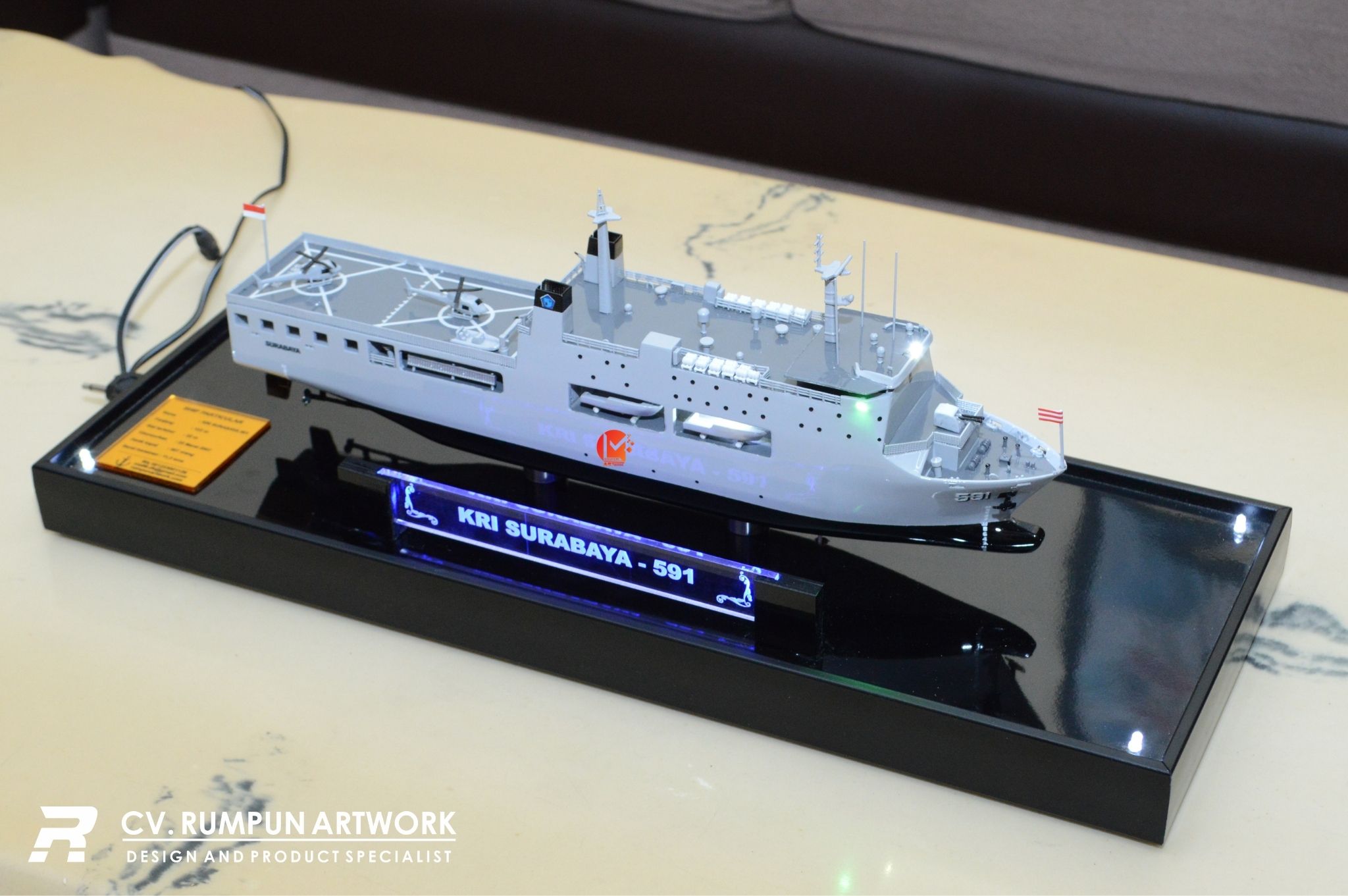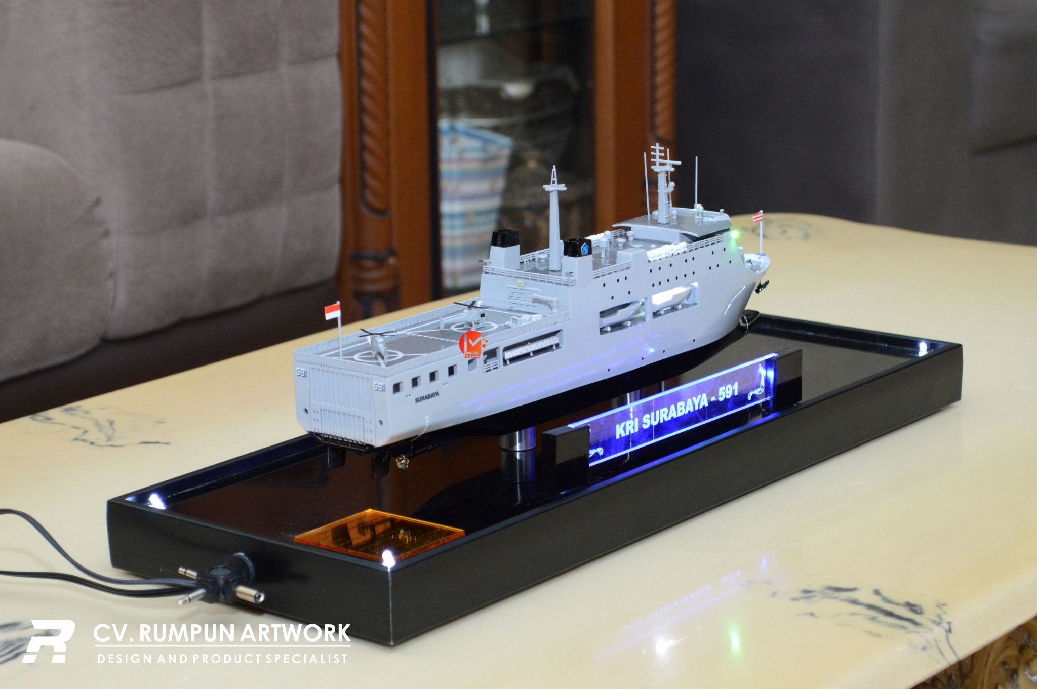 - Miniatur Kapal Perang KRI Surabaya ini berbahan dasar fiber, akrilik, resin, bagian buatan, kayu sebagai tatakan serta dilengkapi pencahayaan dengan lampu led (opsional), kemudian kami bingkai dengan etalase kaca (opsional) dibuat dengan berbagai macam ukuran (30 cm, 40 cm, 70 cm, dan 100 cm)