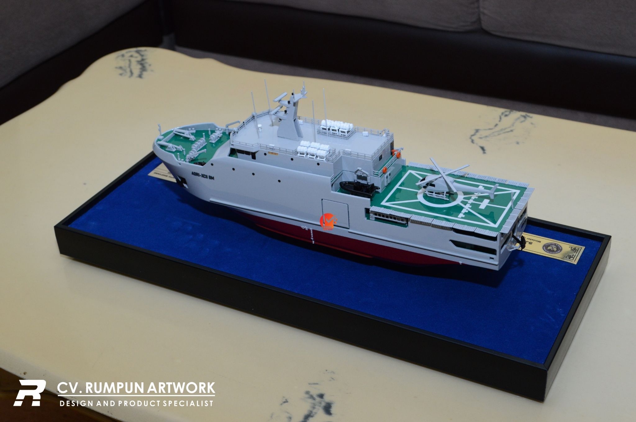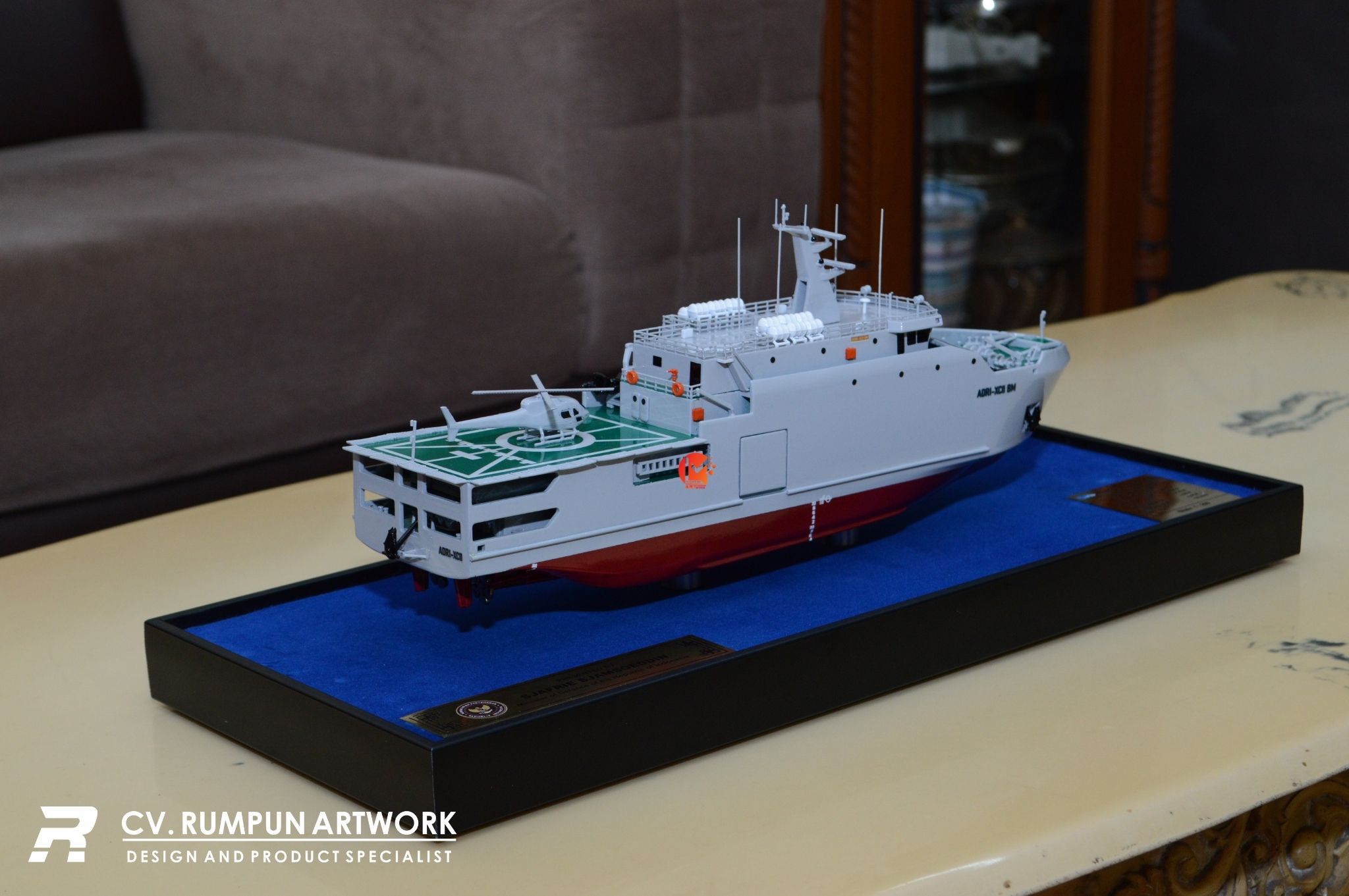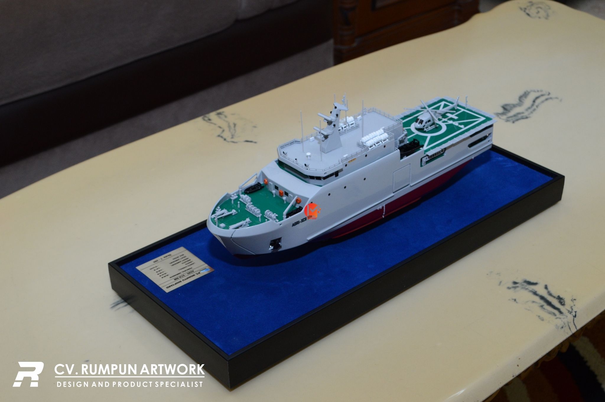 - Miniatur Kapal KRI ADRI ini berbahan dasar fiber, akrilik, resin, bagian buatan, kayu sebagai tatakan serta dilengkapi pencahayaan dengan lampu led (opsional), kemudian kami bingkai dengan etalase kaca (opsional) dibuat dengan berbagai macam ukuran (30 cm, 40 cm, 70 cm, dan 100 cm)