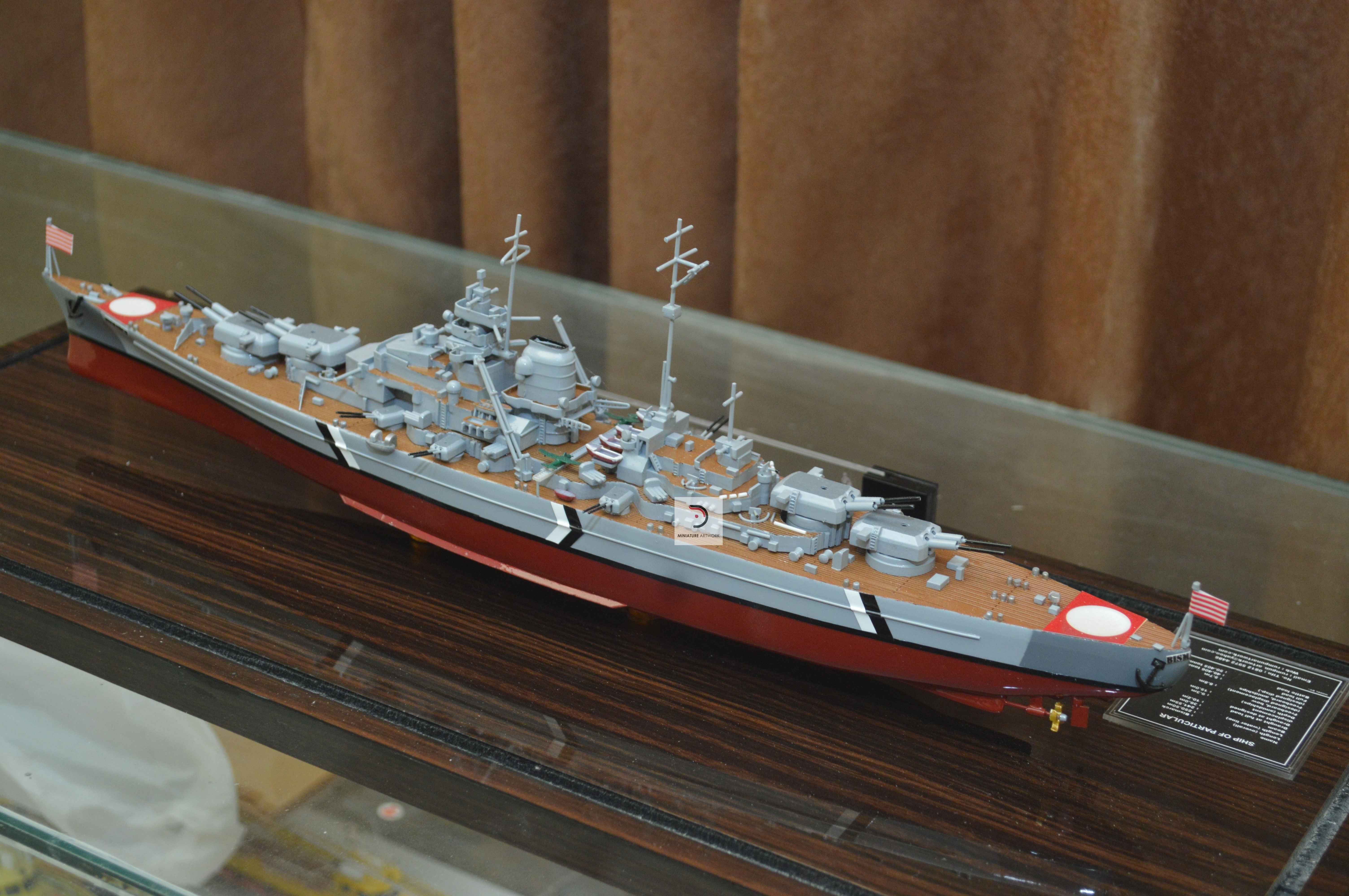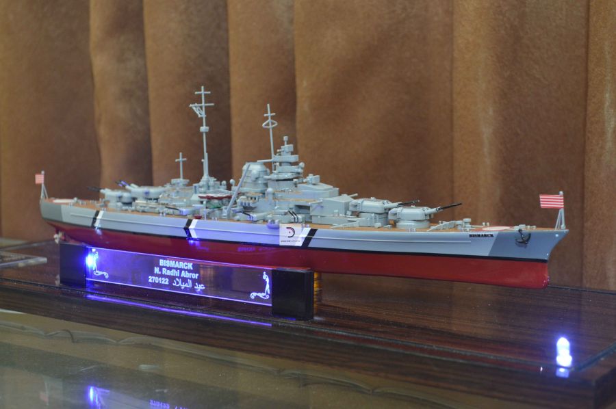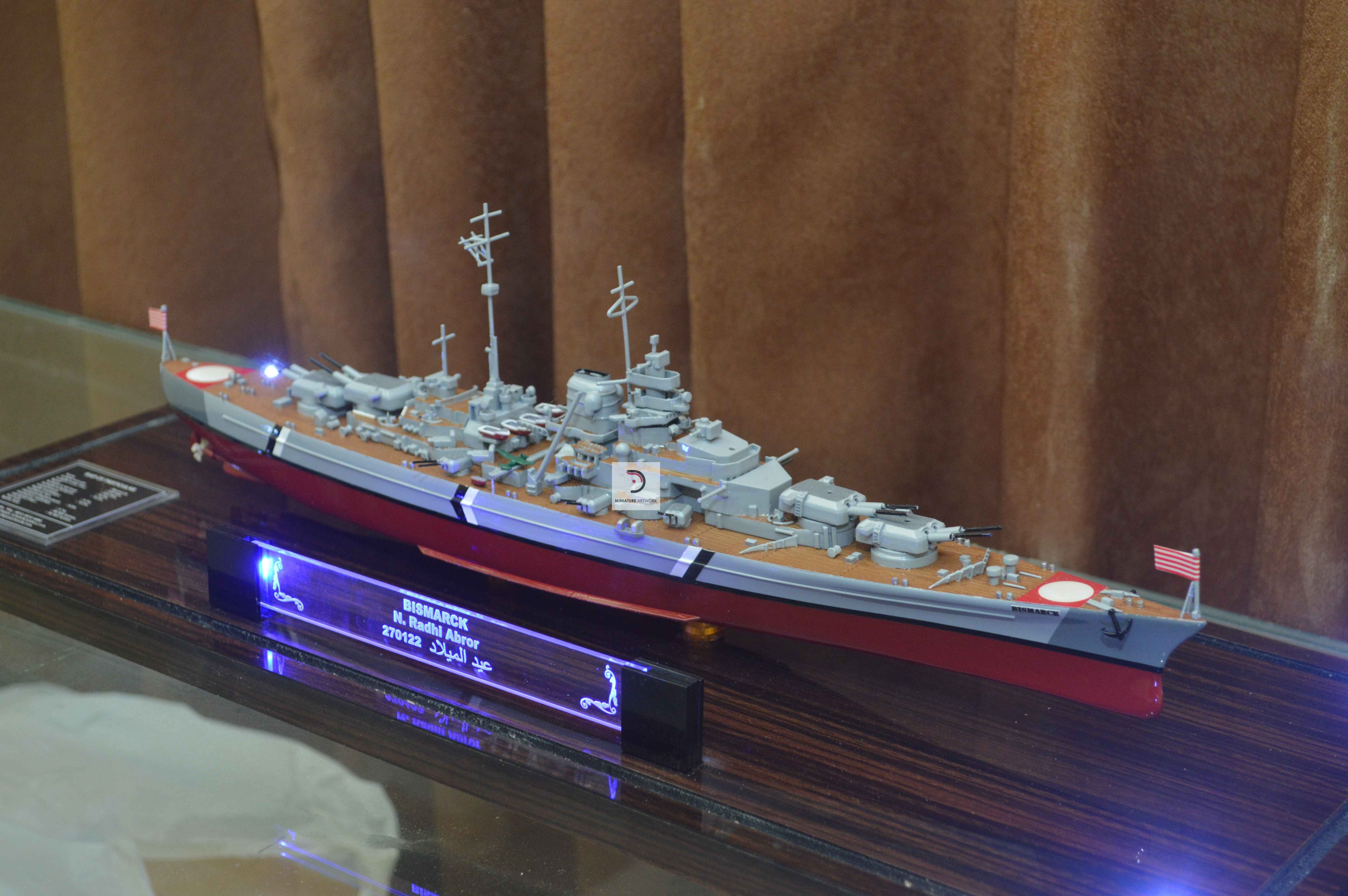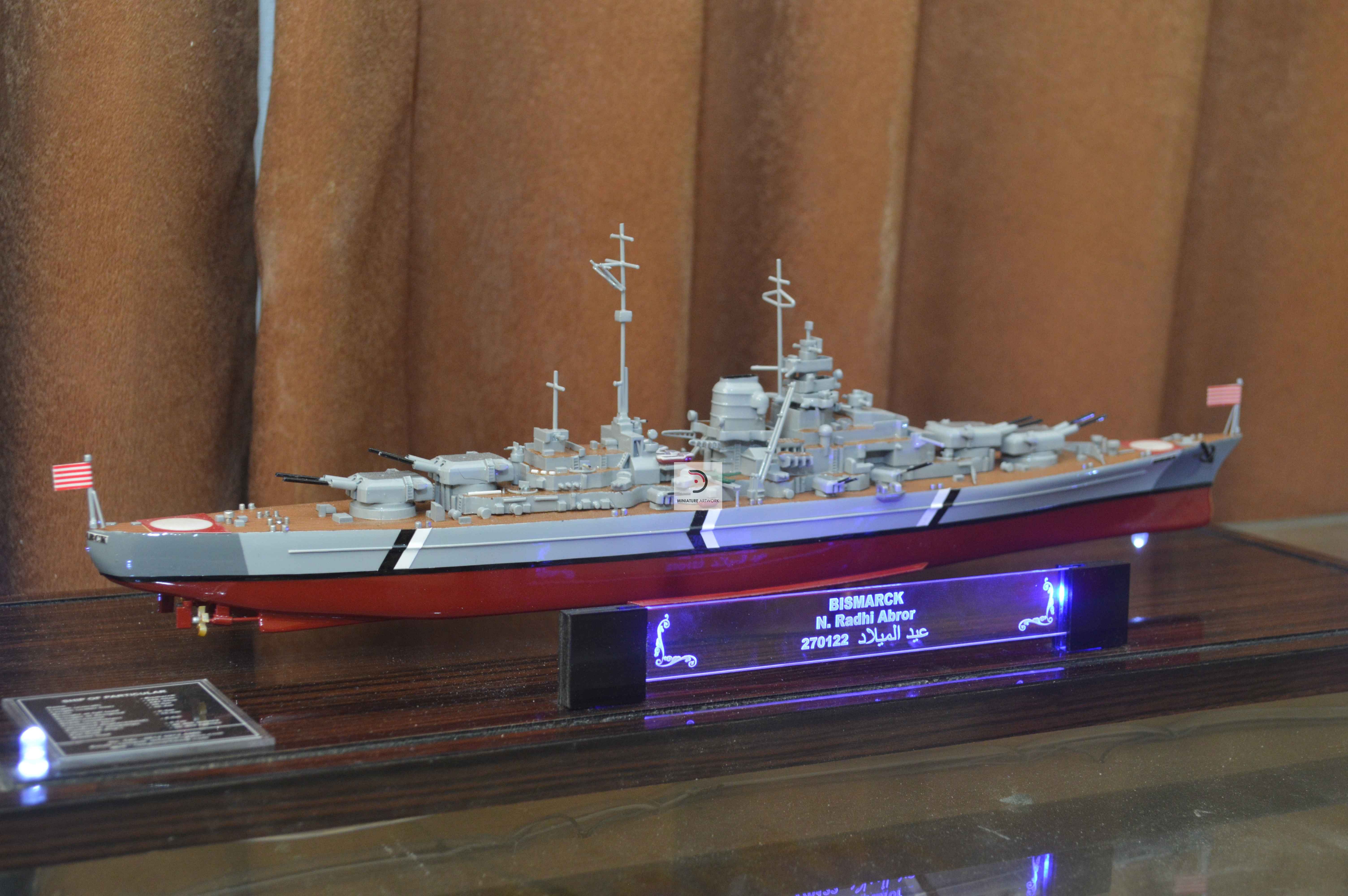 - Miniatur Kapal KRI Bismarck ini berbahan dasar fiber, acrylic, resin, artificial part, kayu sebagai tatakan serta dilengkapi pencahayaan dengan lampu led ( optional ), kemudian kami bingkai dengan etalase kaca ( optional )