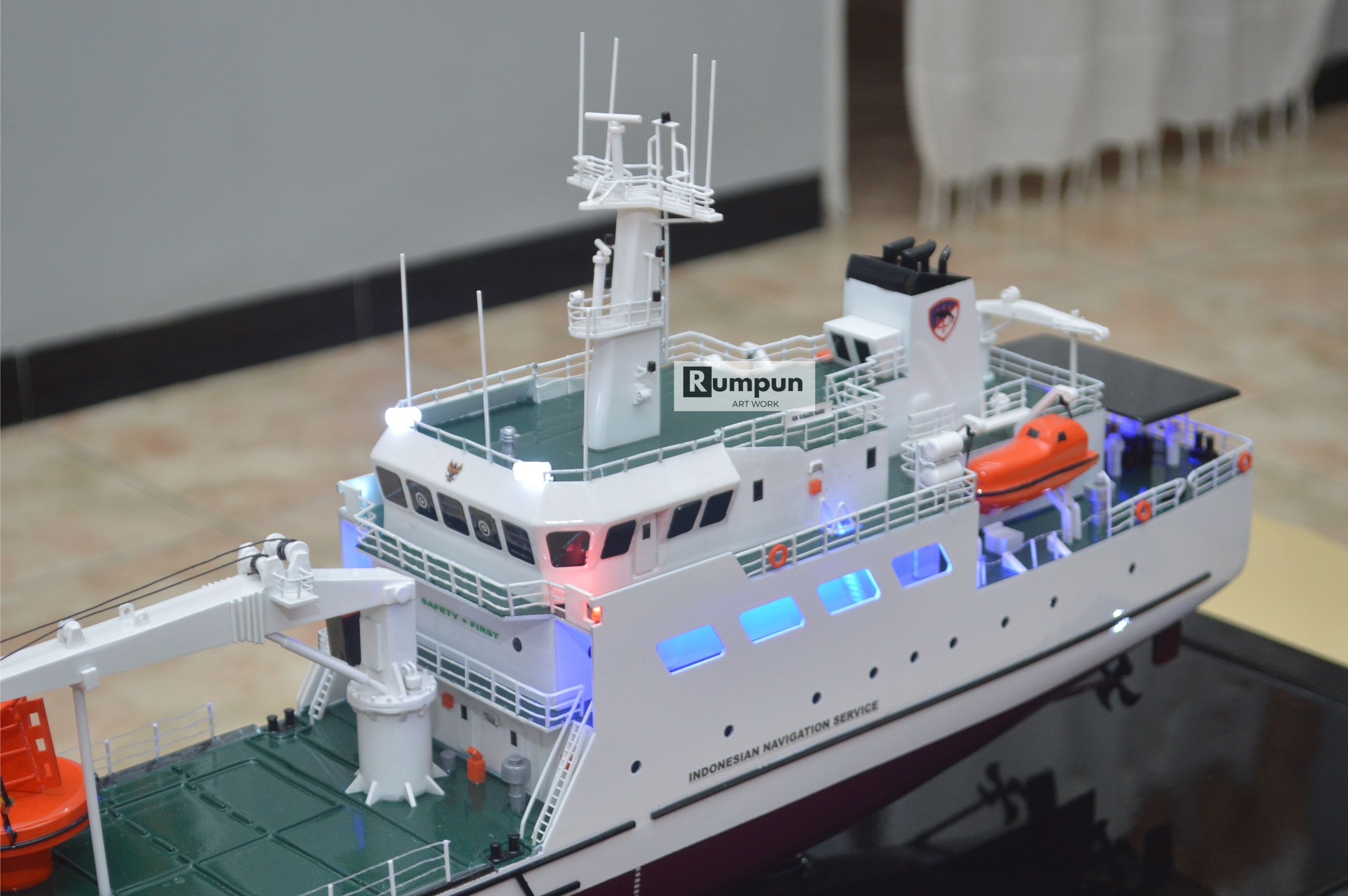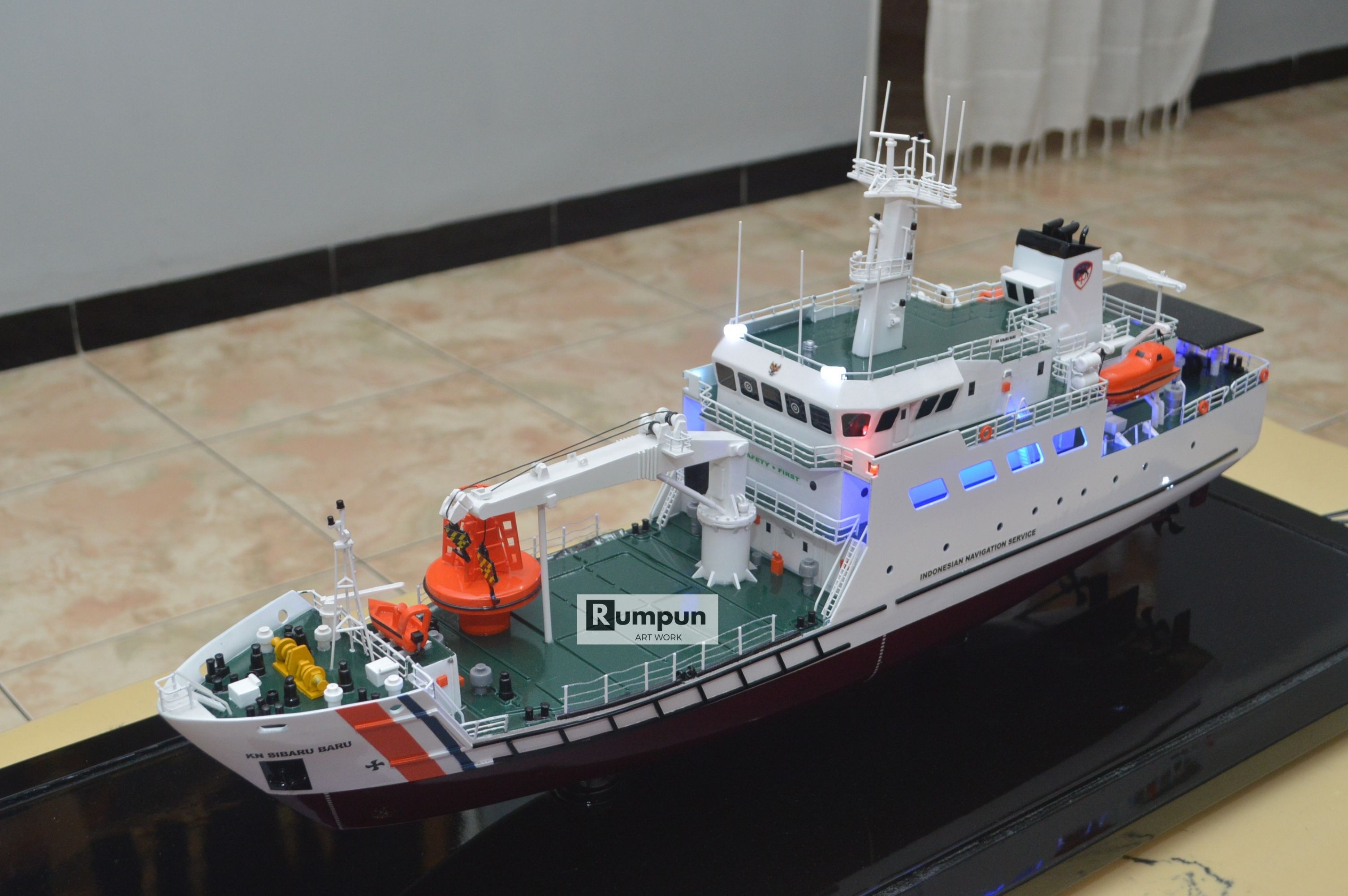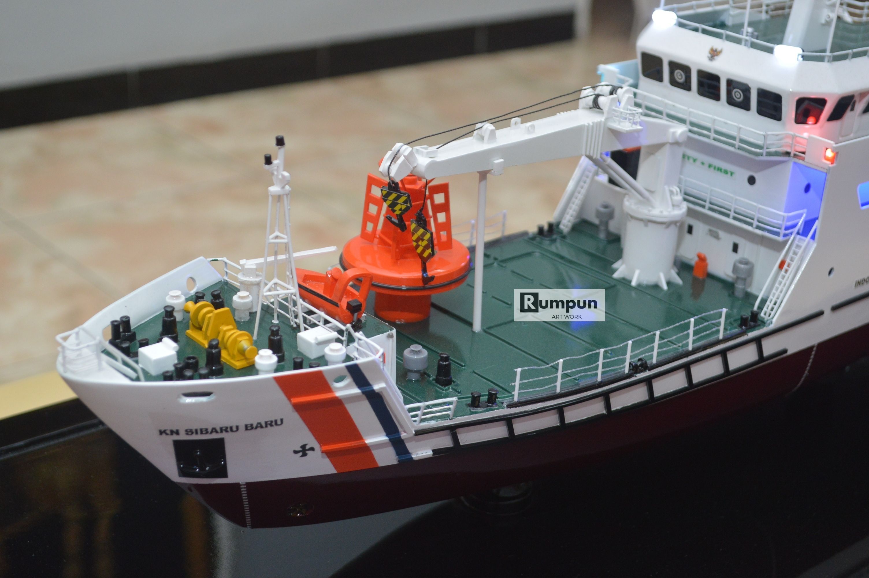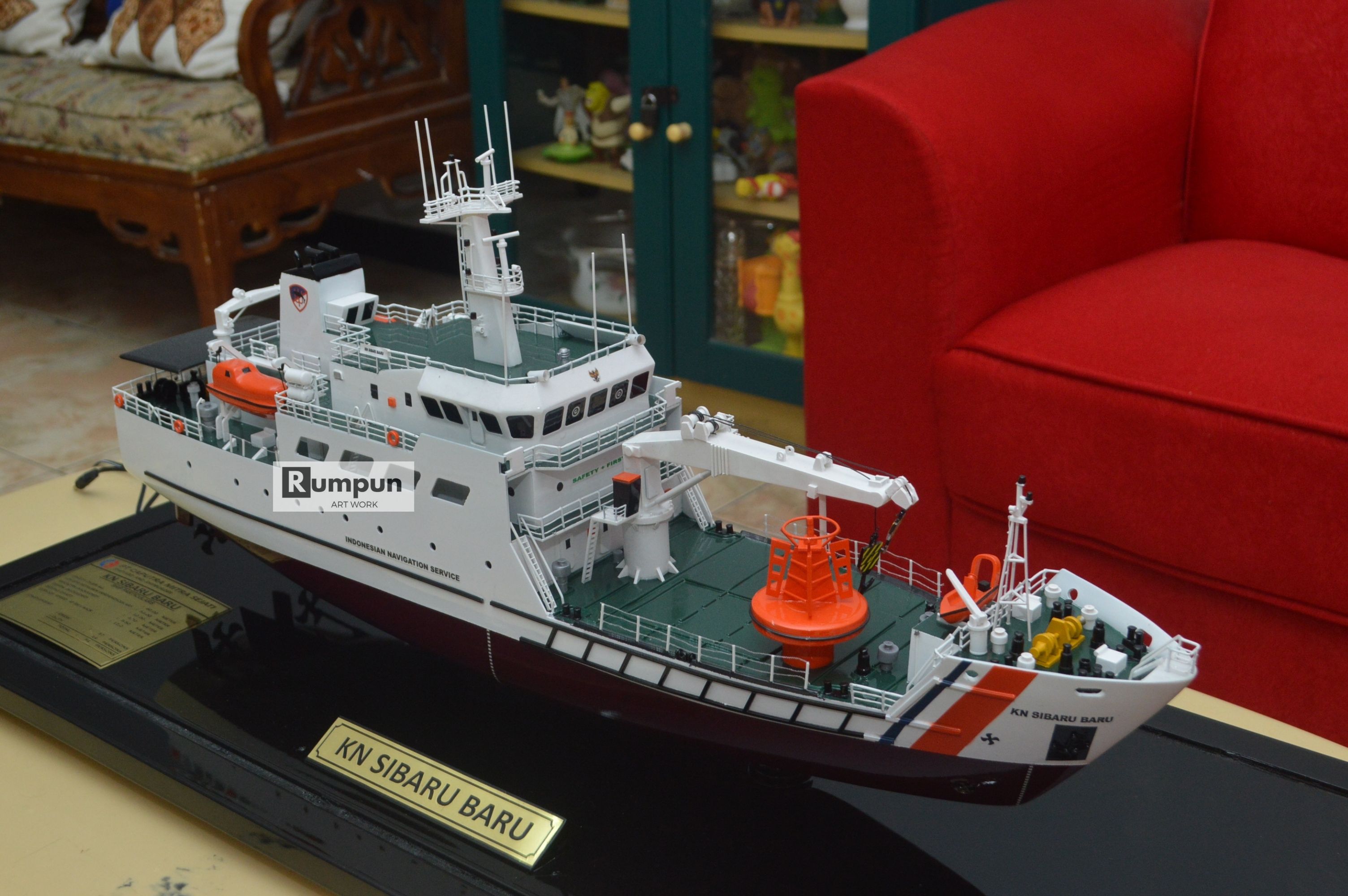 - Miniatur Kapal Survey KN Sibaru Baru ini berbahan dasar fiber, acrylic, resin, artificial part, kayu sebagai tatakan serta dilengkapi pencahayaan dengan lampu led ( optional ), kemudian kami bingkai dengan etalase kaca ( optional ).