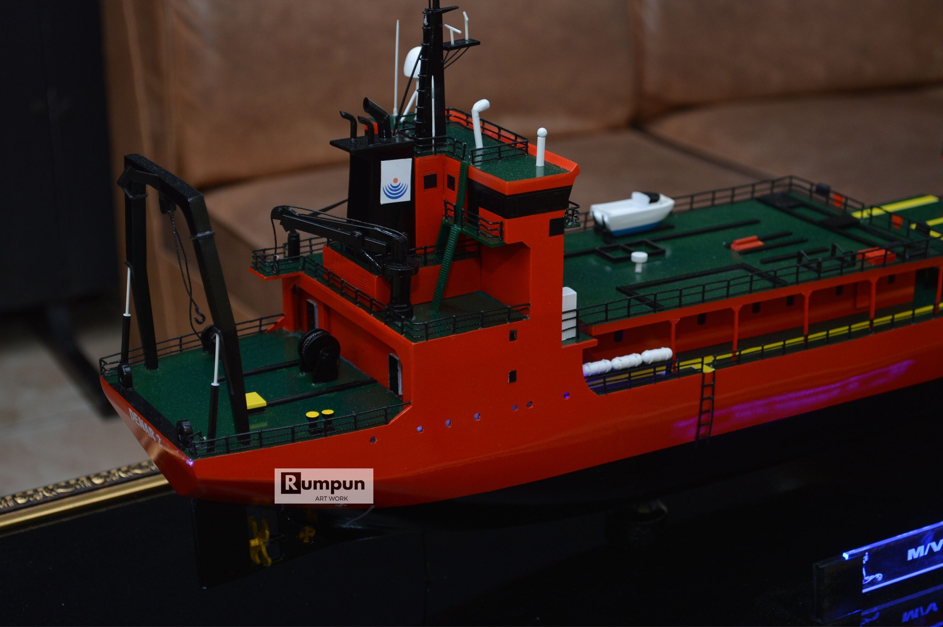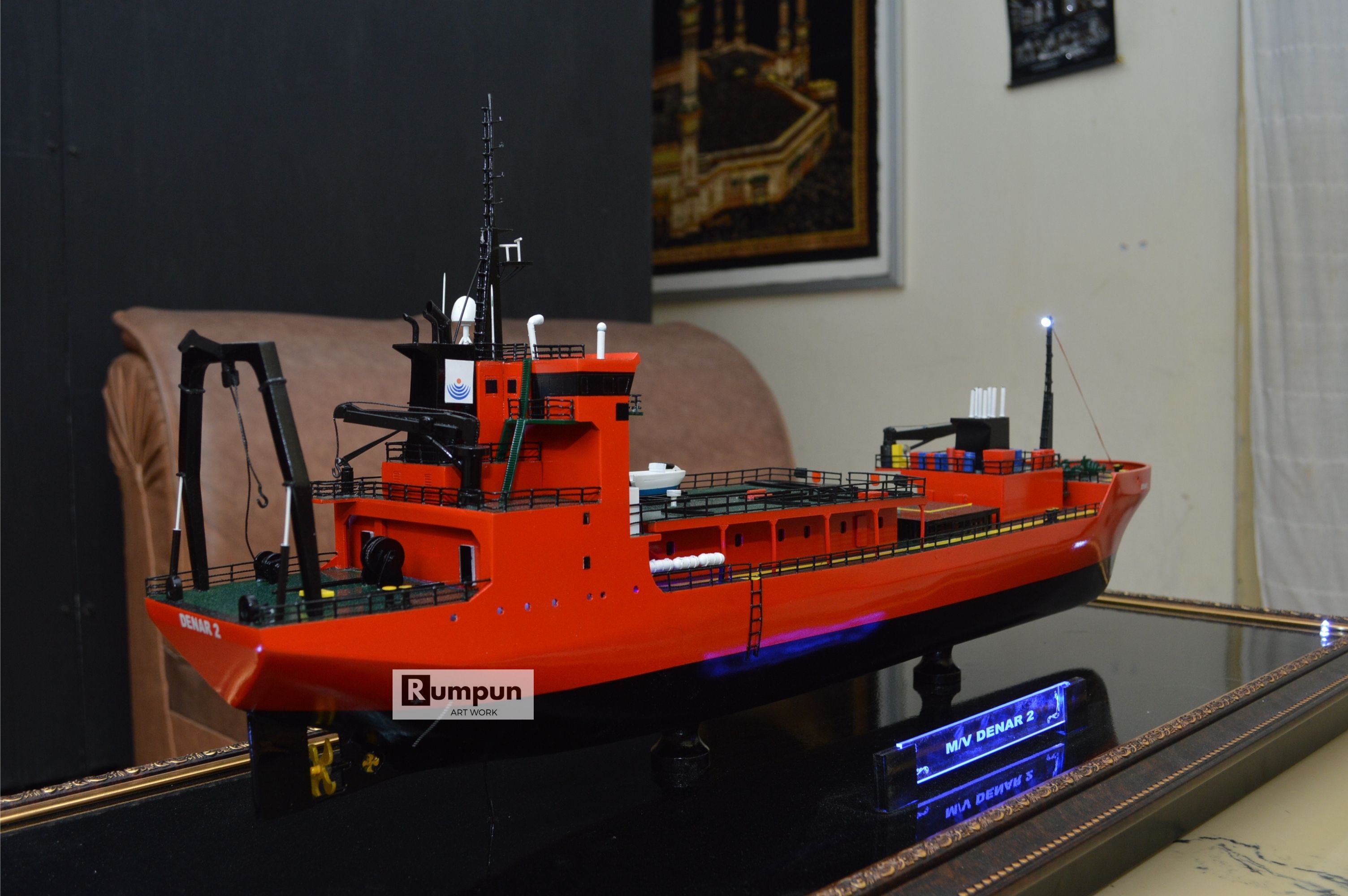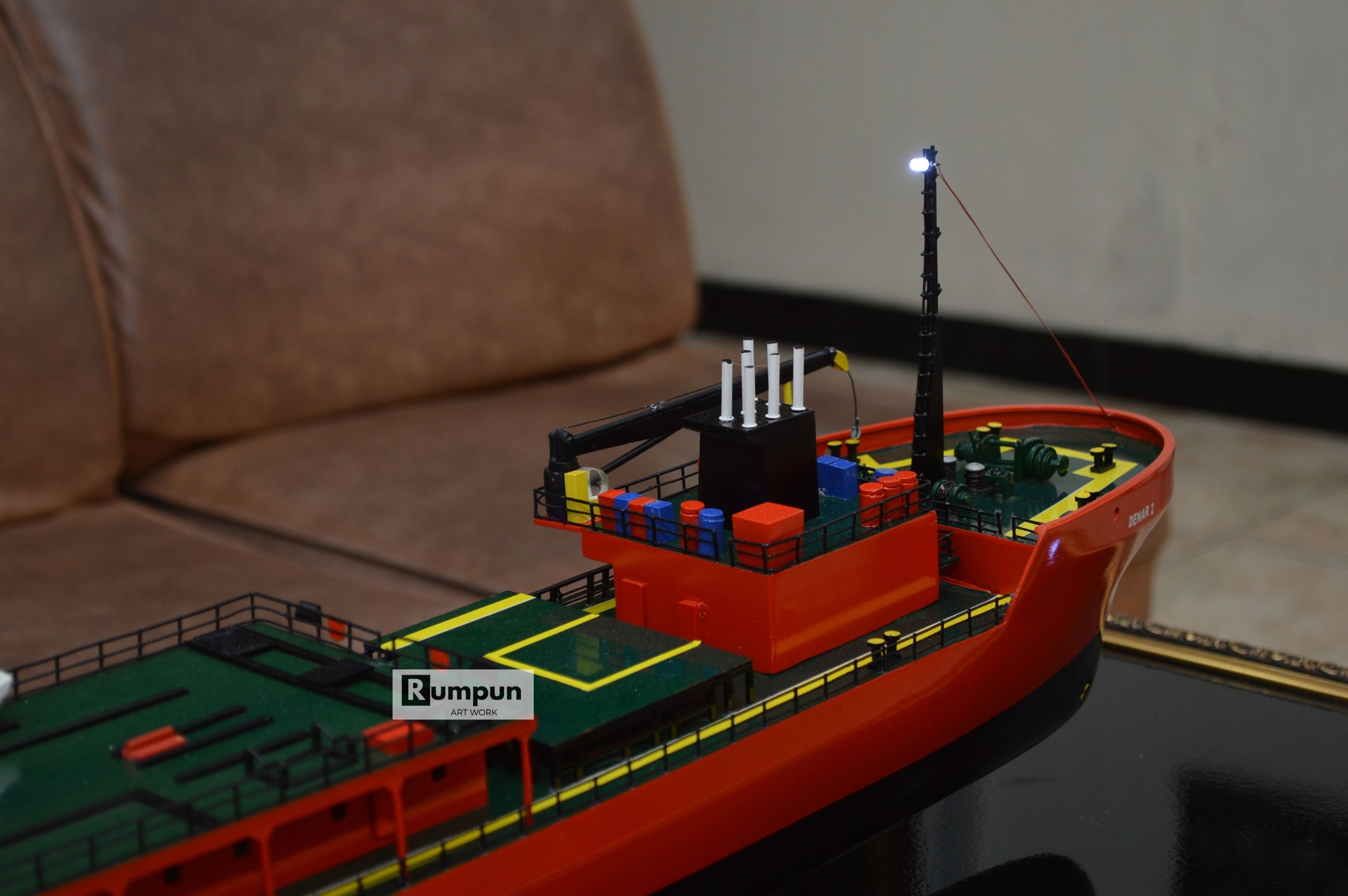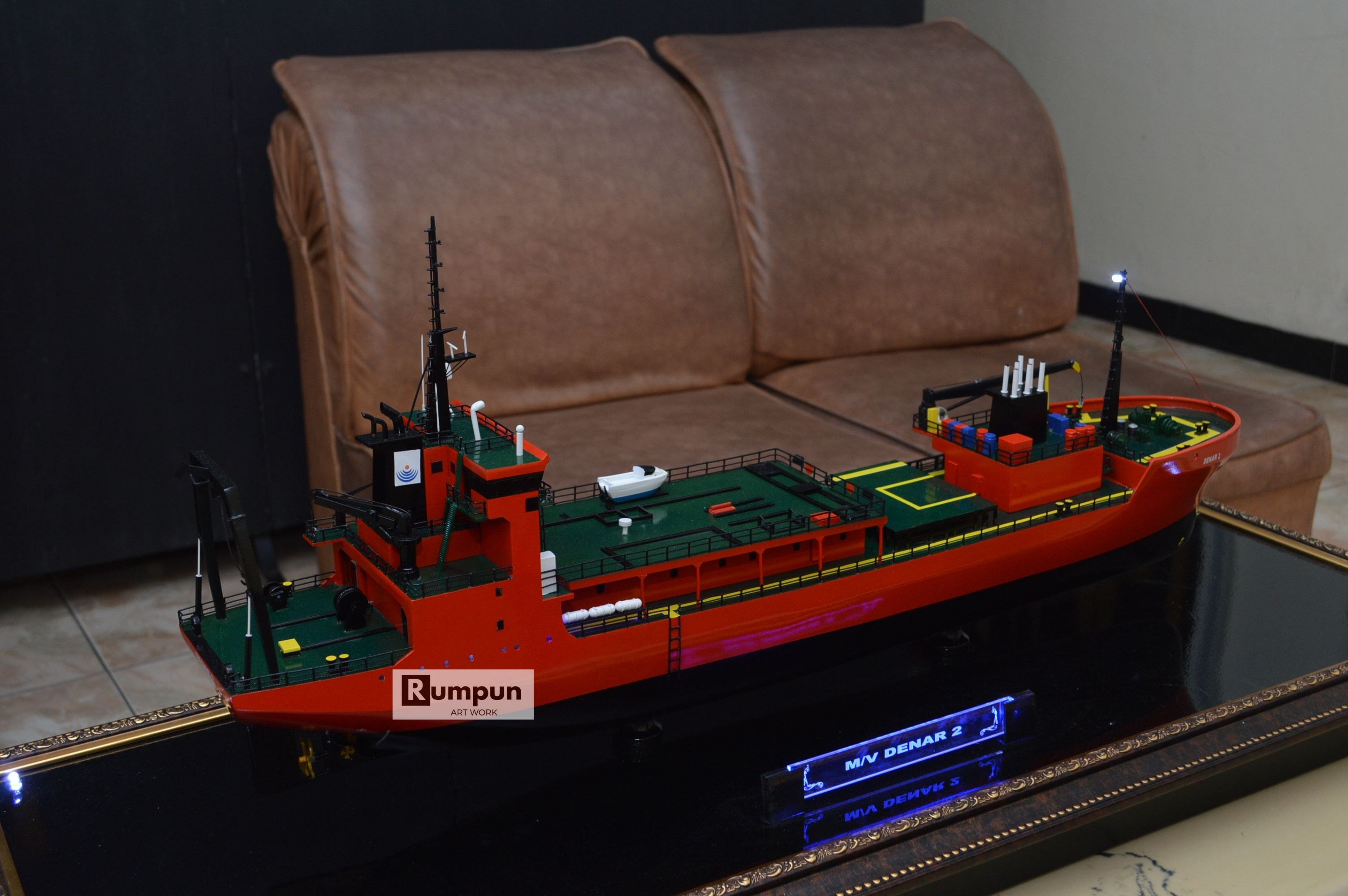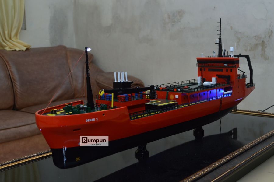 - Miniatur Kapal Survey MV Denar 2 ini berbahan dasar fiber, acrylic, resin, artificial part, kayu sebagai tatakan serta dilengkapi pencahayaan dengan lampu led ( optional ), kemudian kami bingkai dengan etalase kaca ( optional ).