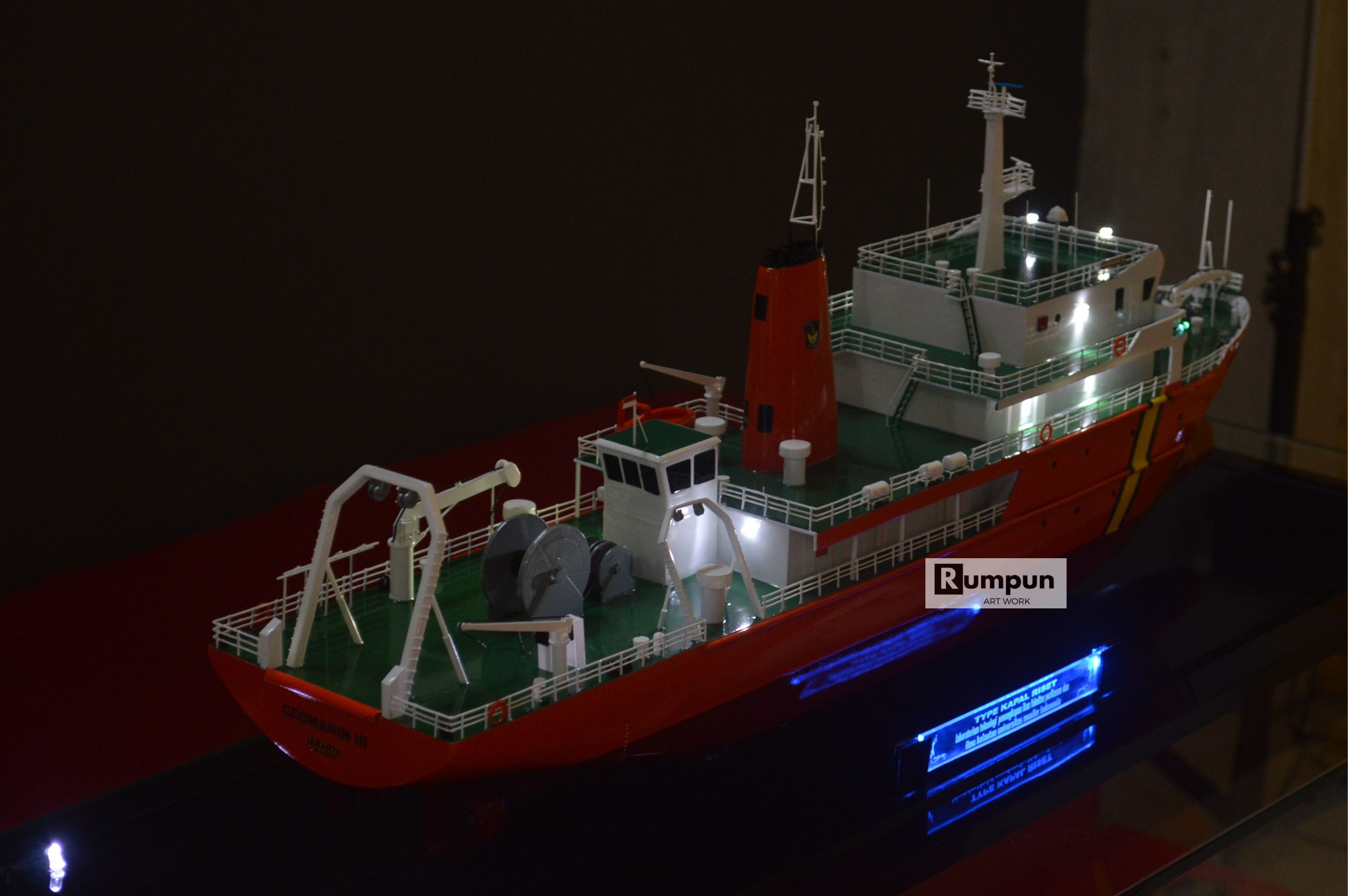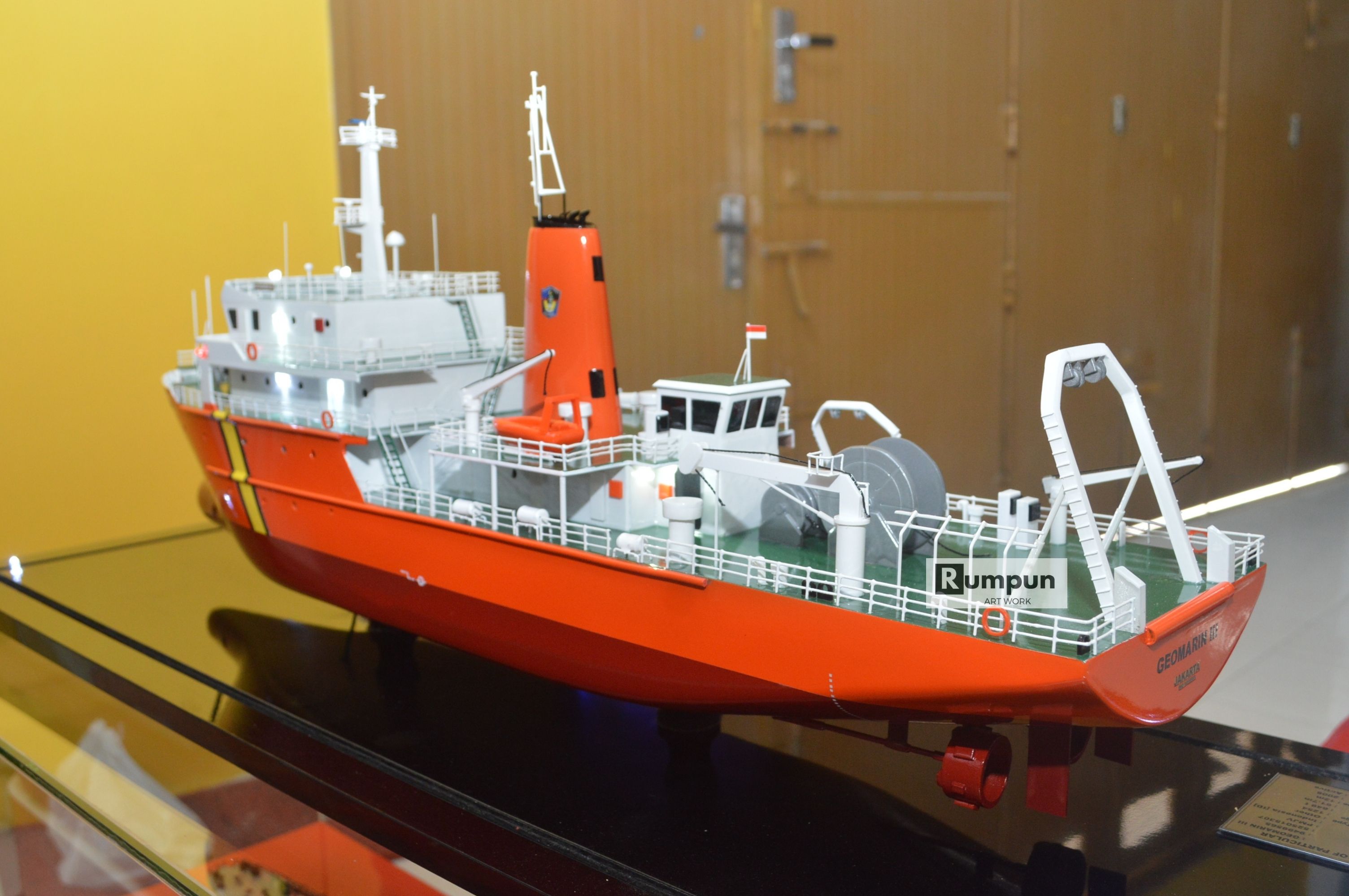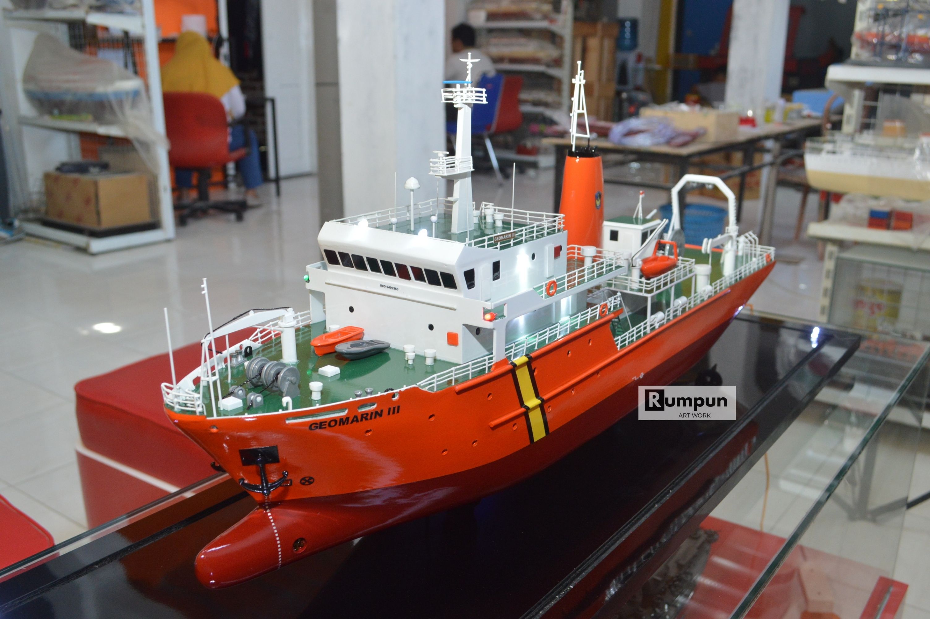 - Miniatur Kapal Survey Geomarin III ini berbahan dasar fiber, acrylic, resin, artificial part, kayu sebagai tatakan serta dilengkapi pencahayaan dengan lampu led ( optional ), kemudian kami bingkai dengan etalase kaca ( optional ).