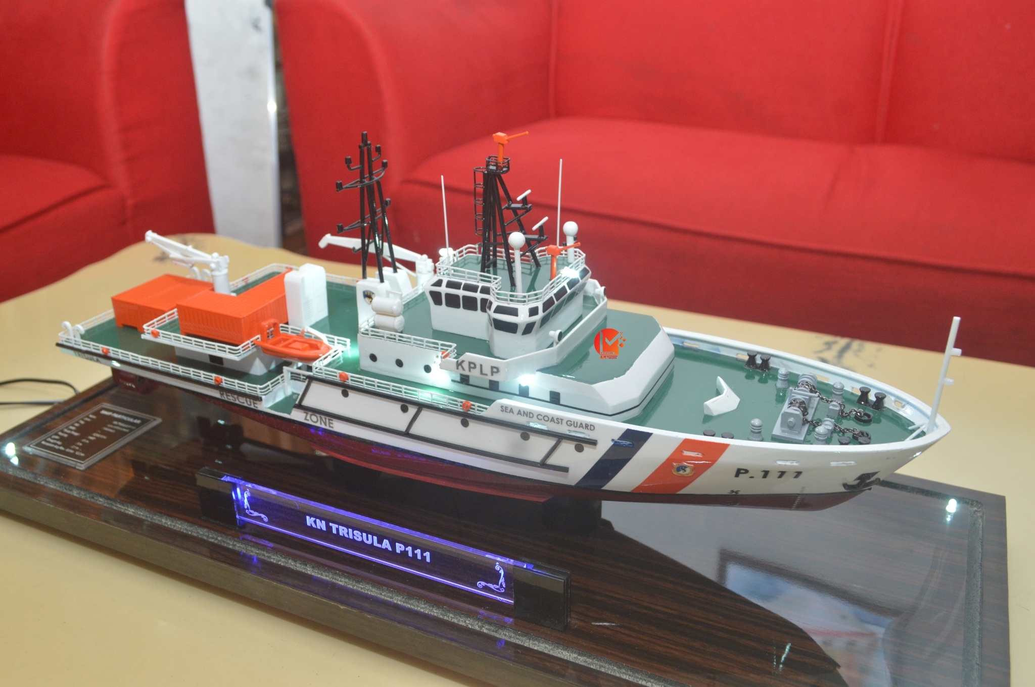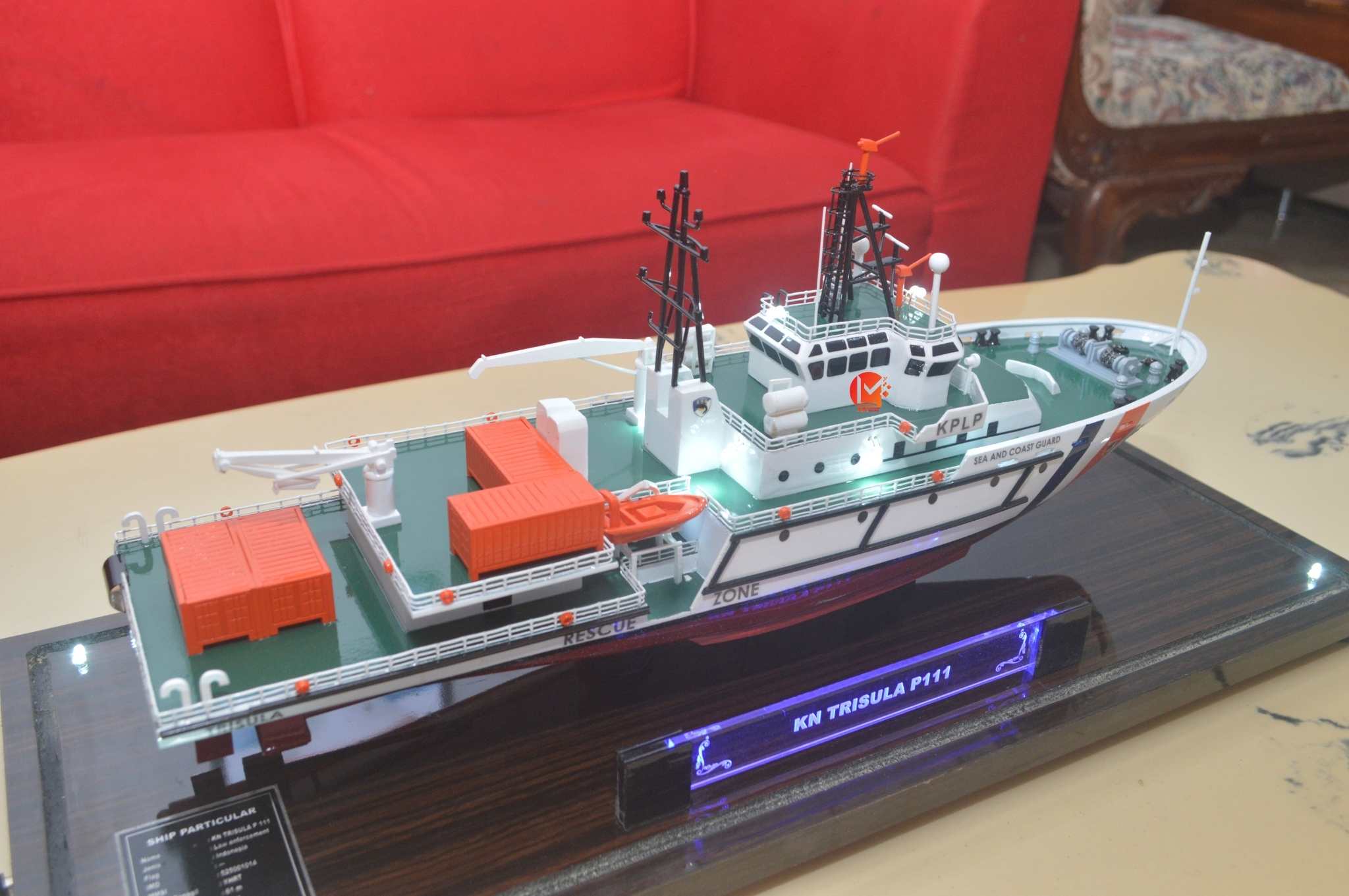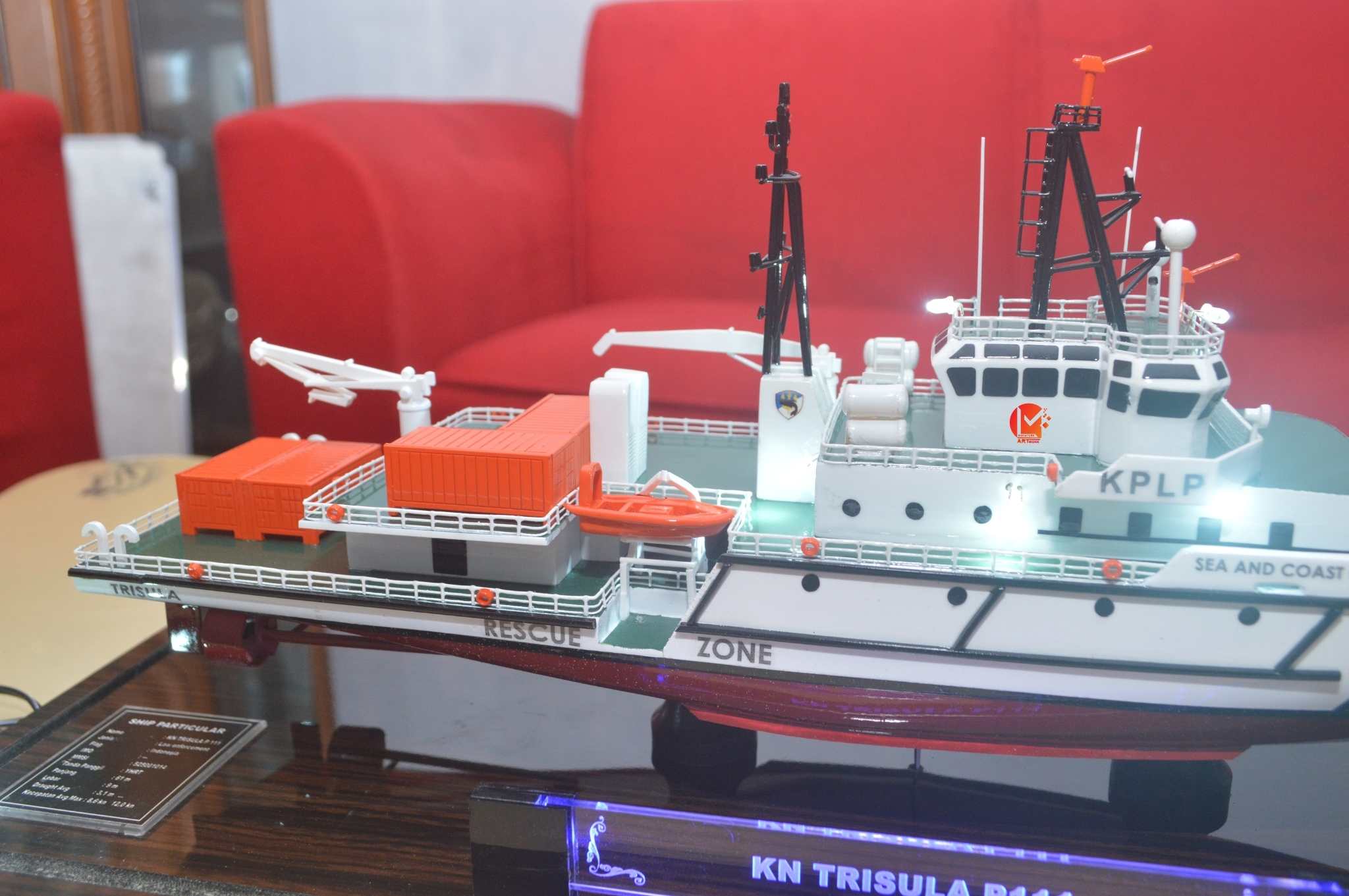 - Miniatur Kapal Survey KN Trisula P-111 ini berbahan dasar fiber, acrylic, resin, artificial part, kayu sebagai tatakan serta dilengkapi pencahayaan dengan lampu led ( optional ),