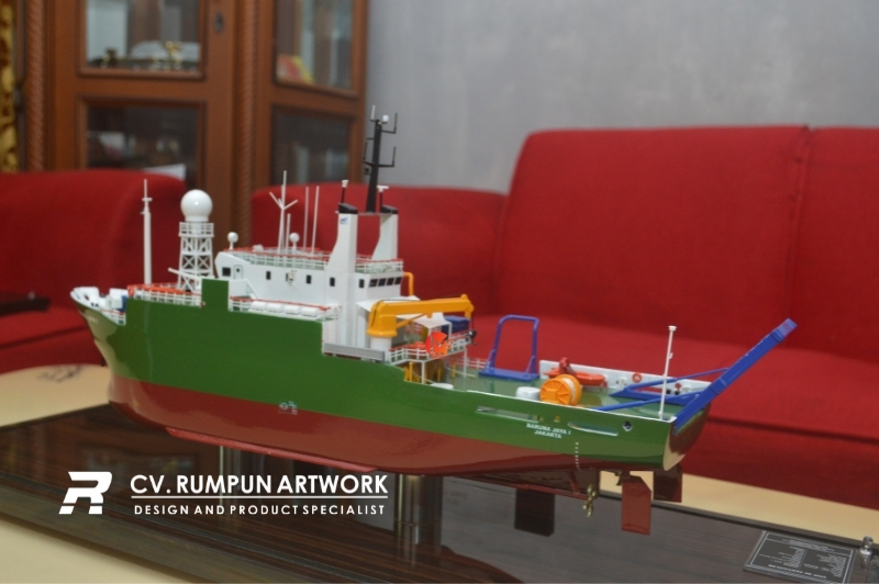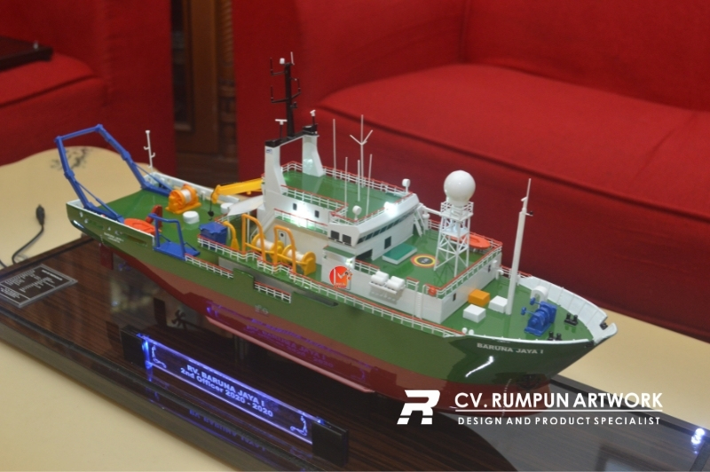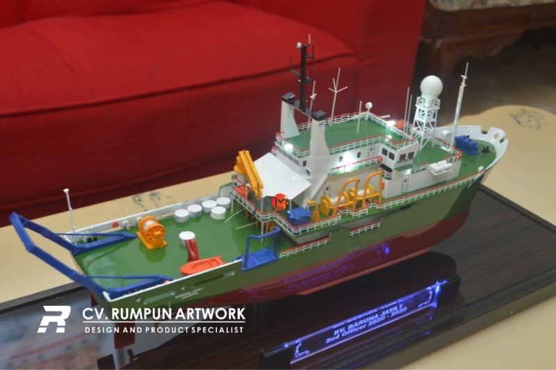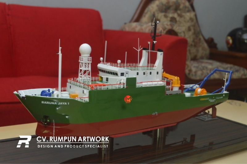 - Miniatur Kapal Survey RV Baruna Jaya I ini berbahan dasar fiber, acrylic, resin, artificial part, kayu sebagai tatakan serta dilengkapi pencahayaan dengan lampu led ( optional ), kemudian kami bingkai dengan etalase kaca ( optional )