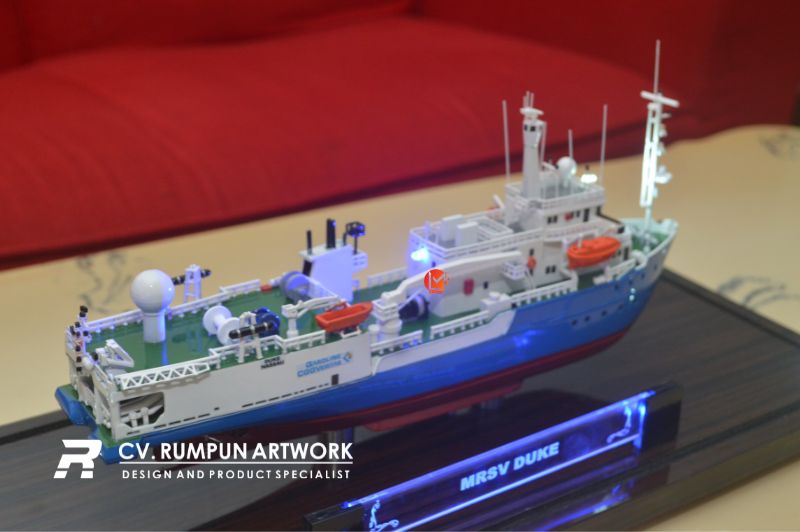- Miniatur Kapal Survey MRSV Duke ini berbahan dasar fiber, acrylic, resin, artificial part, kayu sebagai tatakan serta dilengkapi pencahayaan dengan lampu led ( optional ), kemudian kami bingkai dengan etalase kaca ( optional )