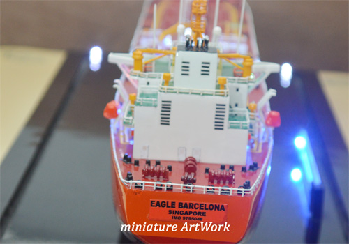 - Miniatur kapal Tanker Eagle Barcelona ini berbahan dasar fiber, acrylic, resin, artificial part, kayu sebagai tatakan serta dilengkapi pencahayaan dengan lampu led ( optional ),