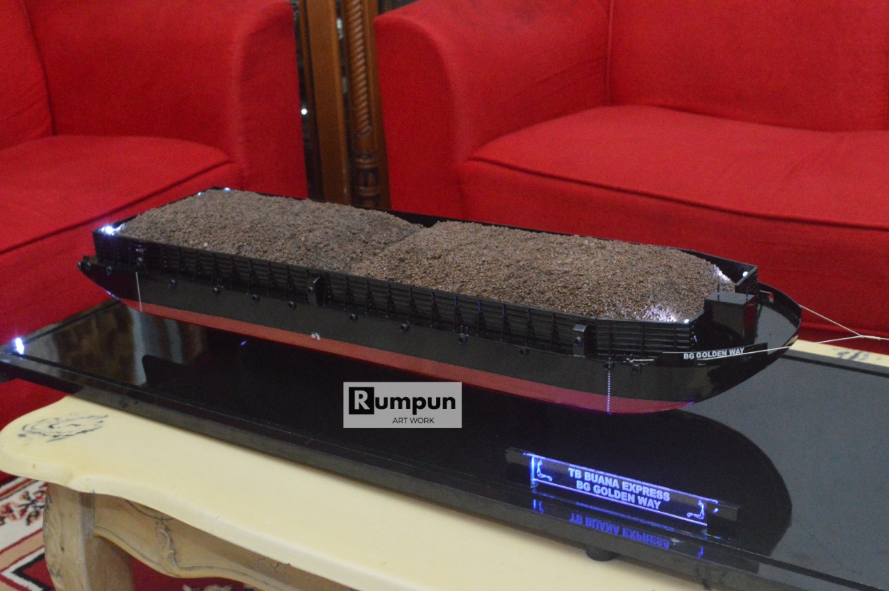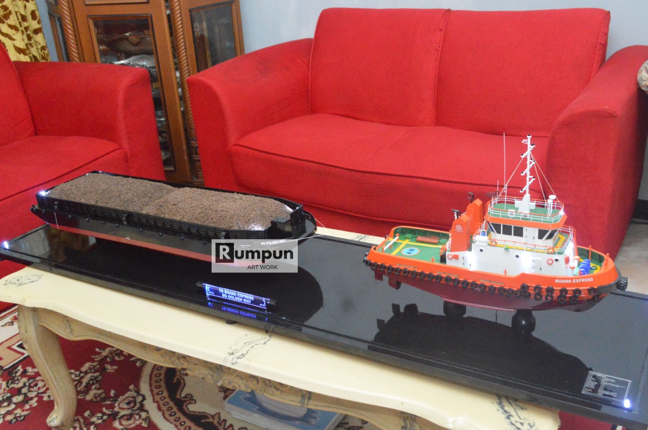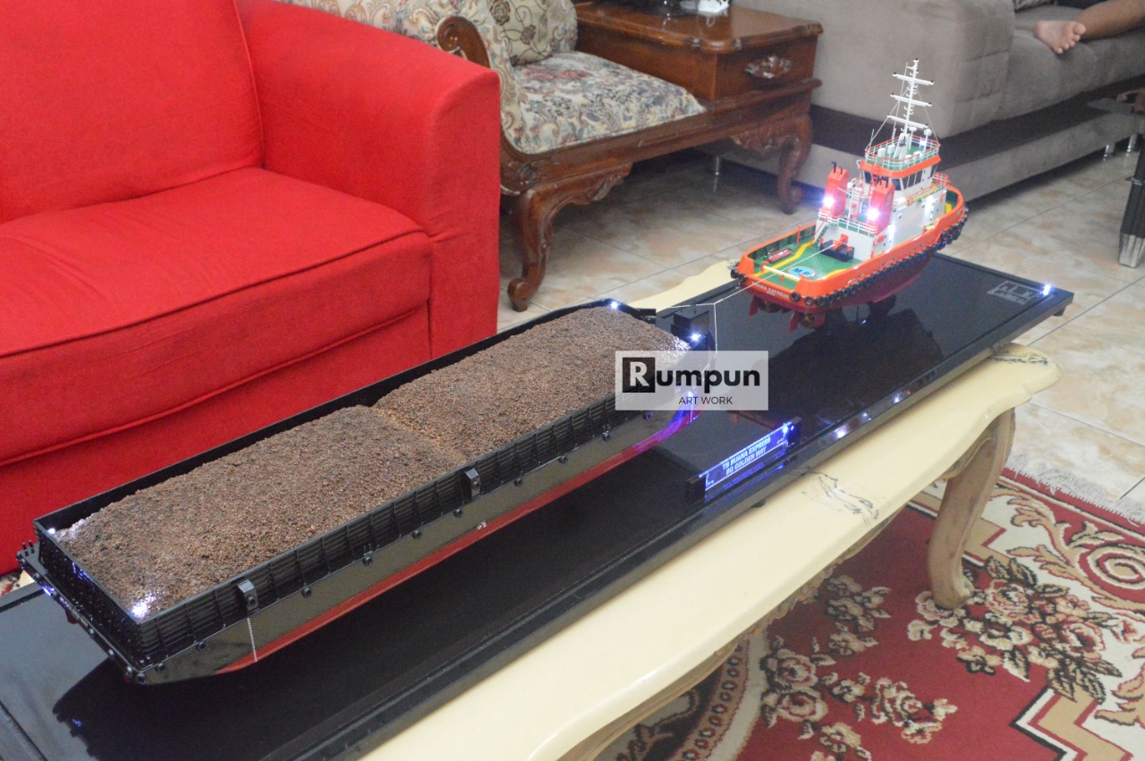 • Miniatur kapal tongkang dan tug boat ini berbahan dasar fiber, acrylic, resin, artificial part, kayu sebagai tatakan serta dilengkapi pencahayaan