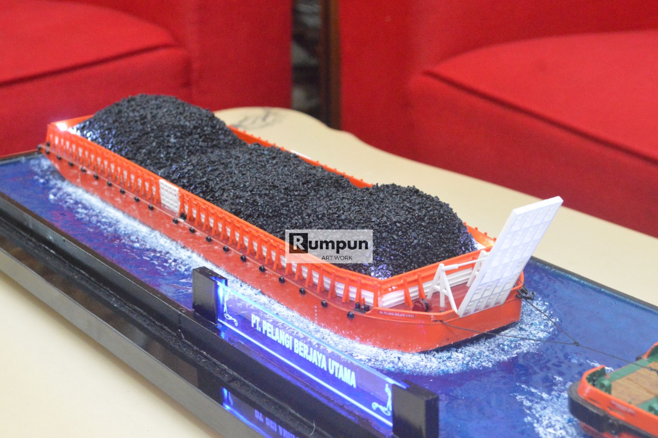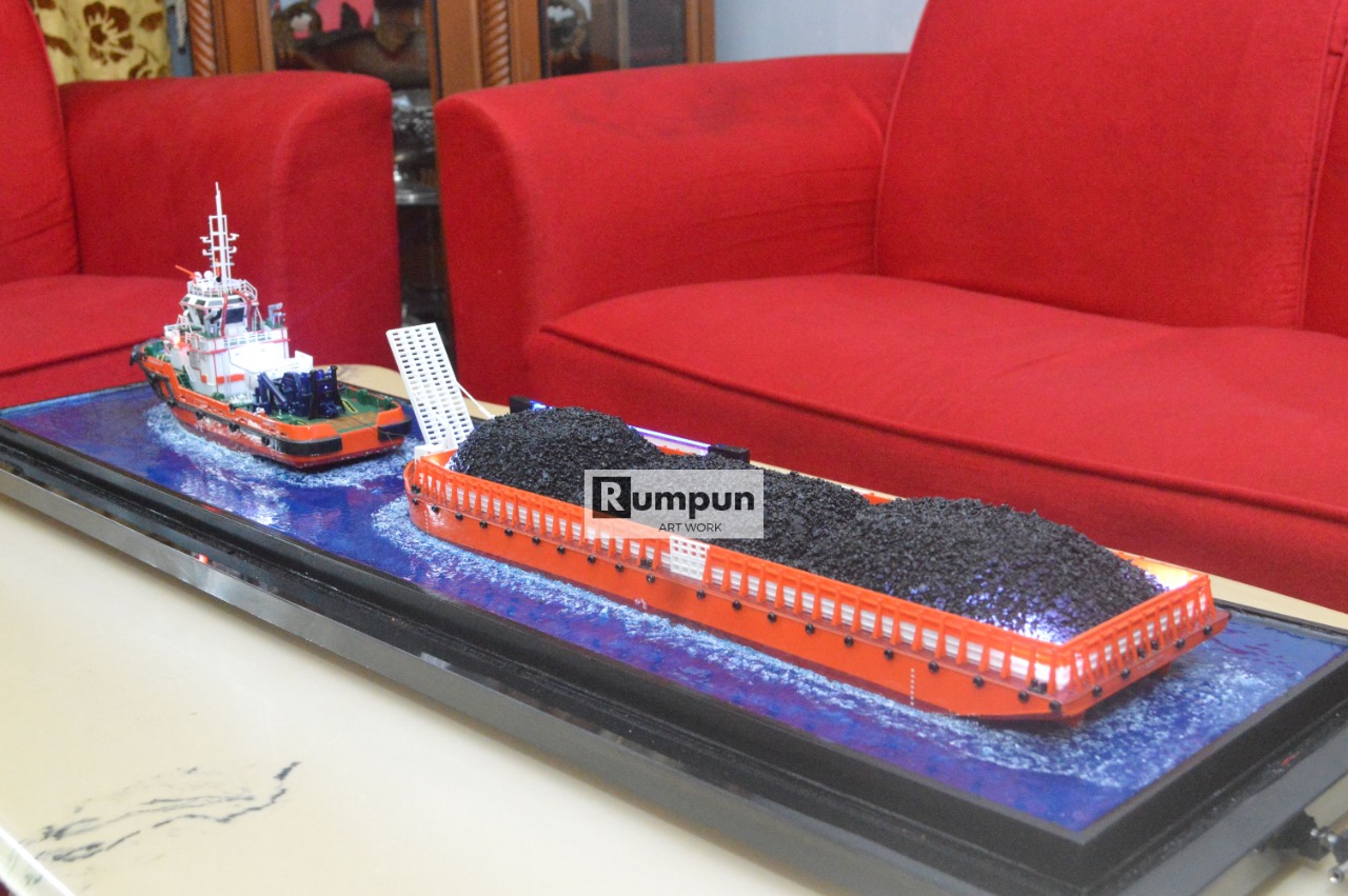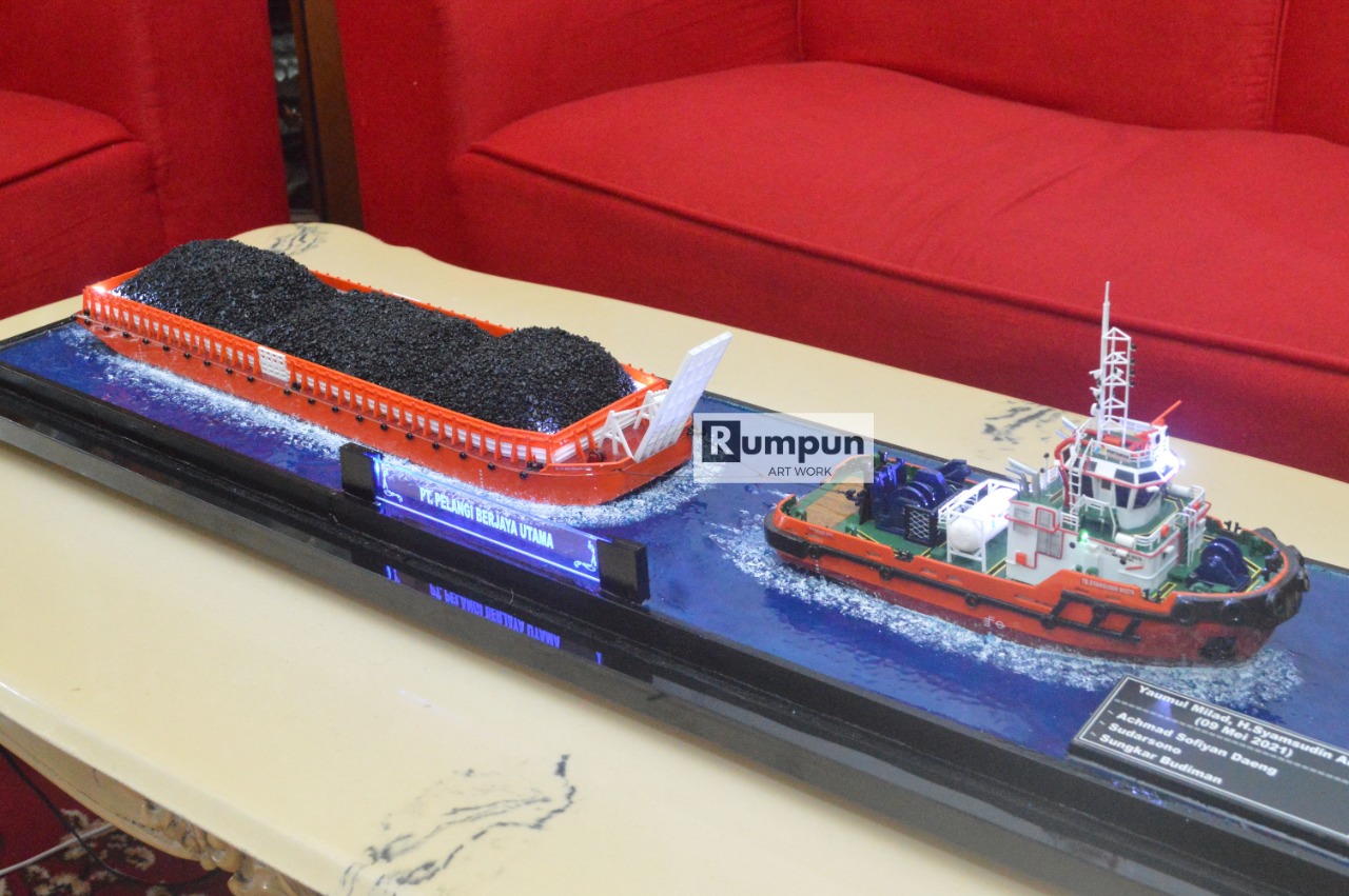 - Miniatur kapal tongkang dan tug boat ini berbahan dasar fiber, acrylic, resin, artificial part, kayu sebagai tatakan serta dilengkapi pencahayaan