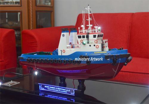 - Miniatur kapal tugboat Azarakhsh ini berbahan dasar fiber, acrylic, resin, artificial part, kayu sebagai tatakan serta dilengkapi pencahayaan dengan lampu led ( optional ), kemudian kami bingkai dengan etalase kaca ( optional )