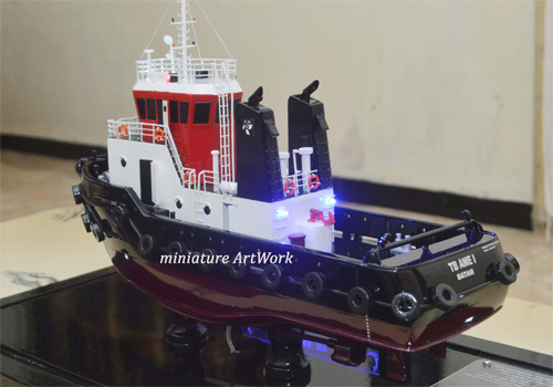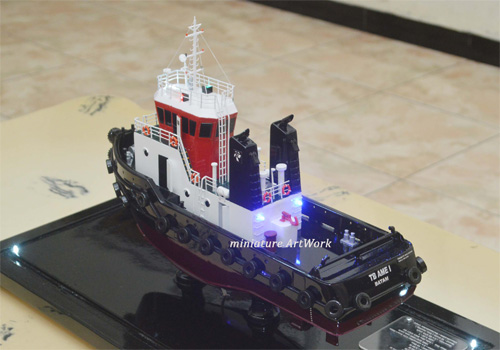 - Miniatur kapal tugboat TB Ame ini berbahan dasar fiber, acrylic, resin, artificial part, kayu sebagai tatakan serta dilengkapi pencahayaan dengan lampu led ( optional ), kemudian kami bingkai dengan etalase kaca ( optional )